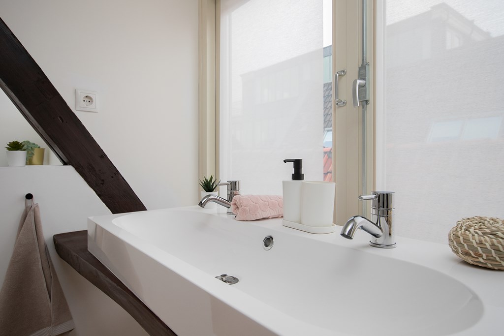 The athmosphere is a blend between modern style, luxury kitchen, spacious bathroom and the historical flavour of old, restored beams, orginal attic roof and beautiful wooden floor everywhere
