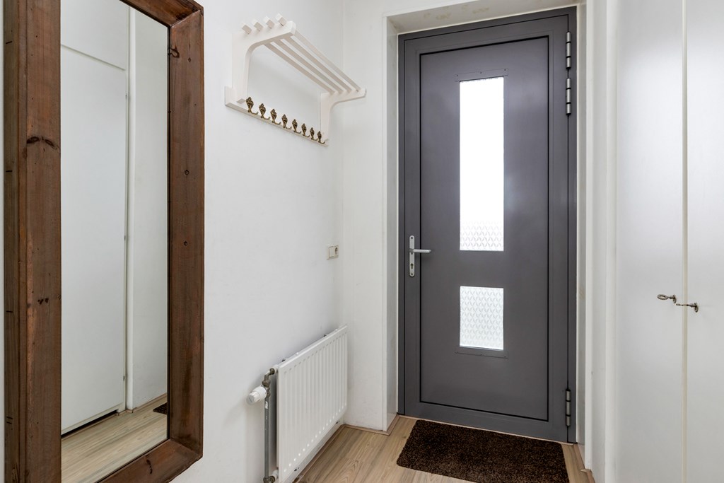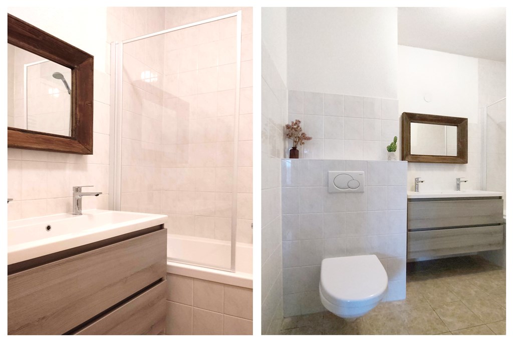 The bathroom is also accessible from the hall. It is spacious and features a wall-hung toilet, a beautiful double vanity, a designer radiator, and a bathtub.