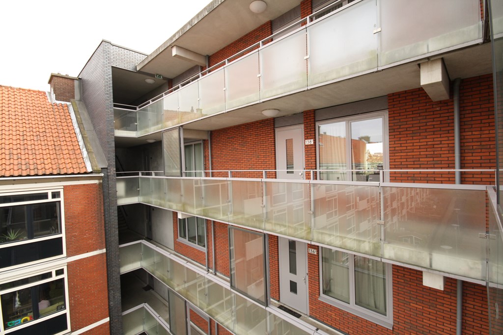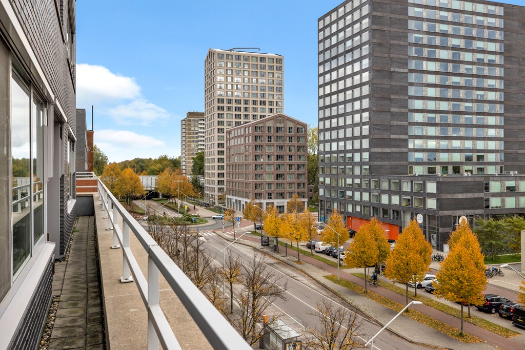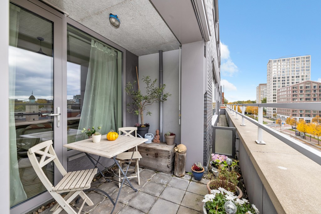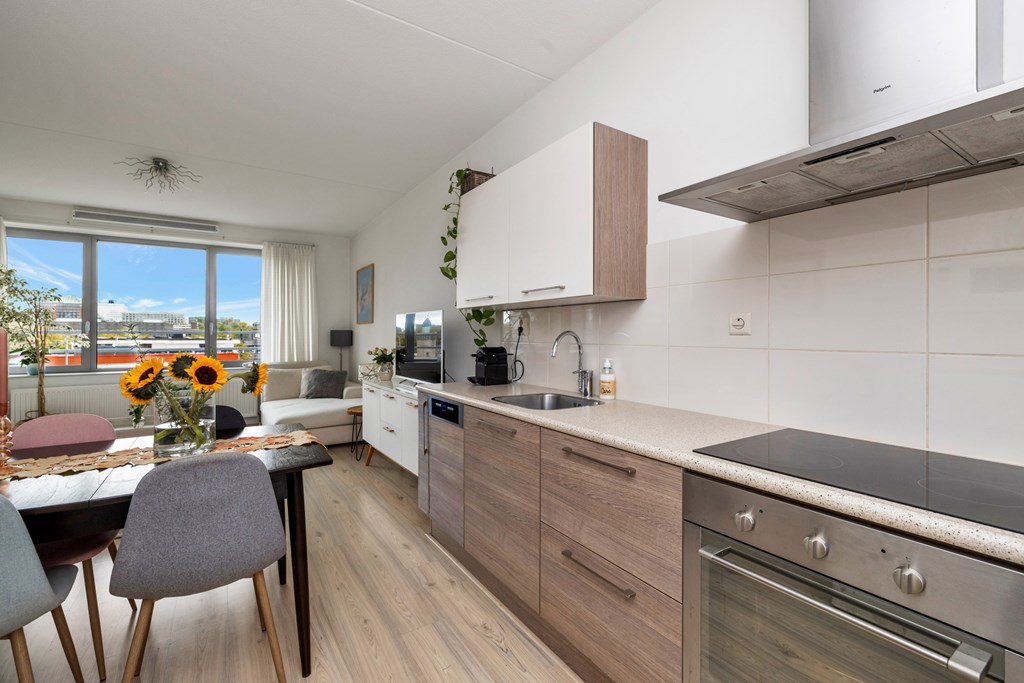 The apartment has bright finishes. It features an open-plan kitchen with various appliances, including an oven, ceramic hob, and dishwasher. There's also a built-in refrigerator and ample cupboard space. The balcony is accessible from both the living room and the bedroom, offering unobstructed views of the surrounding area.
