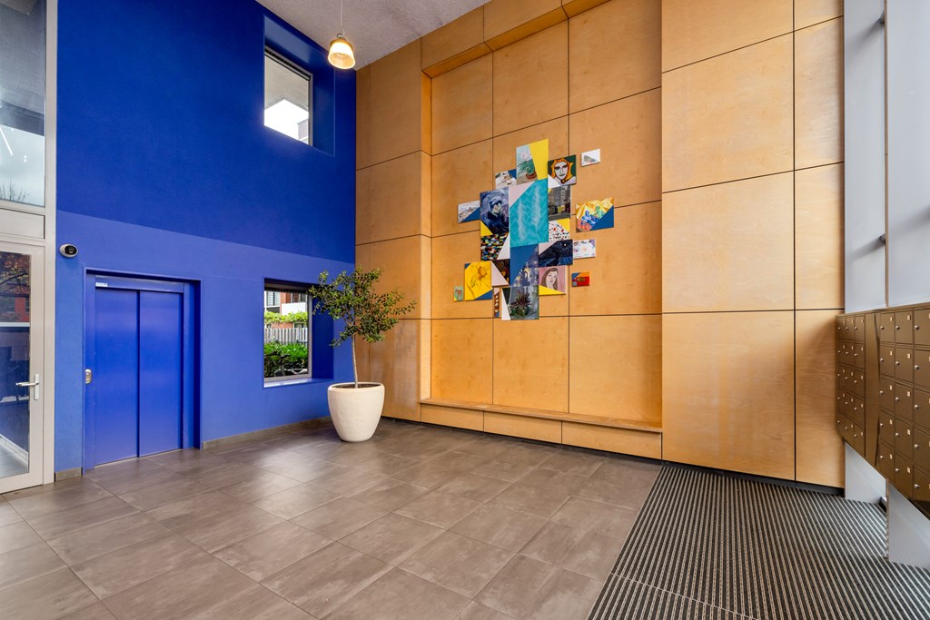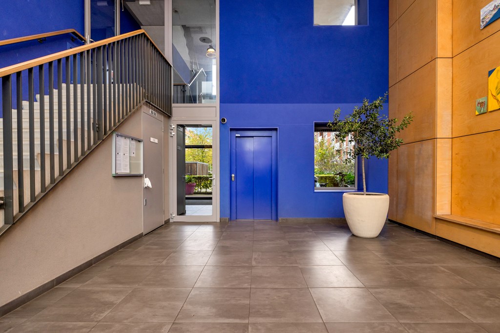 Upon entering the complex, you'll be welcomed by a spacious reception hall with a high ceiling. The elevator takes you to the fourth floor. A small gallery at the rear provides access to the apartment.