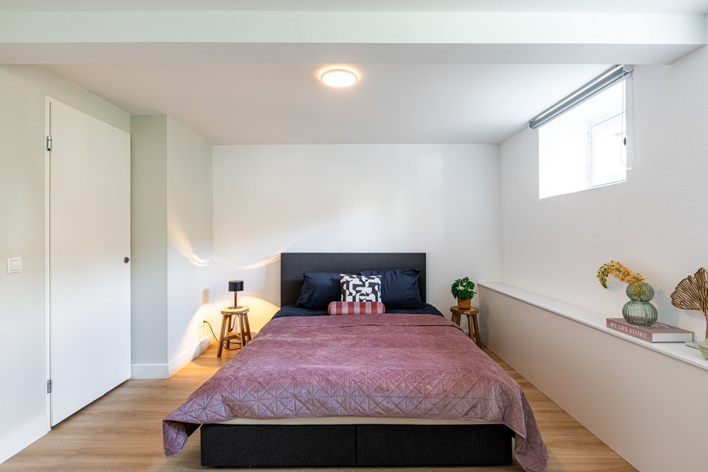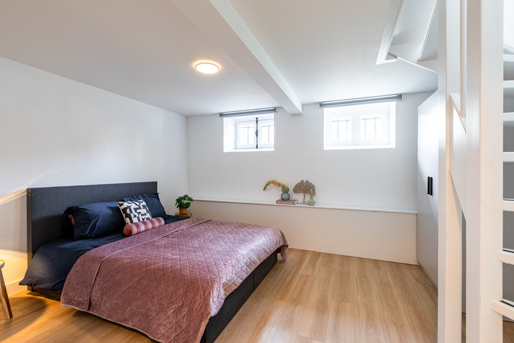 The bathroom has shower and washbasin and toilet. At the basement of the apartment is the bedroom with a double bed and a wardrobe.