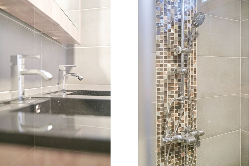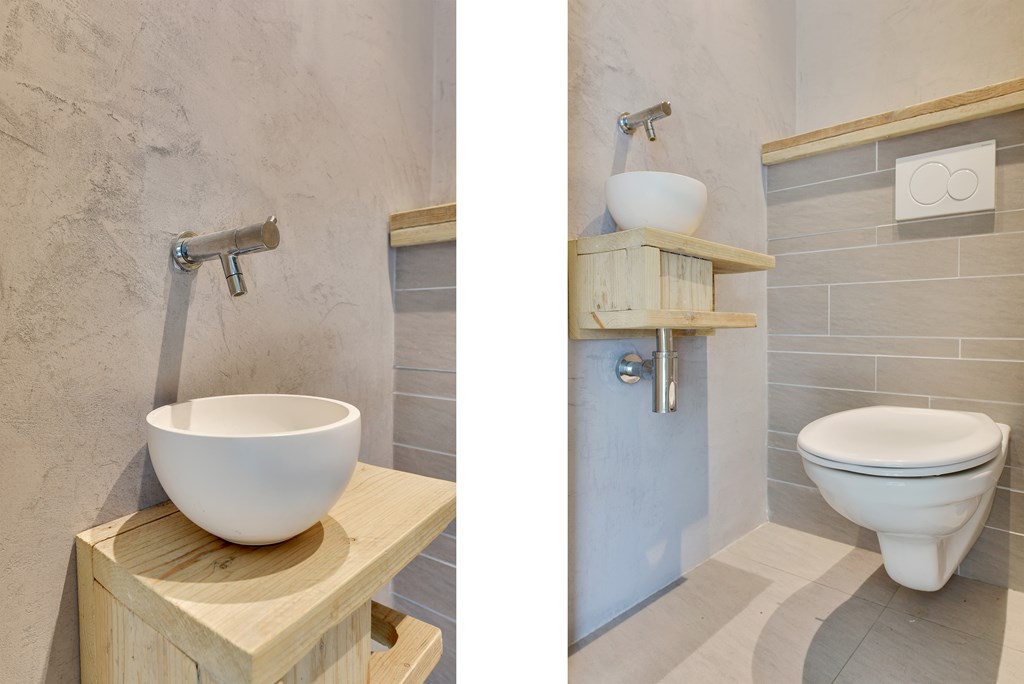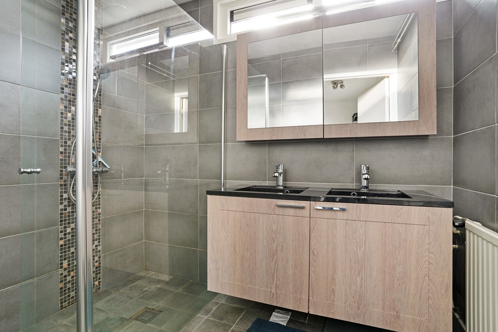 From the hallway you have access to a separate toilet with hanging wash basin. From the hallway you also have access to the modern fully tiled bathroom with spacious walk-in shower, double washbasin in washbasin and design radiator.