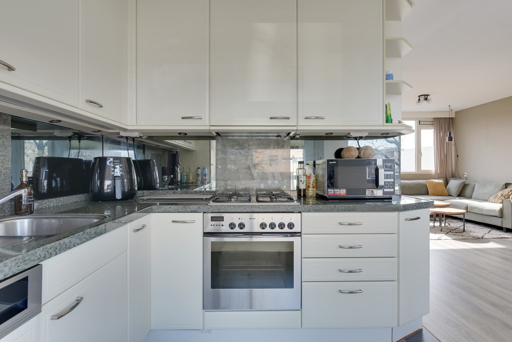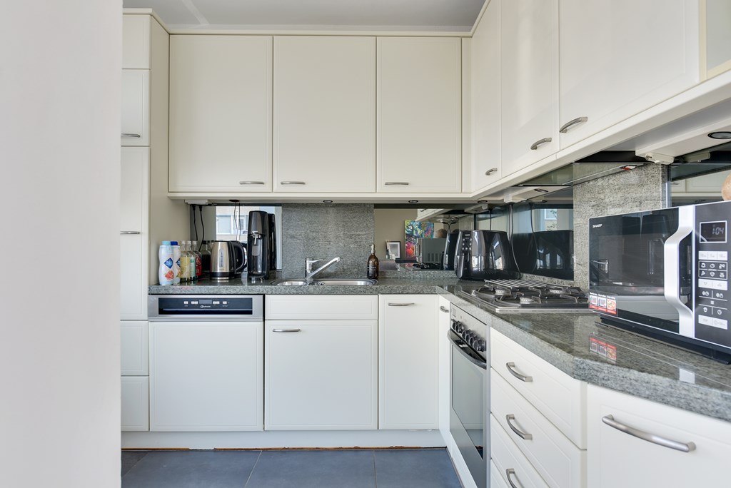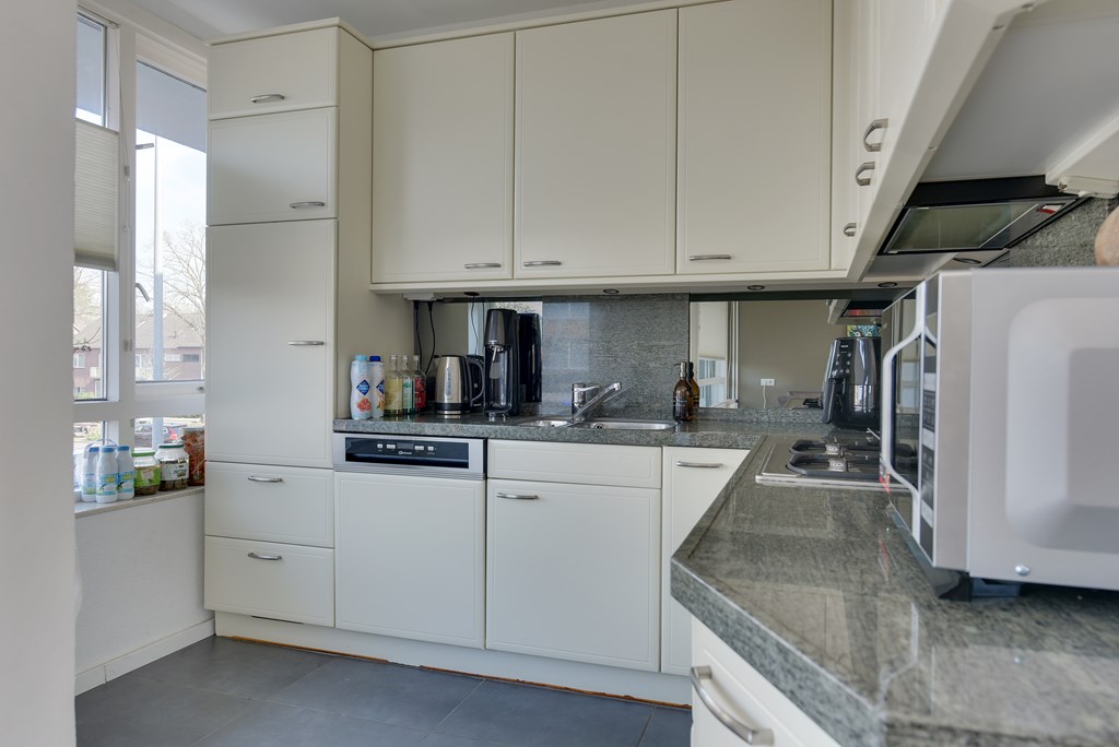 The open kitchen is located at the front of the apartment. The corner kitchen is equipped with an oven, 4-burner gas hob, extractor hood, fridge-freezer and a dishwasher. The kitchen has a neat, timeless look.