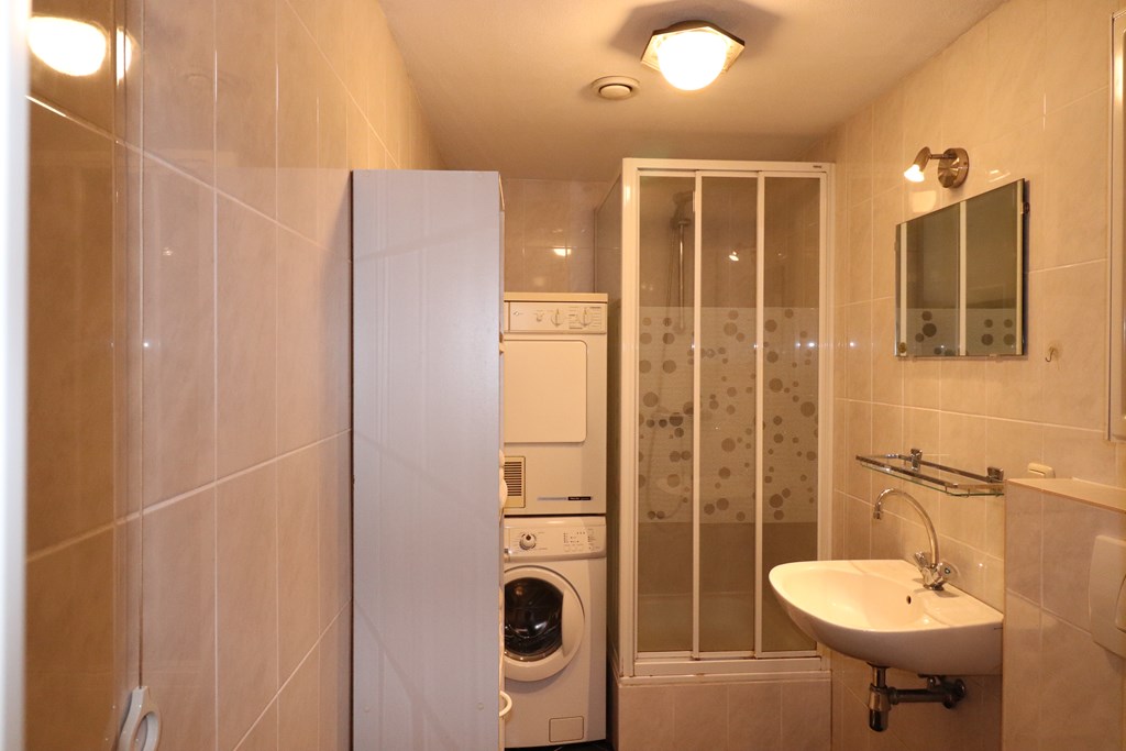 The bathroom has a washbasin with fountain, shower, toilet, washing machine and dryer. The surface of the bathroom is 3 m².