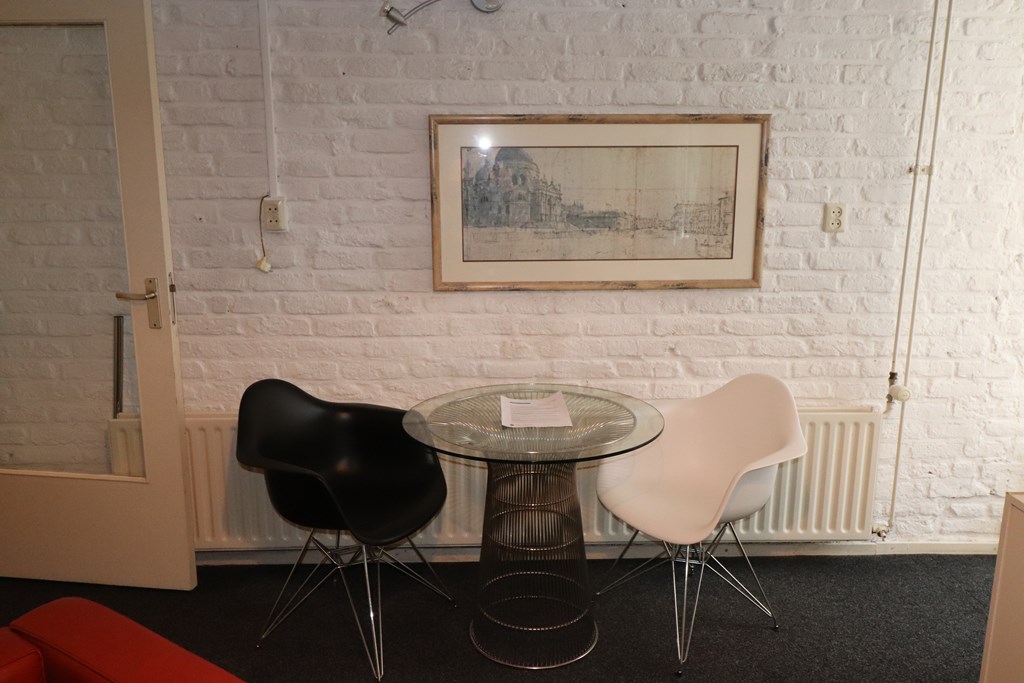 The living room has an area of 17 m2 and is located on the ground floor at the rear of a listed building. It is a beautiful light living room. The furniture consists of a 2-seater sofa, 2 armchairs, coffee table, television, 1 floor lamp, dining table with 2 chairs and a side table.