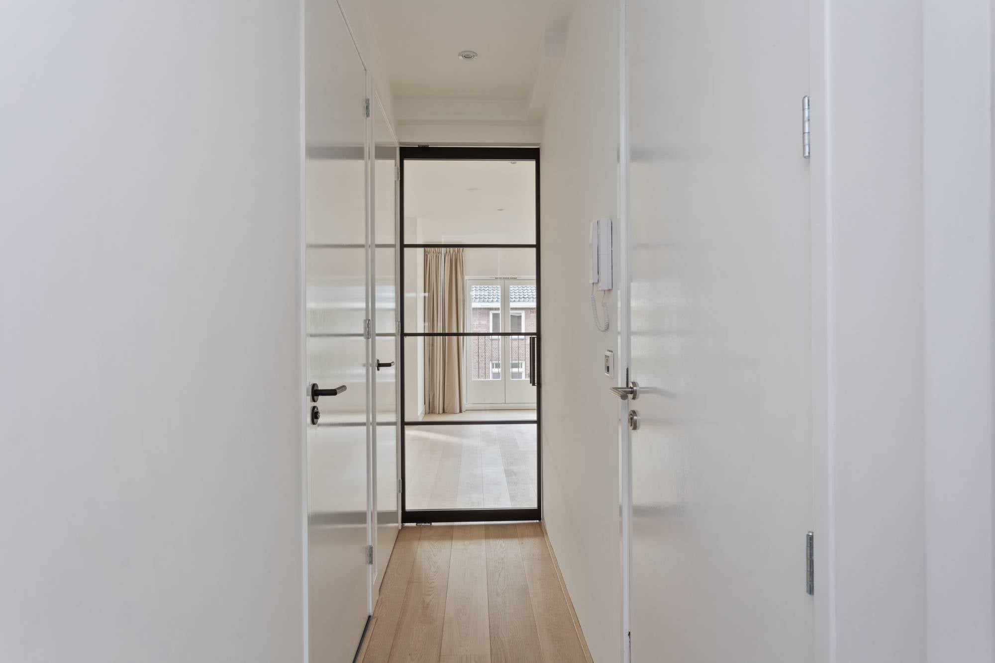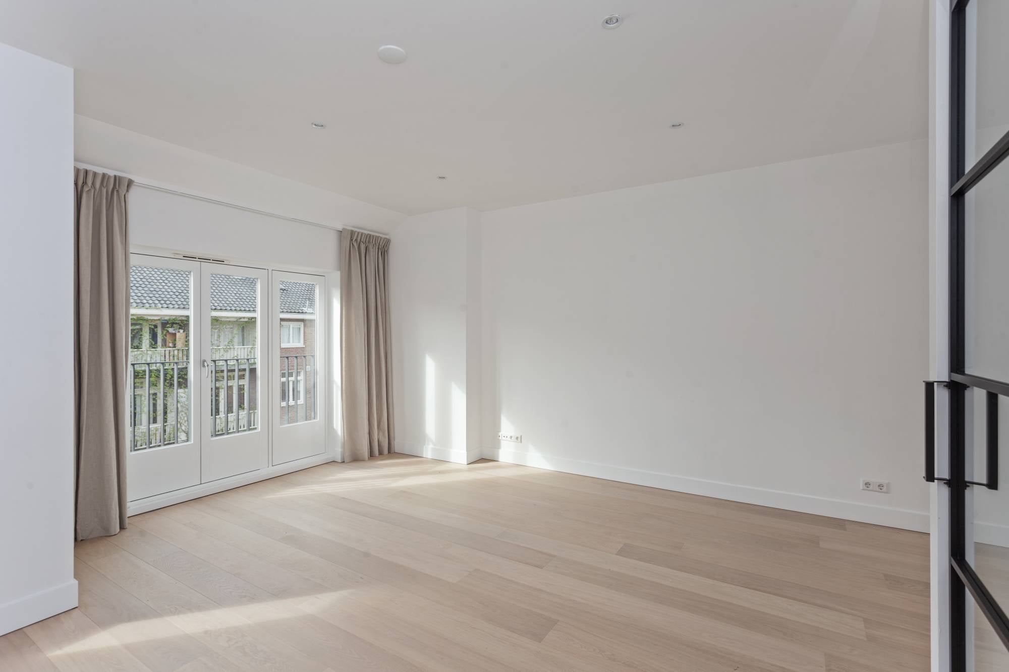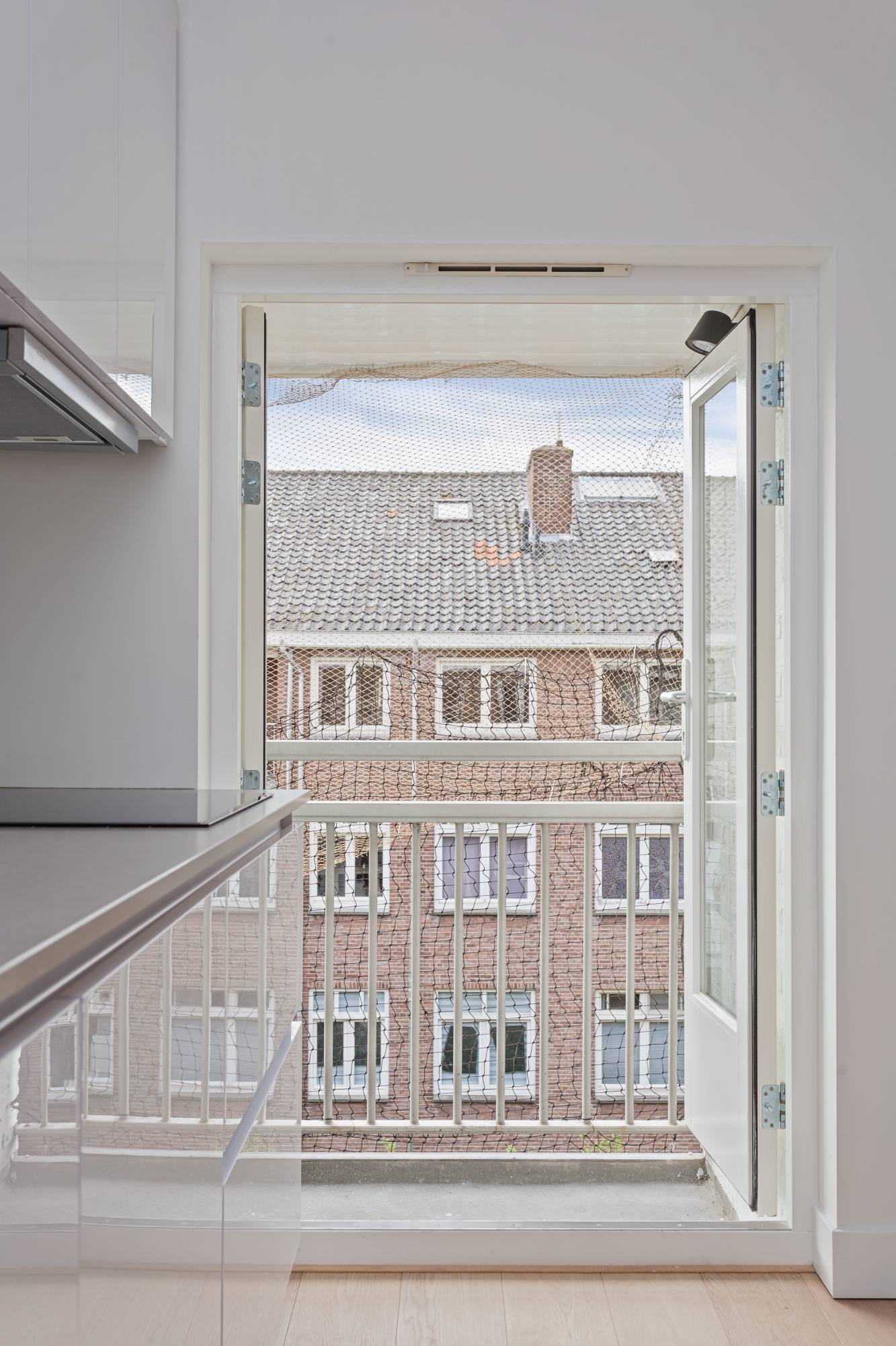 Through the renovated stairwell you reach the entrance to the apartment on the fourth floor. The hall gives access to the rooms with at the rear a beautiful, bright living room with luxury open kitchen and a French balcony which is facing south. The kitchen is equipped with all amenities such as a dishwasher, refrigerator with freezer, oven/microwave combination and induction hob with extractor. There is also a small balcony facing south. At the front you will find the spacious bedroom with ensuite bathroom. This modern open bathroom has a wide washbasin cabinet with 2 drawers, a radiator and a walk-in shower.