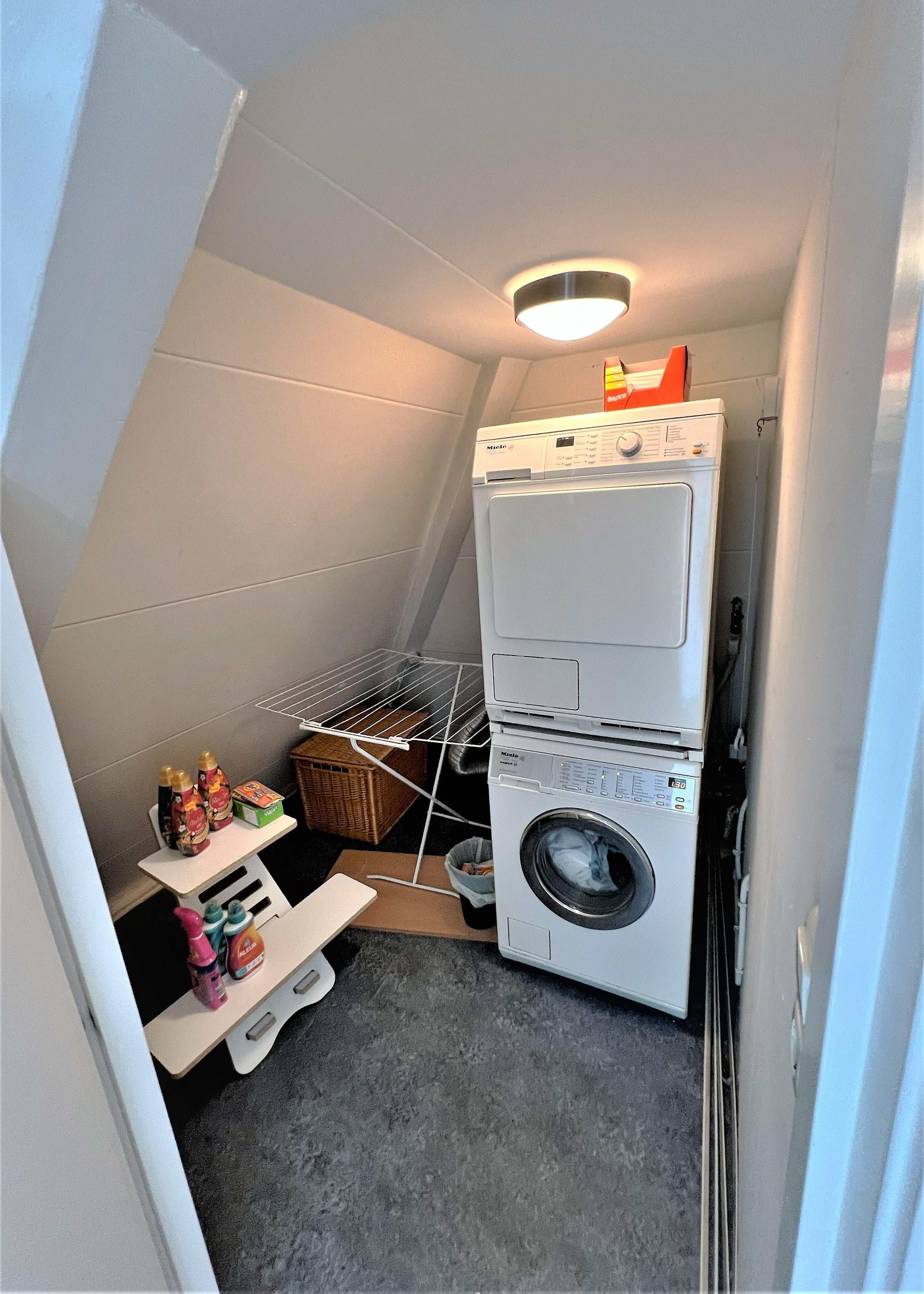 The bathroom on this floor is generously sized and equipped with a bathtub, walk-in shower, sink and a second toilet. In a separate spacious closet is the washer and dryer setup.