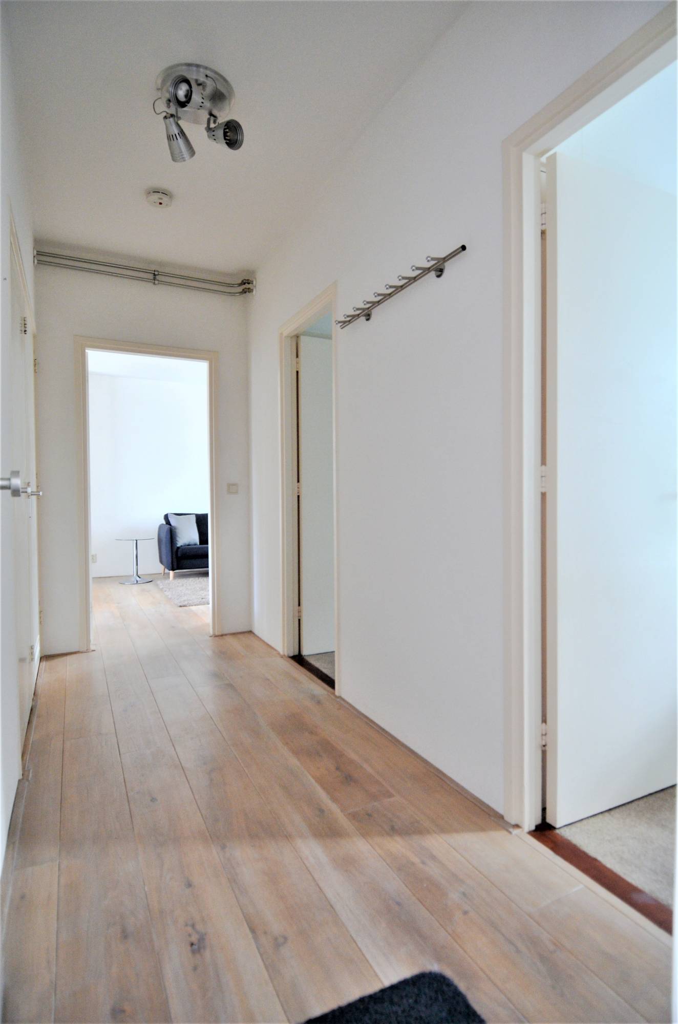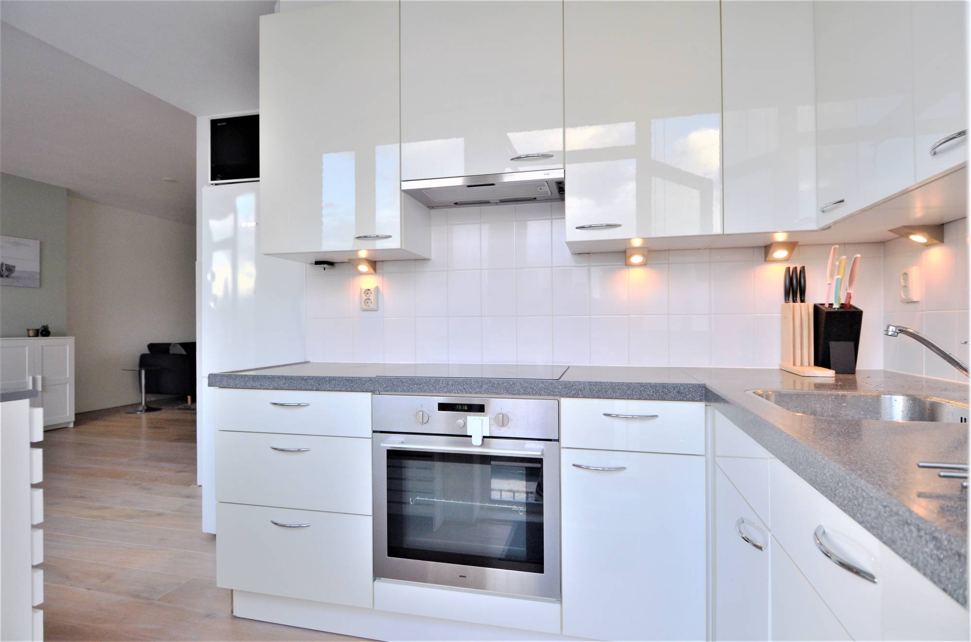 The entire apartment has elegant oak flooring.