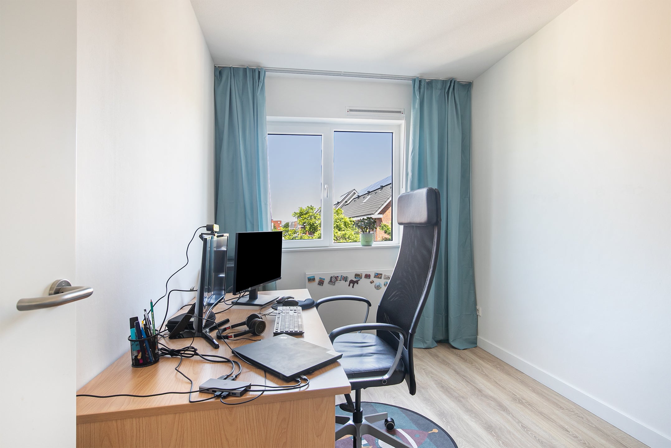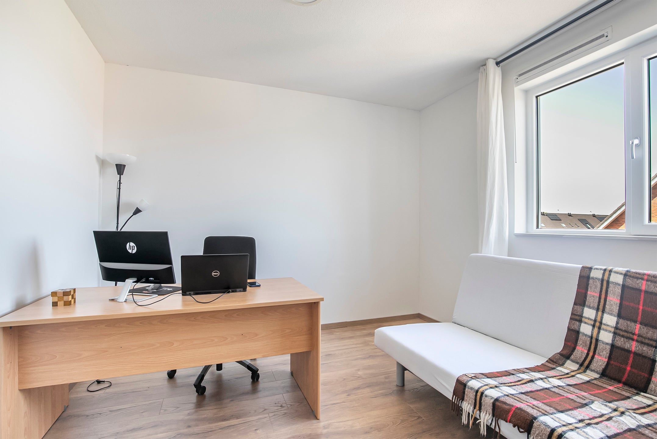 Via the stairs in the living room access to 3 bedrooms, 1 bedroom has a French balcony. The two large bedrooms of 14.17m2 and 20.43m2 are equipped with a double bed. The third small bedroom of 8.42m2 now serves as an office and is equipped with a desk