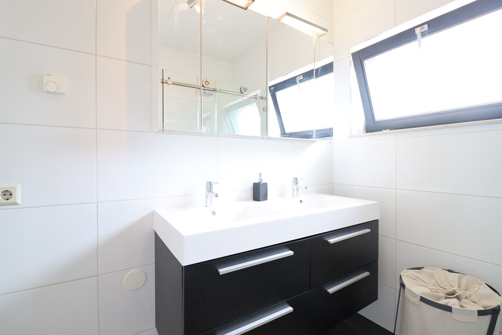 - Bathroom with shower, double sink and toilet