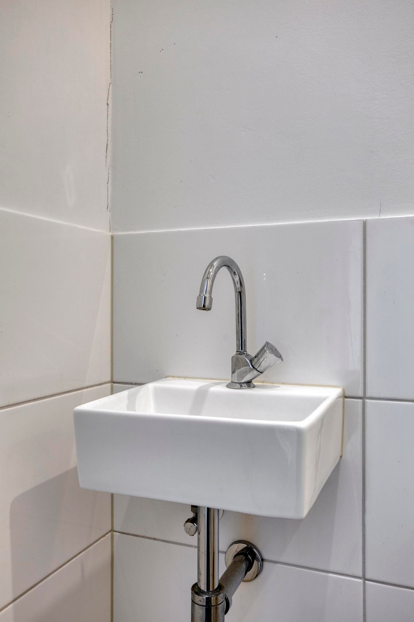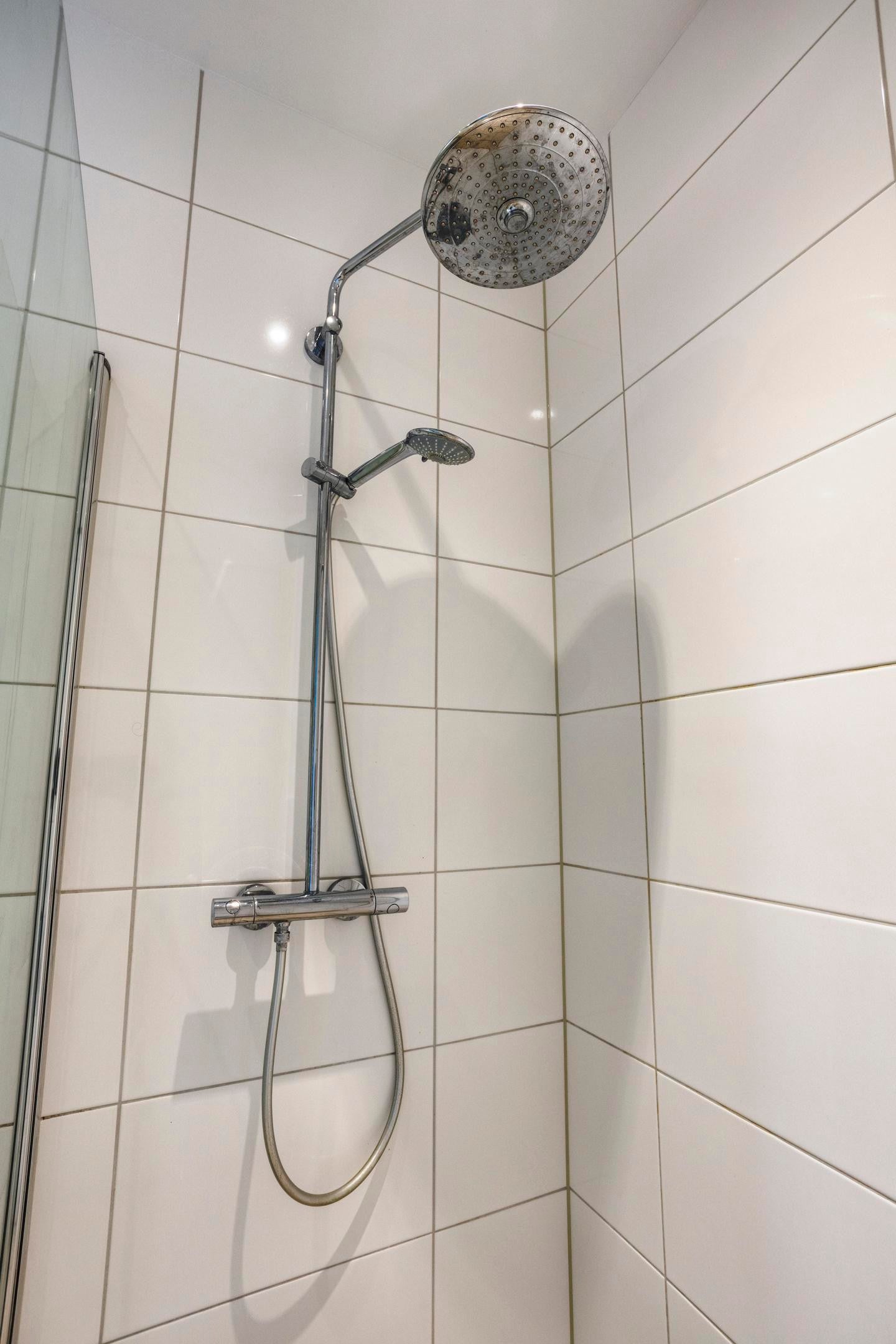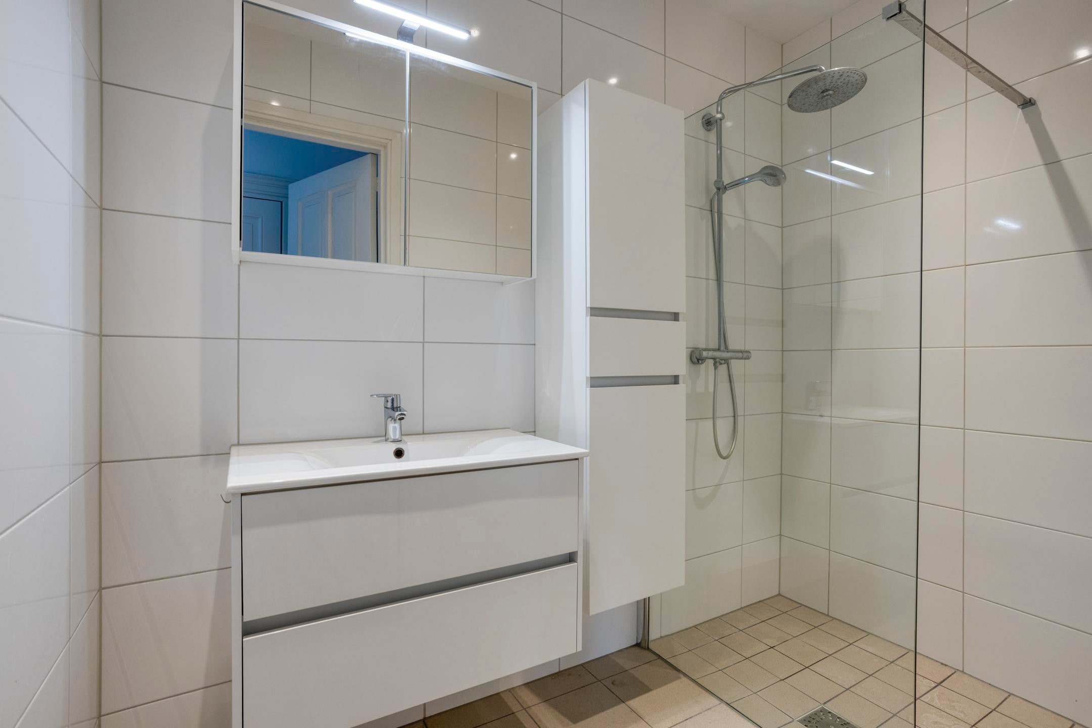 The bathroom is equipped with large walk-in shower, sink with two drawers, a mirror cabinet and an extra cabinet for towels. Next to the bathroom is a separate toilet.