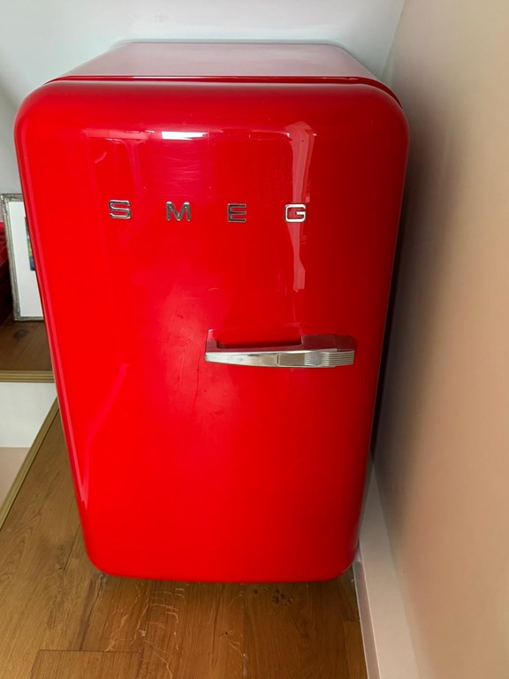 A large third bedroom with windows on both sides, plus a landing with laundry facilities, a washbasin with cabinet, and an extra SMEG fridge.
