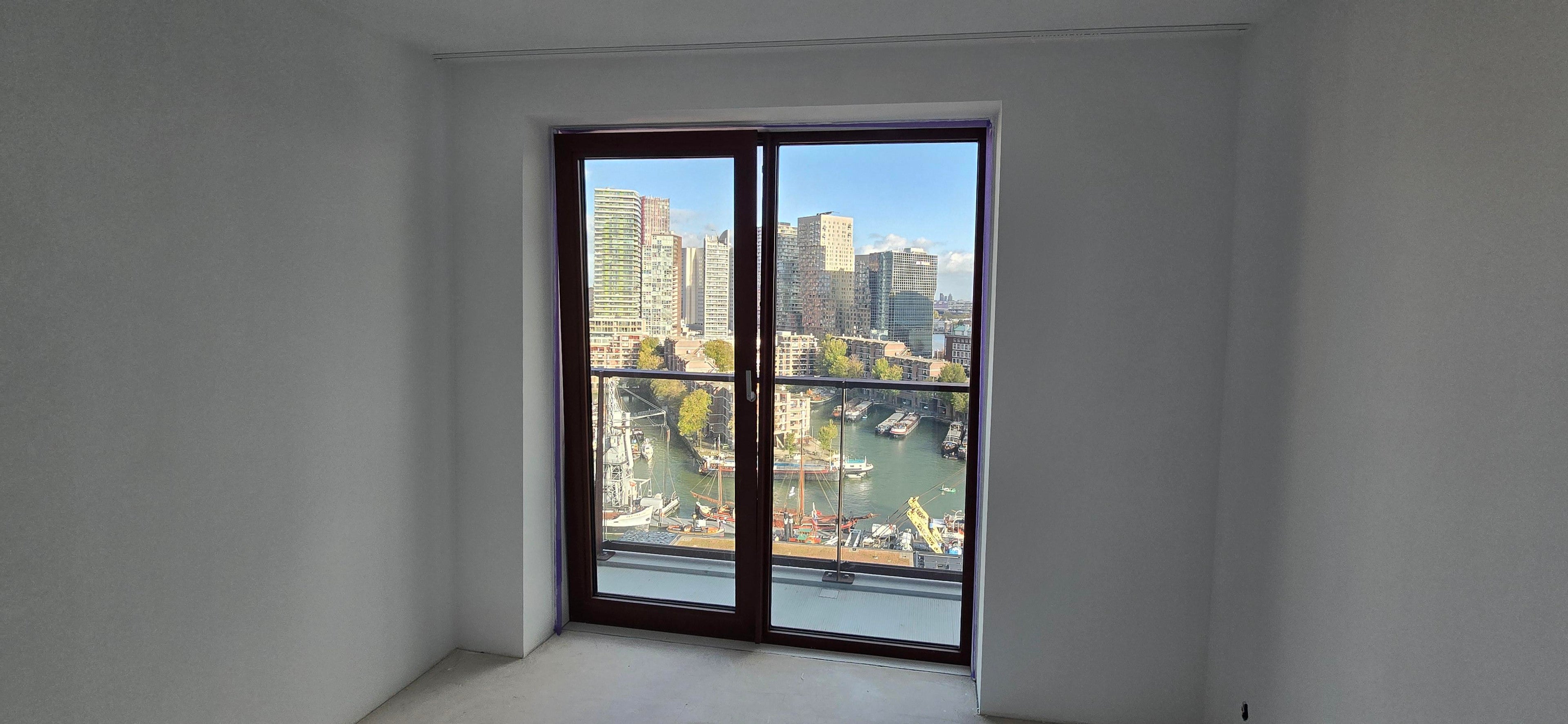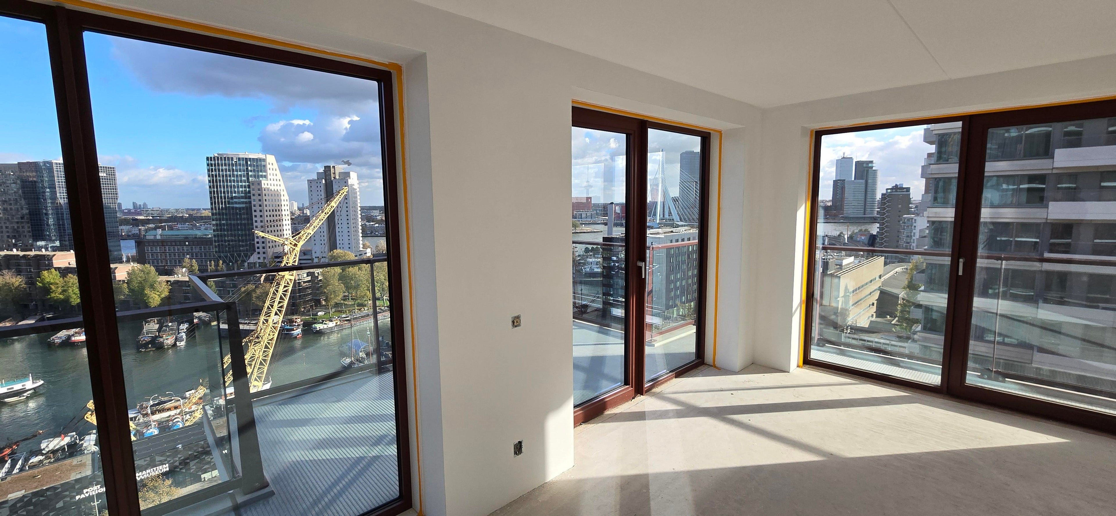 Living with the most beautiful view of Rotterdam and the Netherlands. From the 15th floor you have an unobstructed view over the Erasmus Bridge, the river Maas, the Leuvehaven, the Euromast and the skyline. Everything in this apartment is designed to maximize that premium view, with floor-to-ceiling windows and a continuous XL corner balcony. This completely newly completed 3-bedroom corner apartment in prestigious Downtown is first occupancy in Q4 2025; you will be the first occupant, with luxurious finishes and materials.