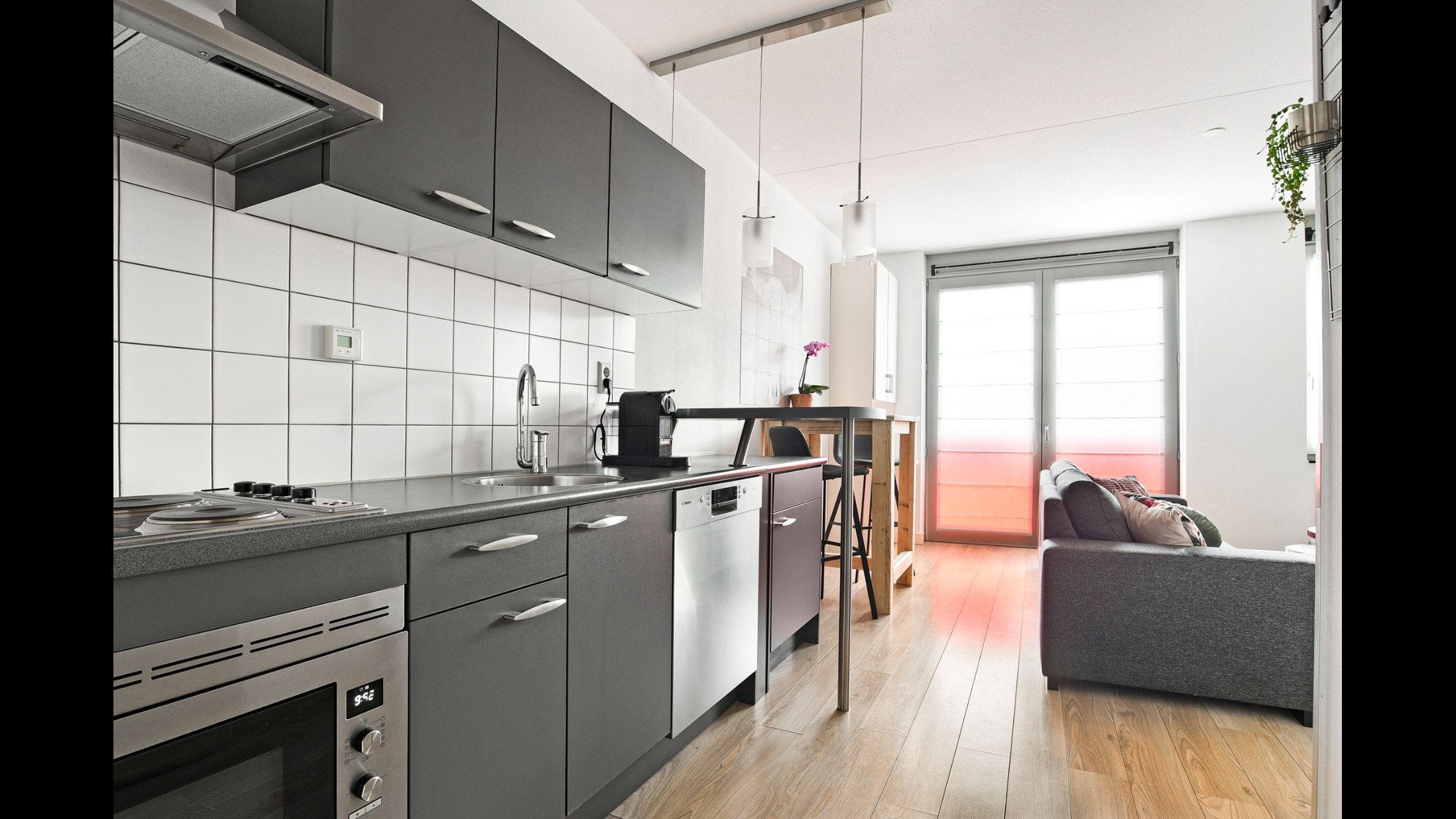 KitchenThe modern kitchen is fully equipped with an electric stove, extractor hood, combi microwave oven, refrigerator, freezer, and dishwasher. The dark cabinet fronts contrast beautifully with the light wall tiles, creating a clean and stylish look. Upper cabinets provide additional storage, and the space is efficiently designed for comfort and practicality.