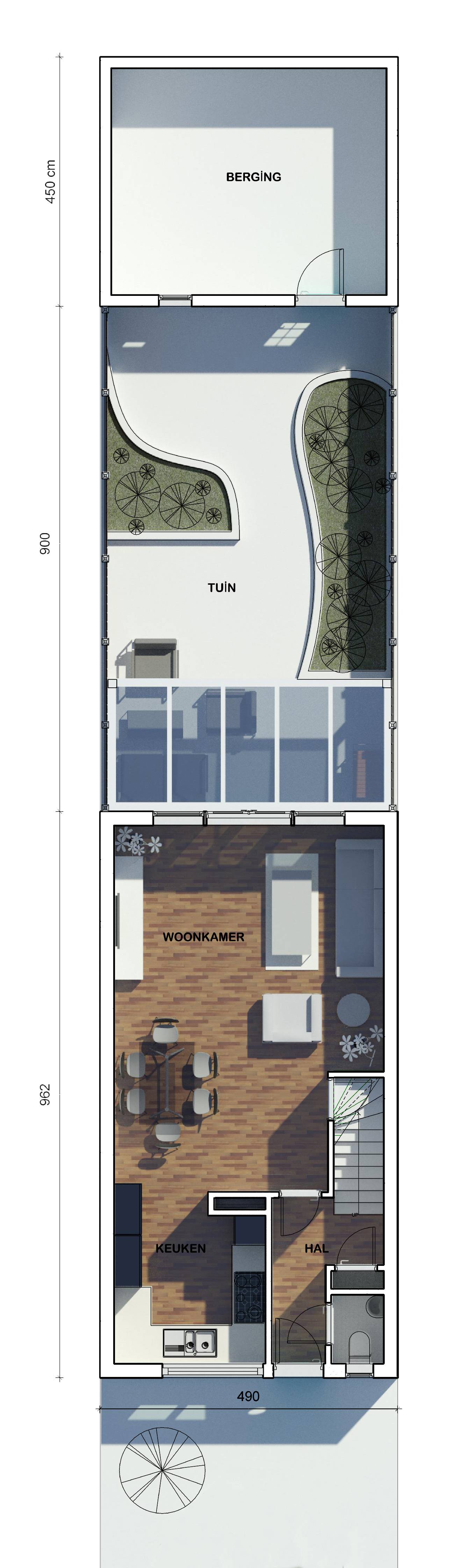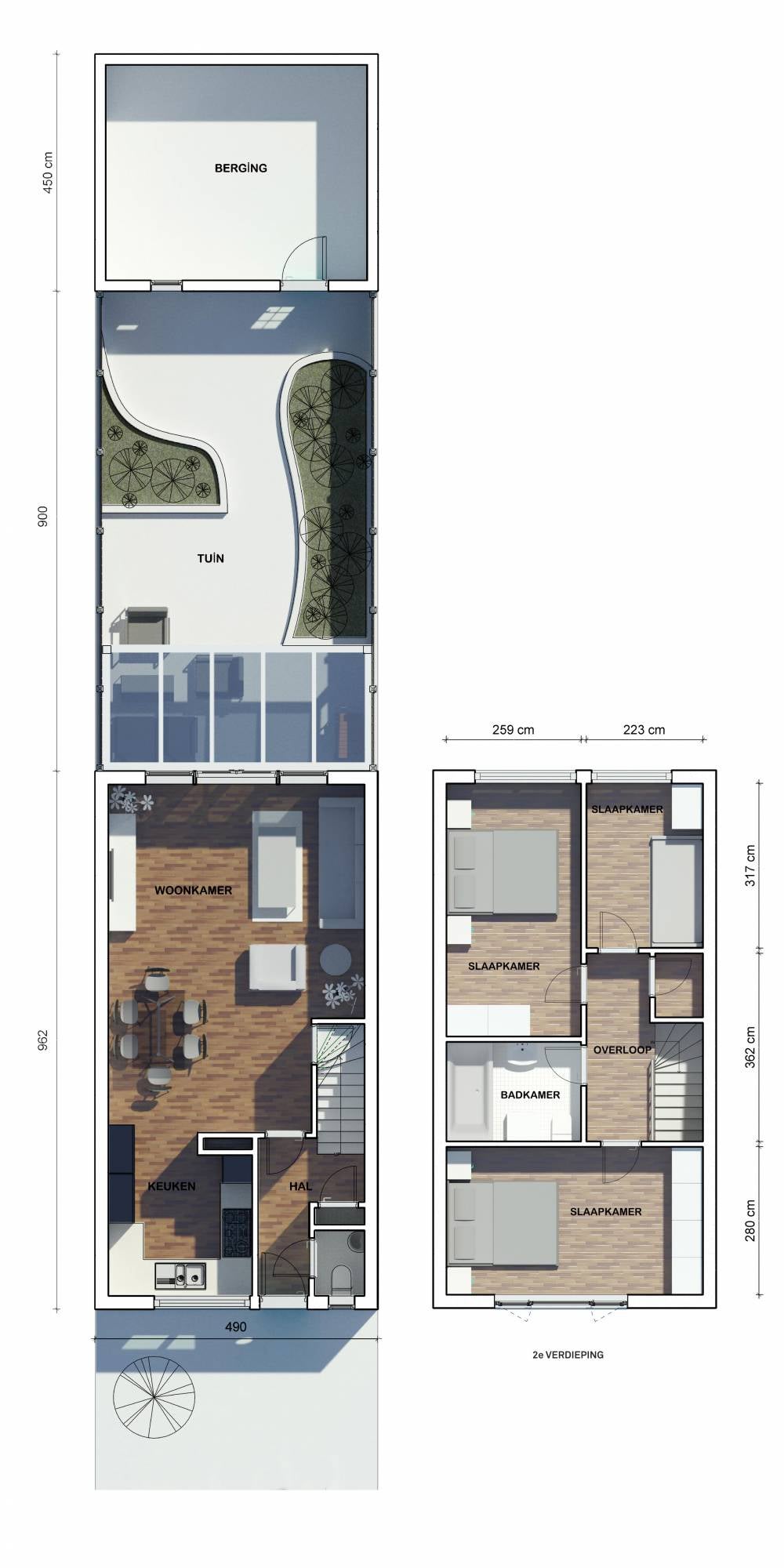 On the ground floor is a large open kitchen and spacious living room with patio doors to the deep backyard. The first meters of the backyard are covered, so even on less beautiful days you can enjoy the garden. At the back of the garden is a barn of 4.5 x 5 meters, also accessible from the rear, good to use as a workshop, storage room and / or bicycle storage.