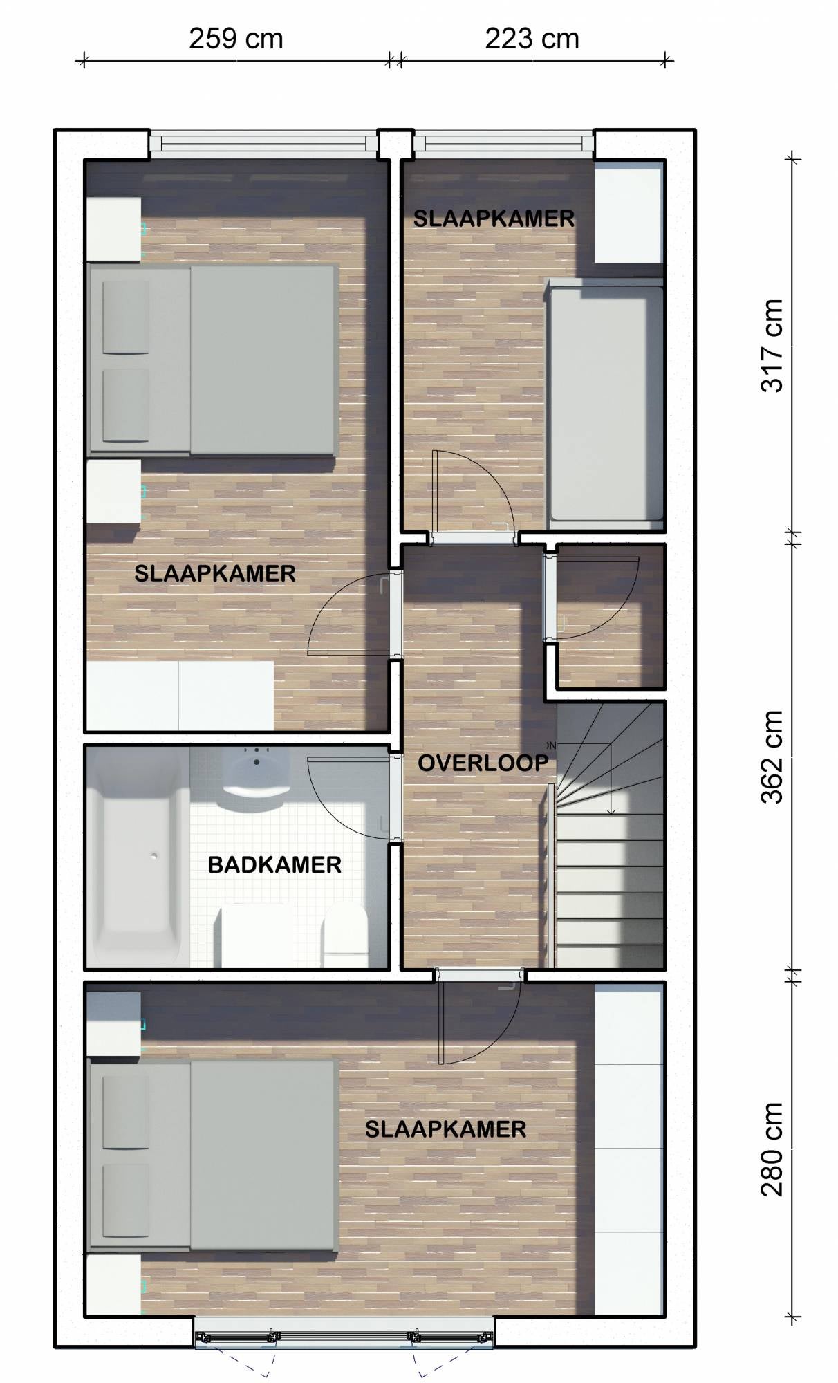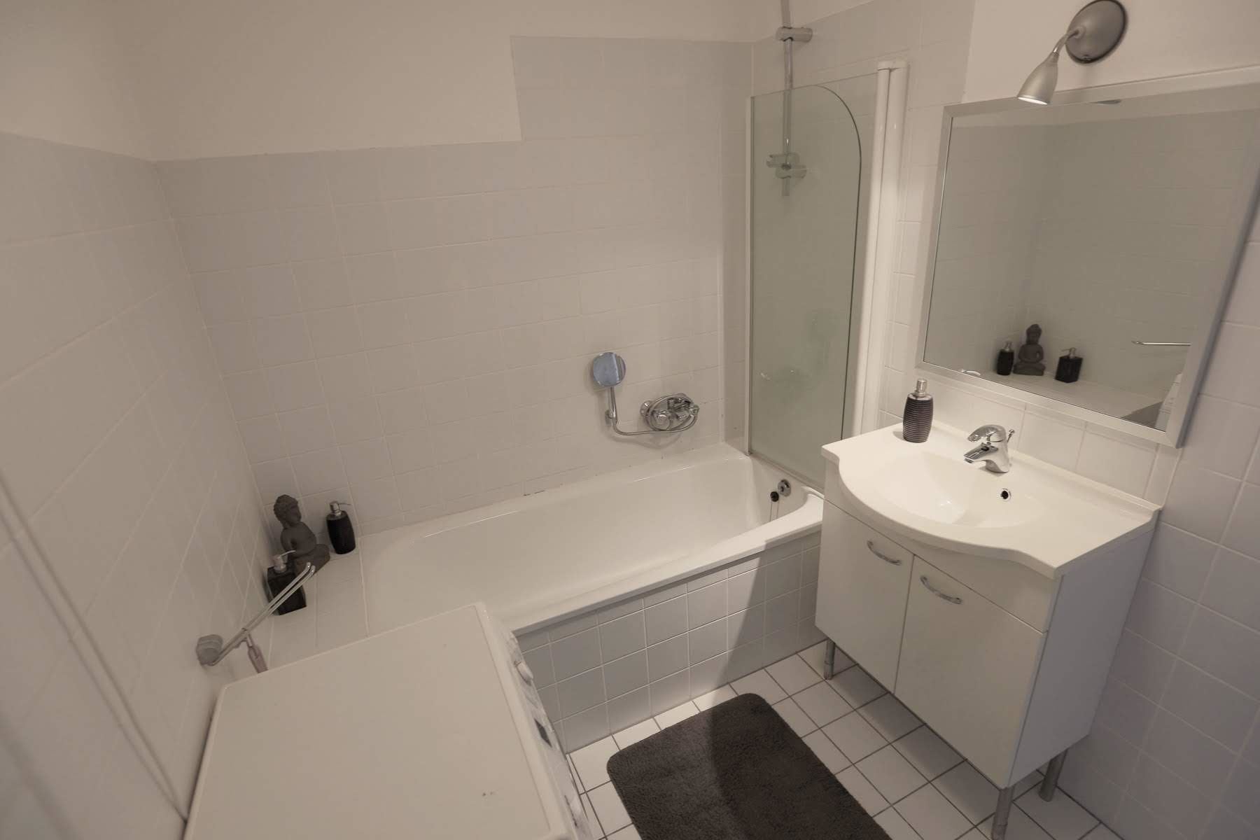 Through the upholstered stairs you reach the second floor. The three bedrooms are bright and spacious (from 7 m² to 13 m²) and are all directly adjacent to the landing. The bathroom is white tiled and has a sink cabinet, bathtub with shower, second toilet and plumbing for washing machine. The central heating boiler is located in a separate storage room.