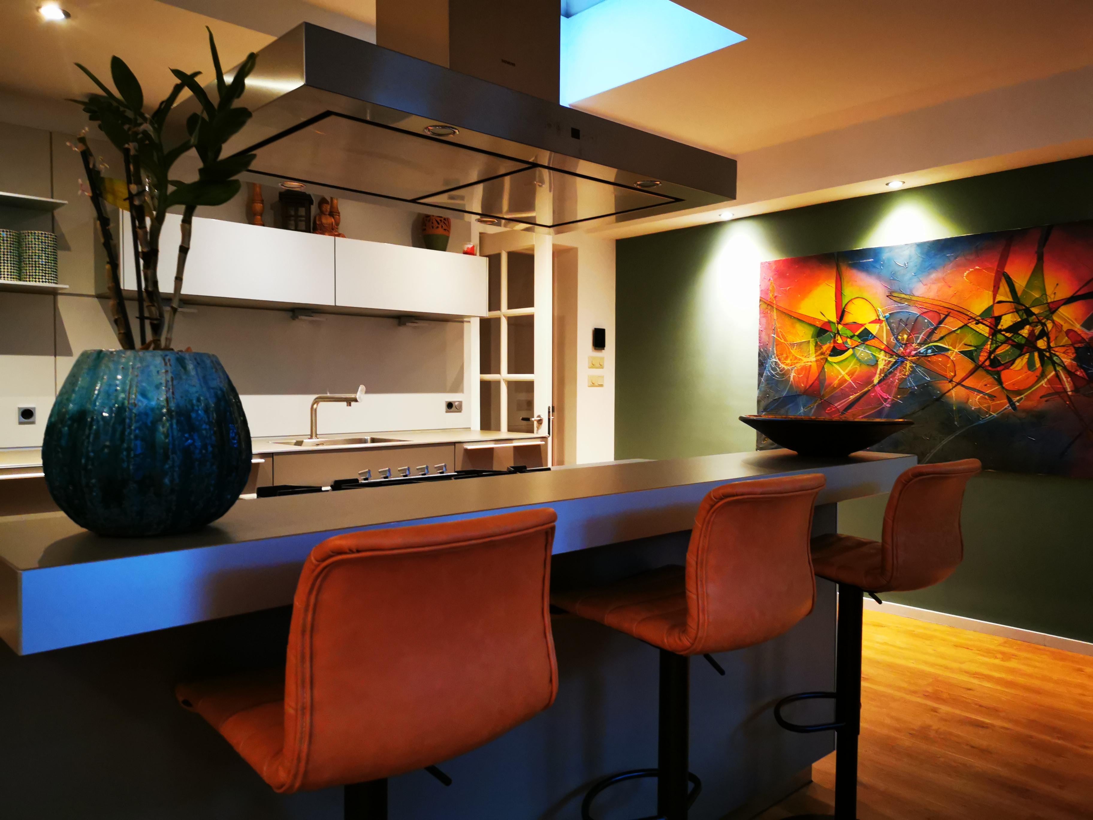 Luxurious, very spacious living room with open Bulthaup-kitchen with cooking island and two skylights. The sunny garden is located on the southwest. The bathroom is very spacious with a double sink, extra-large shower, separated bath and toilet. The apartment is completely renovated in 2020. The master bedroom has enough space for an office corner. The living room is so big, it's possible to create an extra bedroom. The hall offers a built-in wardrobe, built-in closet with washing machine and dryer and a built-in closed for storage. This apartment is completely furnished