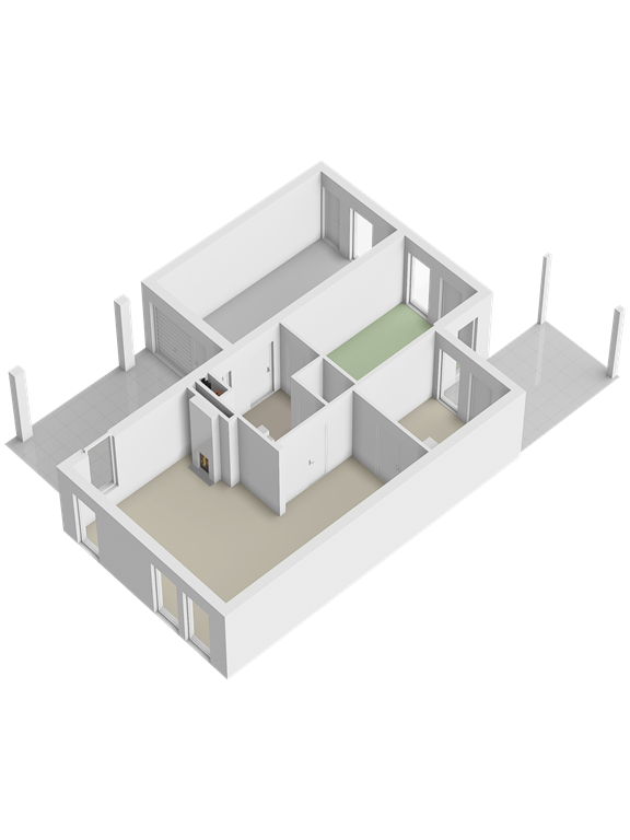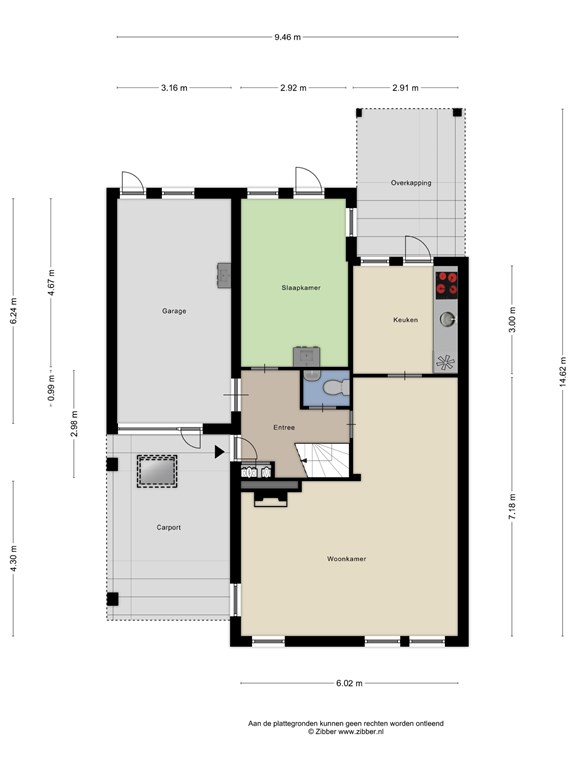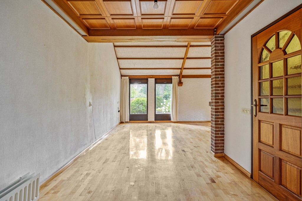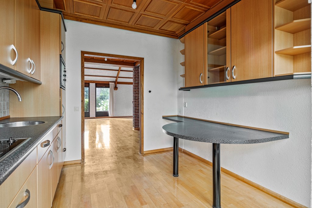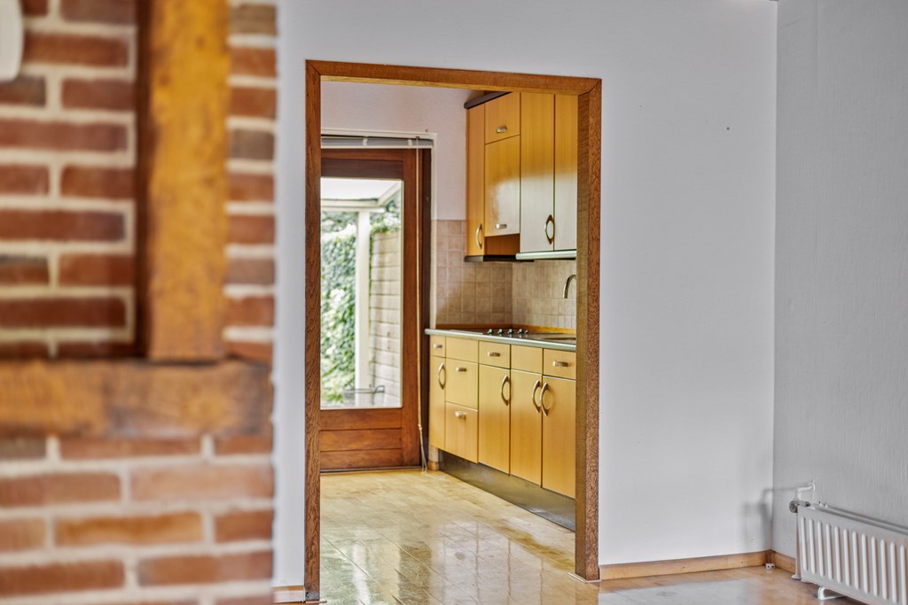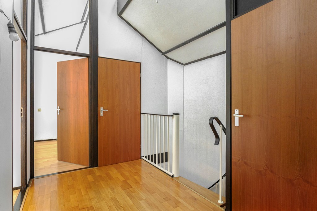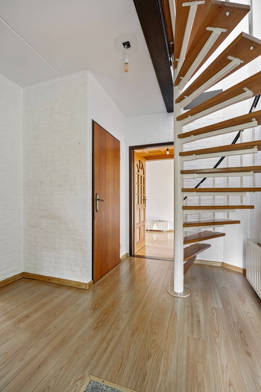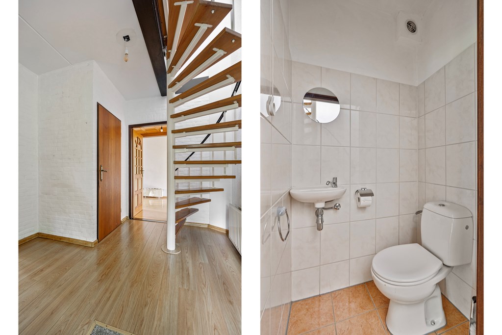 You enter through the driveway with carport by the front door on the side of the house into a spacious hall with a door to the garage on the left side and a door to the bedroom on the first floor. Furthermore, in the hall we find the stairs to the floor, the toilet and opposite the front door is the door to the living room with semi-open kitchen.