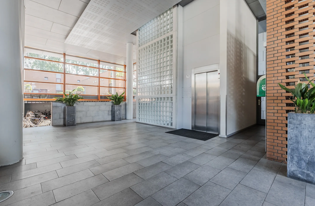 Via de gemeenschappelijke entree bereik je de centrale hal met toegang tot de lift naar de derde verdieping en toegang tot de gezamenlijke fietsenberging. De hal, met garderobe en toilet, geeft toegang tot alle ruimtes. Het gehele appartement is voorzien van dubbel glas. De woonkamer voelt ruim en licht aan door de hoekligging en grote raampartijen. Het ruime balkon van circa 11 m2 is via een schuifdeur te bereiken en is gelegen op het oosten.