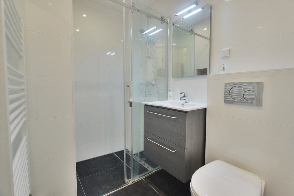 * Strakke badkamer met douche, toilet en wastafel.