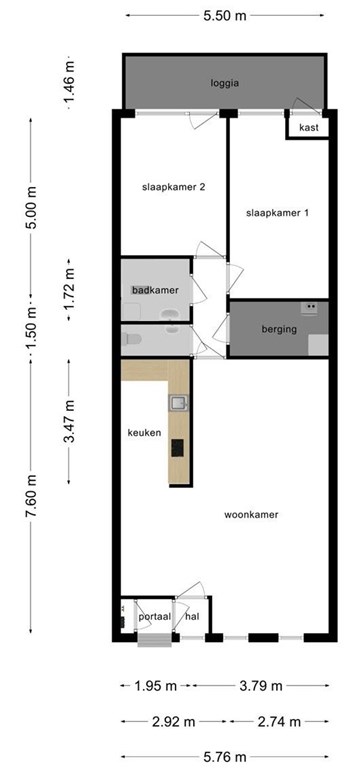 Je betreedt de woning via een paar treden naar het portaal, waar ook de meterkast (6 moderne groepen) zich bevindt. Via de voordeur stap je binnen in een compacte tussenhal (ca. 1 m²), die leidt naar de ruime woonkamer met open keuken.