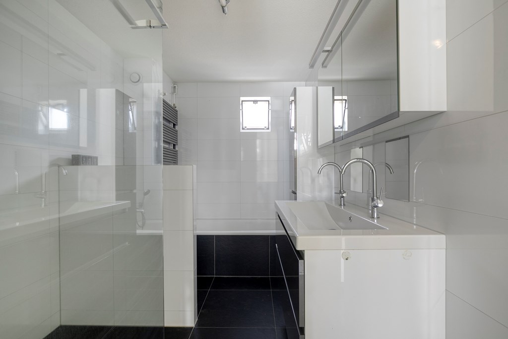 Luxe badkamer met ligbad, ruime inloopdouche, dubbele wastafel, zwevend toilet en vloerverwarming.