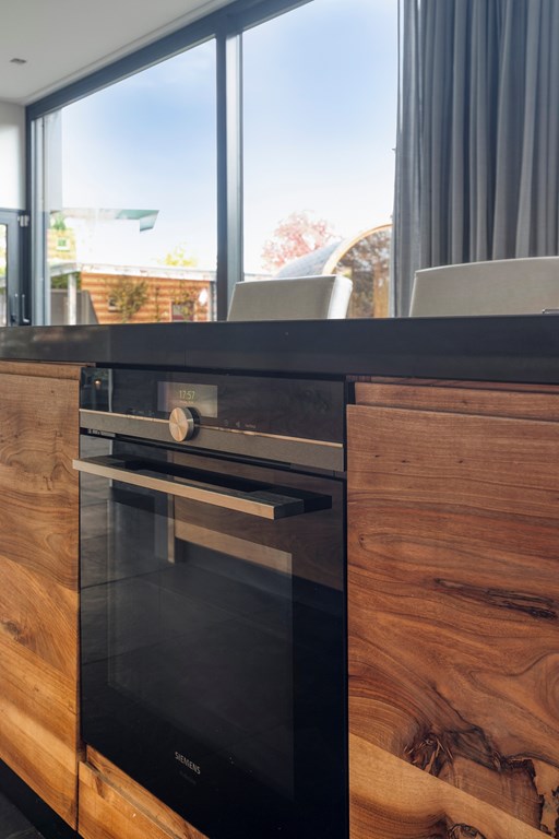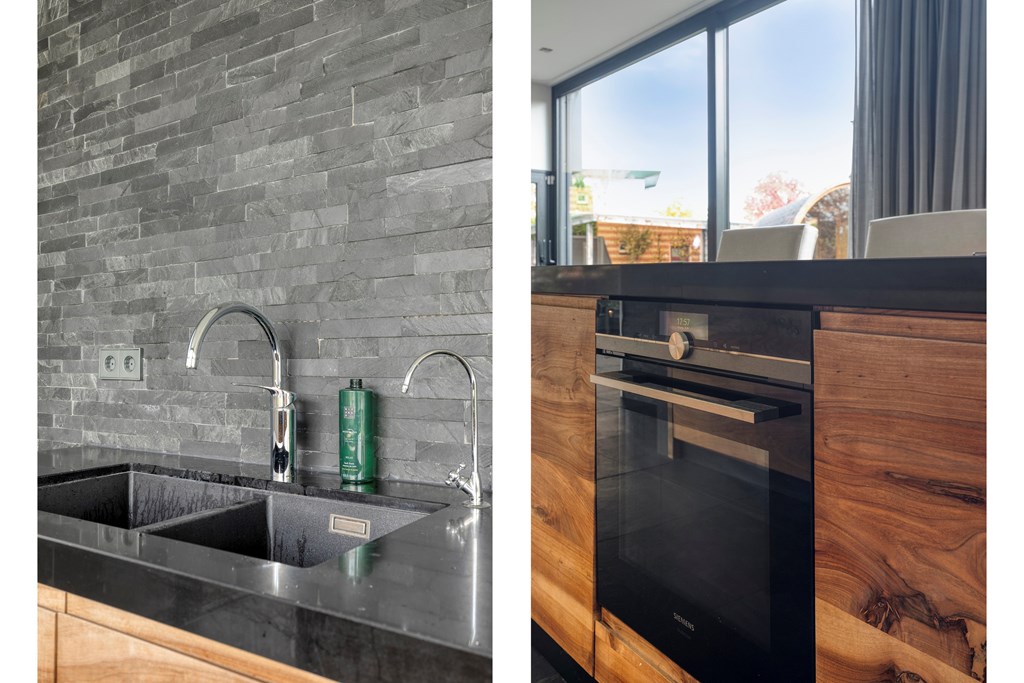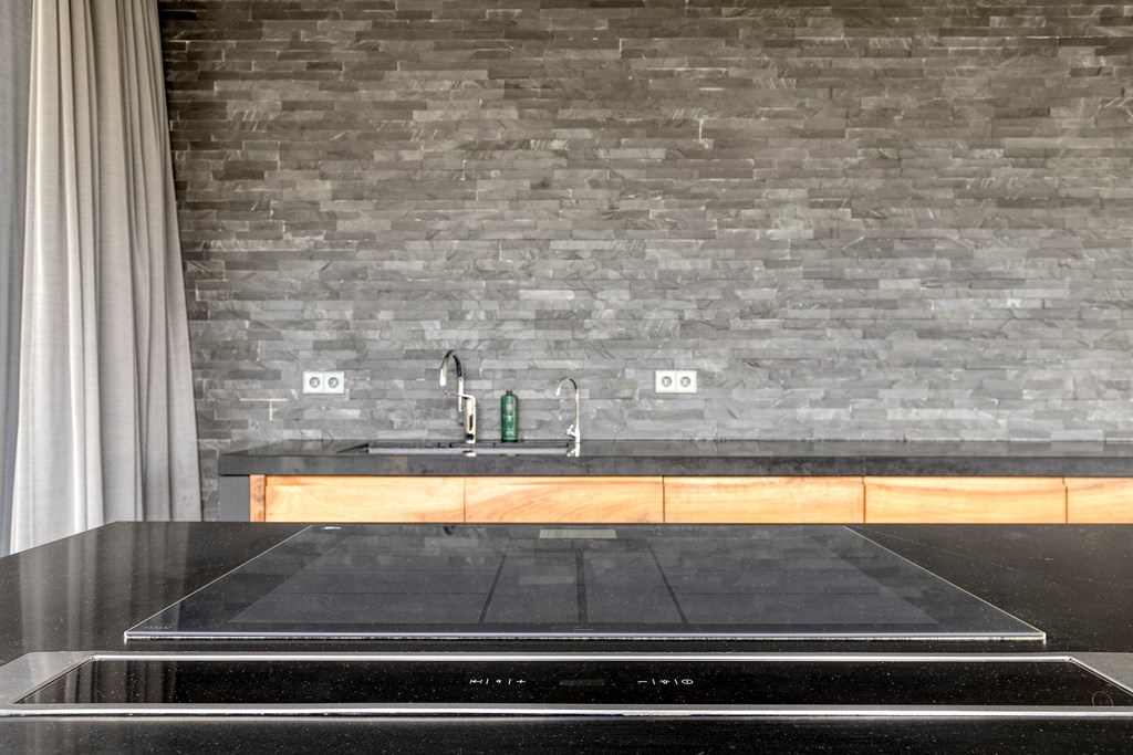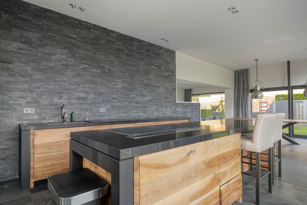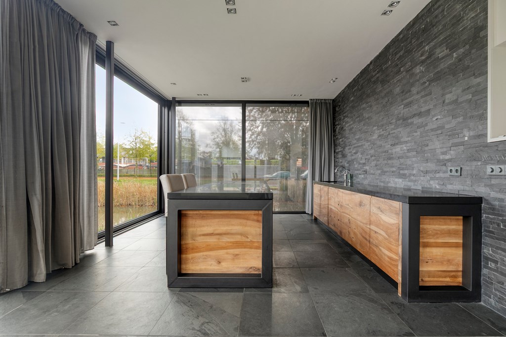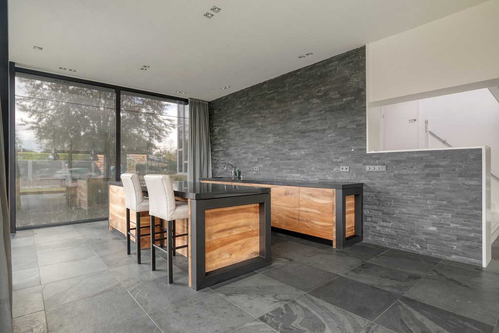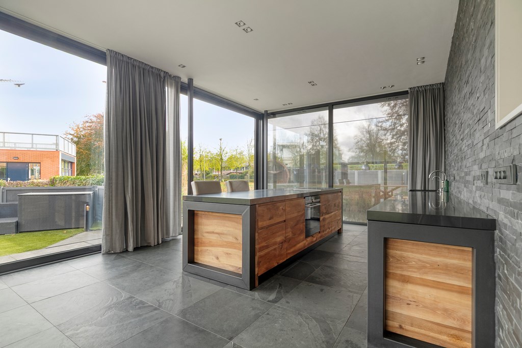 Riante, uitgebouwde woonkeuken met kookeiland, complete inbouwapparatuur, dubbele spoelbak, koelkastladen en een stijlvolle kastenwand.
