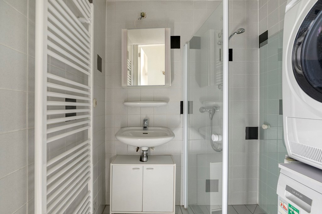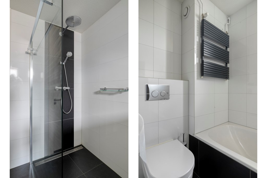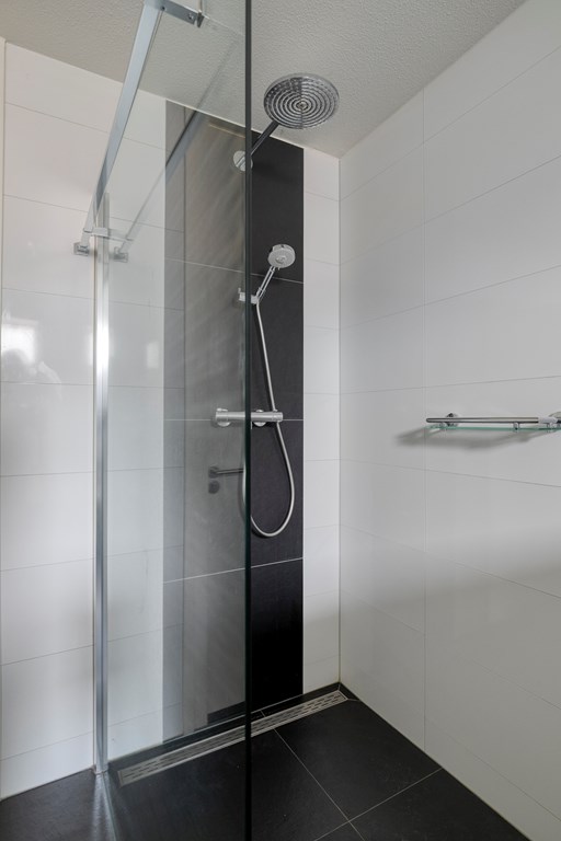 Twee extra slaapkamers en een tweede badkamer met douche, wastafel en wasmachine-/drogeropstelling.
