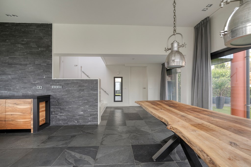 Verhoogde, gezellige woonkamer met natuurstenen vloer, veel lichtinval en vrij uitzicht.