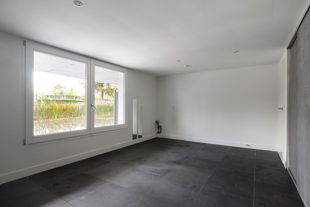 Ramen tot op de vloer met uitzicht op de tuin en het water.