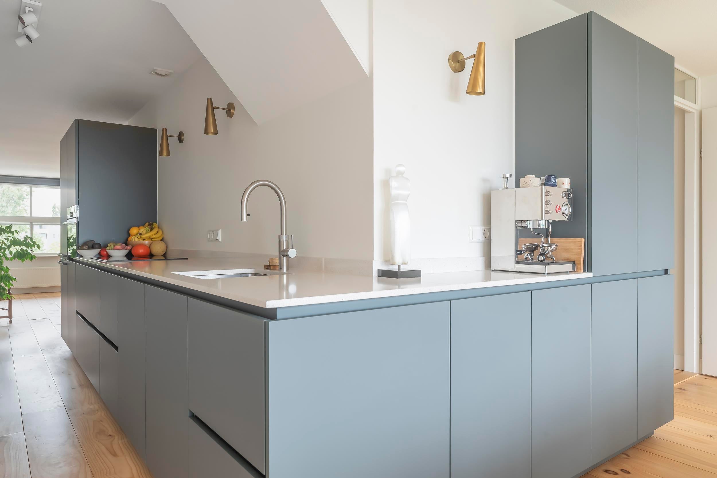 Een trap leidt naar de ruime, lichte doorzonwoonkamer. De moderne woonkeuken (2023) vormt het hart van het appartement en is uitgerust met o.a. een inductiekookplaat en oven. Vanuit de eetkamer stapt u direct het zonnige balkon op met uitzicht op de groene binnentuin.