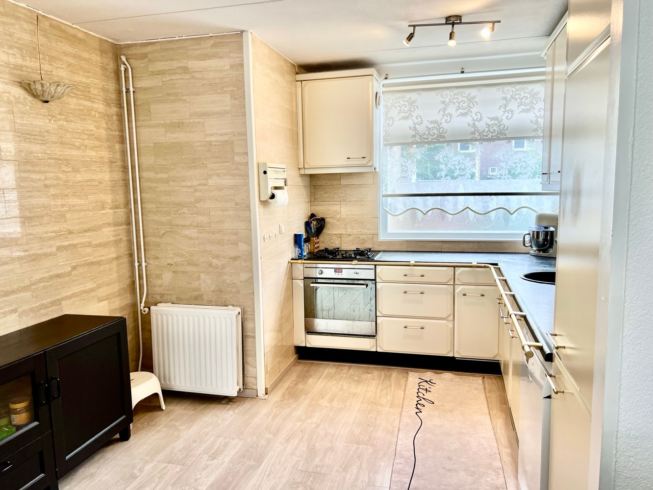 - Open keuken met inbouwapparatuur: gaskookplaat, afzuigkap, koel-vriescombinatie, oven en vaatwasser