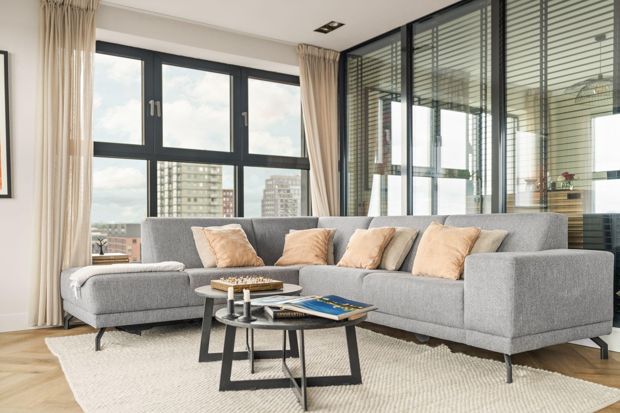 Riante woonkamer met grote raampartijen en panoramisch uitzicht