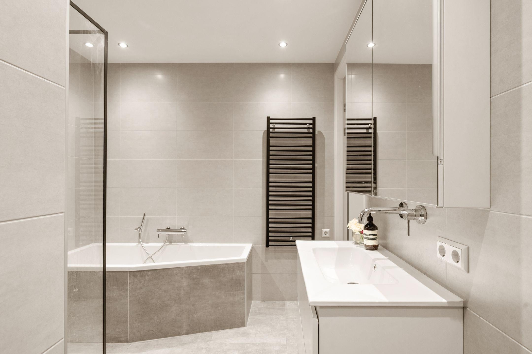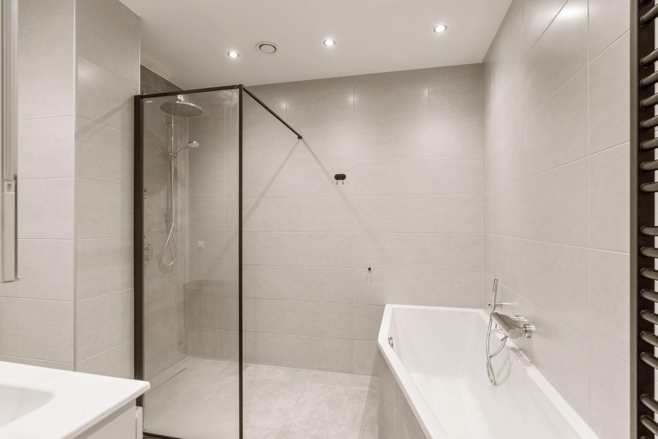 Moderne badkamer met ligbad, inloopdouche, dubbele wastafel
