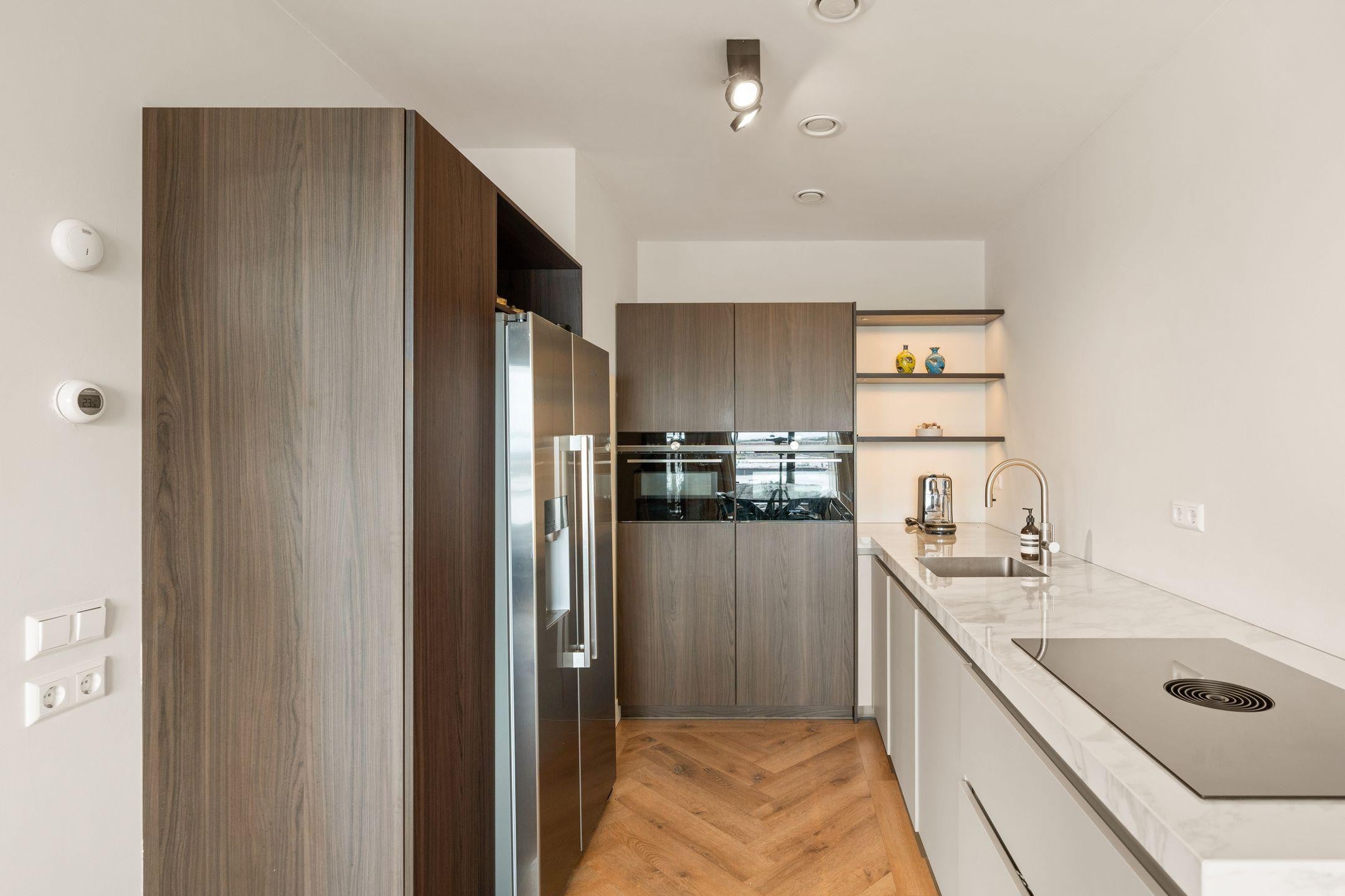 Stijlvolle afwerking: visgraat pvc-vloer, vloerverwarming, inbouwspots.
