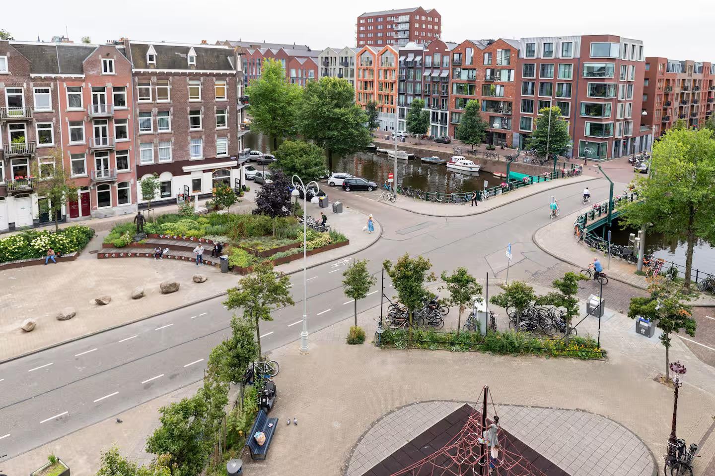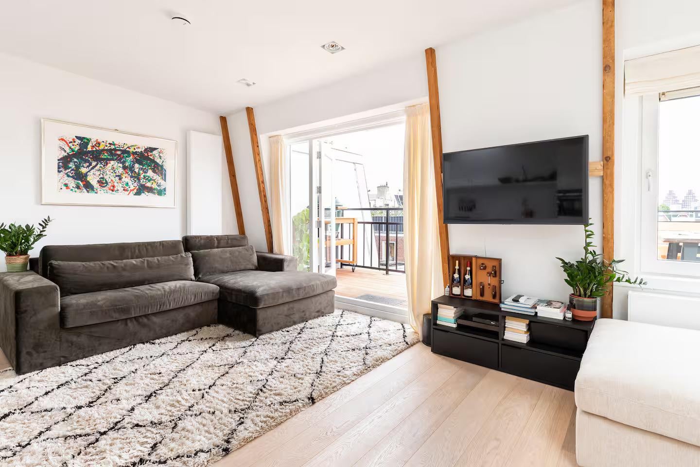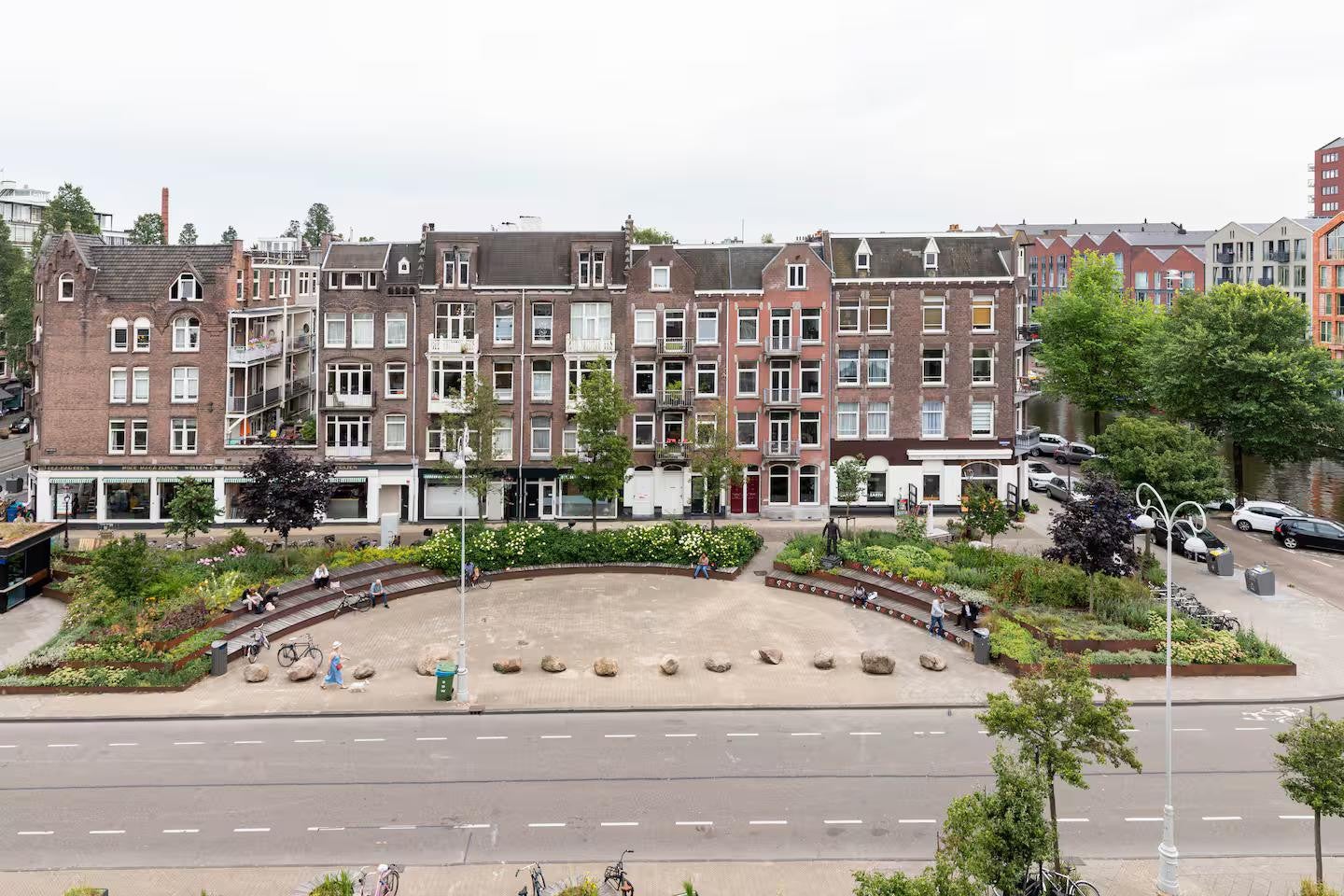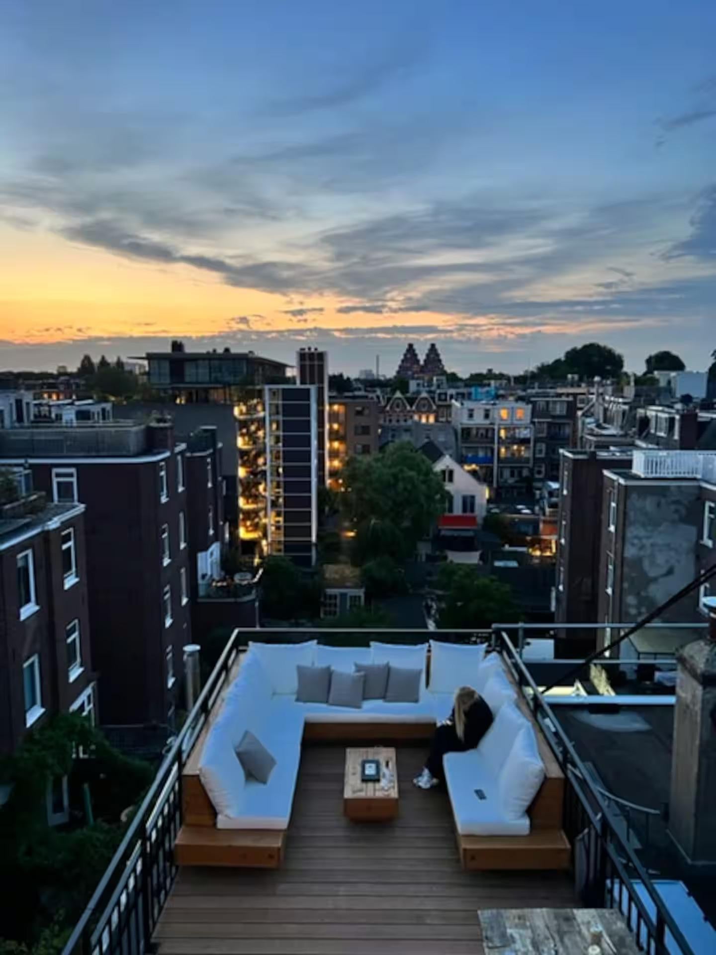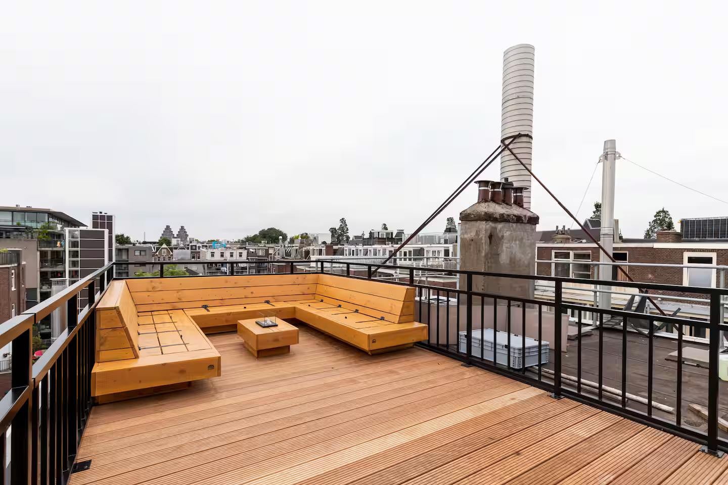 Het absolute hoogtepunt is het **dakterras van 30 m²** met de hele dag zon – van zonsopkomst tot zonsondergang. Voor kookliefhebbers staat er zelfs een **Big Green Egg** klaar. Via de trap is ook het dak van het pand zelf bereikbaar, vanwaar je een spectaculair uitzicht hebt over heel Amsterdam.