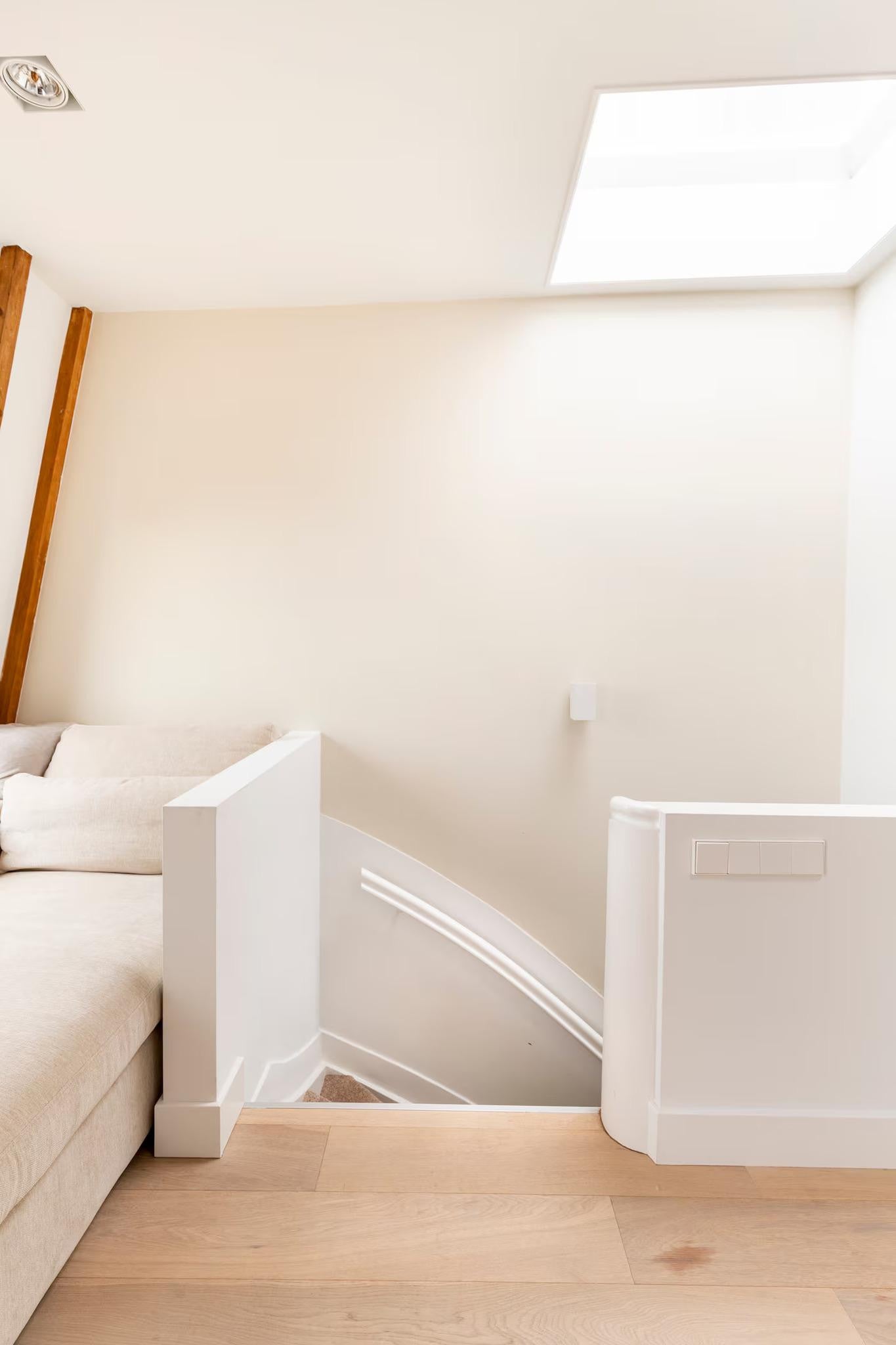 * **Slaapkamer**: Grote slaapkamer met mooie houten balken, smart-tv (honderden kanalen + streamingdiensten) en airco. Vanuit de slaapkamer kijk je uit over het levendige Kwakersplein.