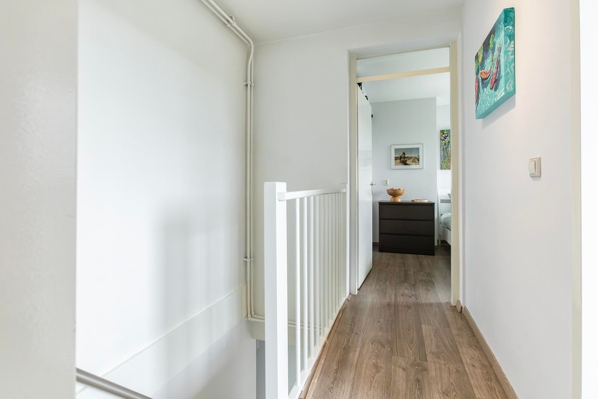 Op de bovenverdieping zijn nog twee slaapkamers, waarvan één met een inloopkast. Ook is hier een berging/technische ruimte met aansluiting voor wasmachine en cv-installatie. In de onderbouw is nog een aparte berging aanwezig. Bewoners kunnen daarnaast gebruikmaken van een gemeenschappelijke binnentuin.