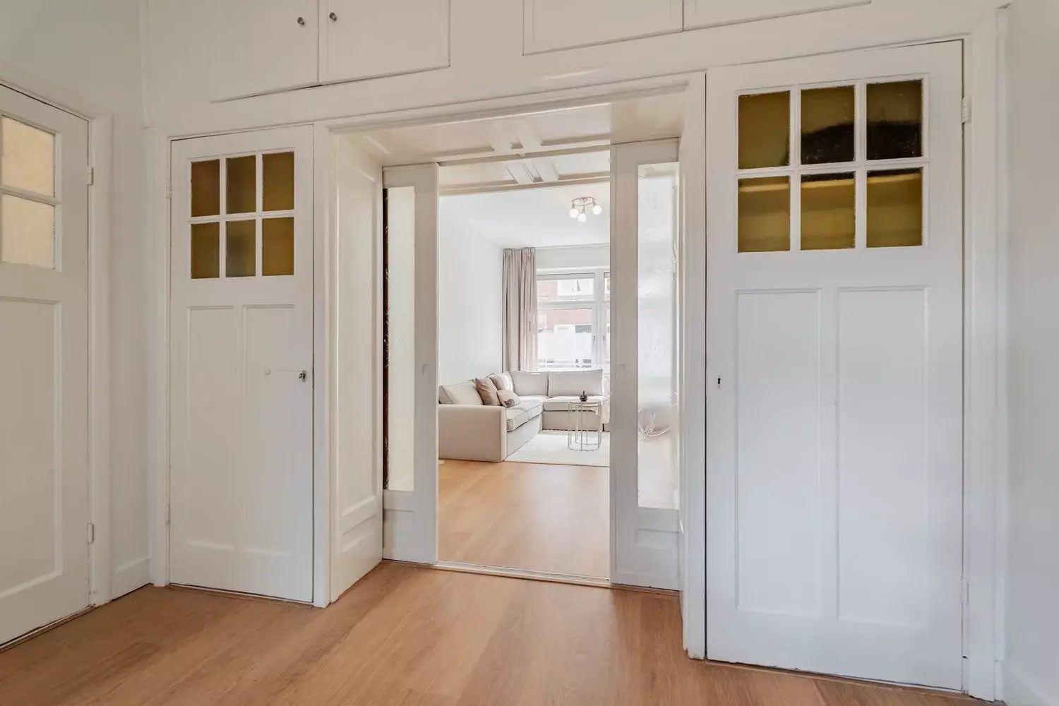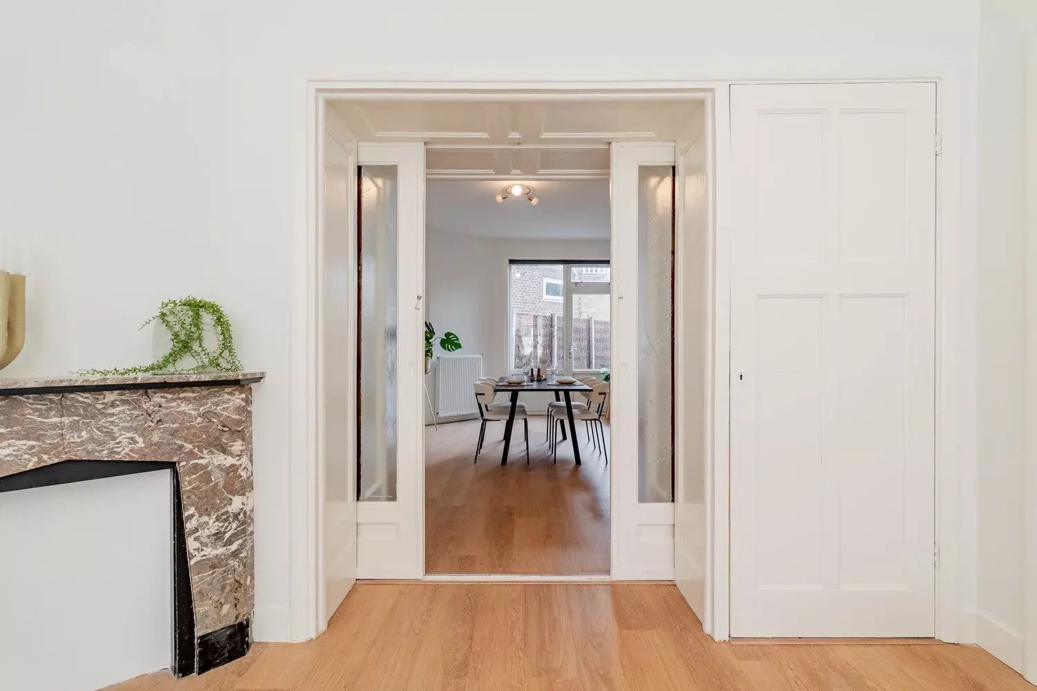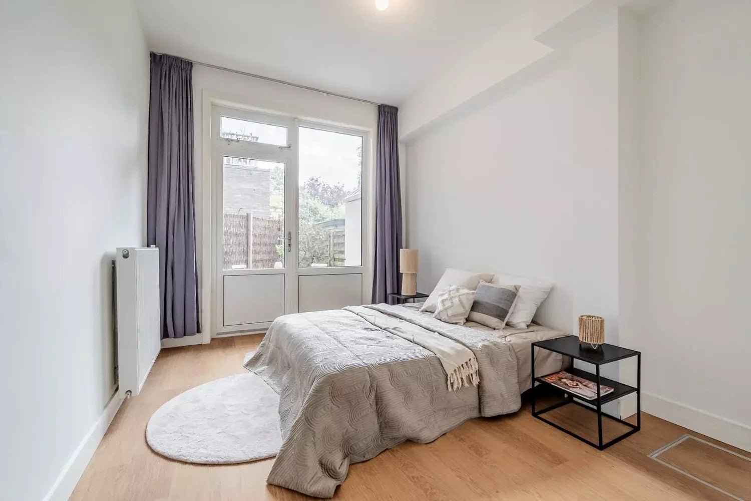 From the classy entrance you enter the vestibule which allows you to enter all rooms in the apartment. The apartment has a nice wooden floor and several built-in closets. The modern kitchen on the front of the house is equipped with a gas stove, oven, dishwasher and freezer/refrigerator. The spacious and light living room is divided by the original en-suite doors and is laid out from the front to the back of the house, where the entrance to the back yard is. The large bedroom is also located at the back of the house and has doors to the backyard too. The modern, new bathroom has a toilet, design radiator, sink, washing machine and a large shower. The apartment is heated by a central heating system.