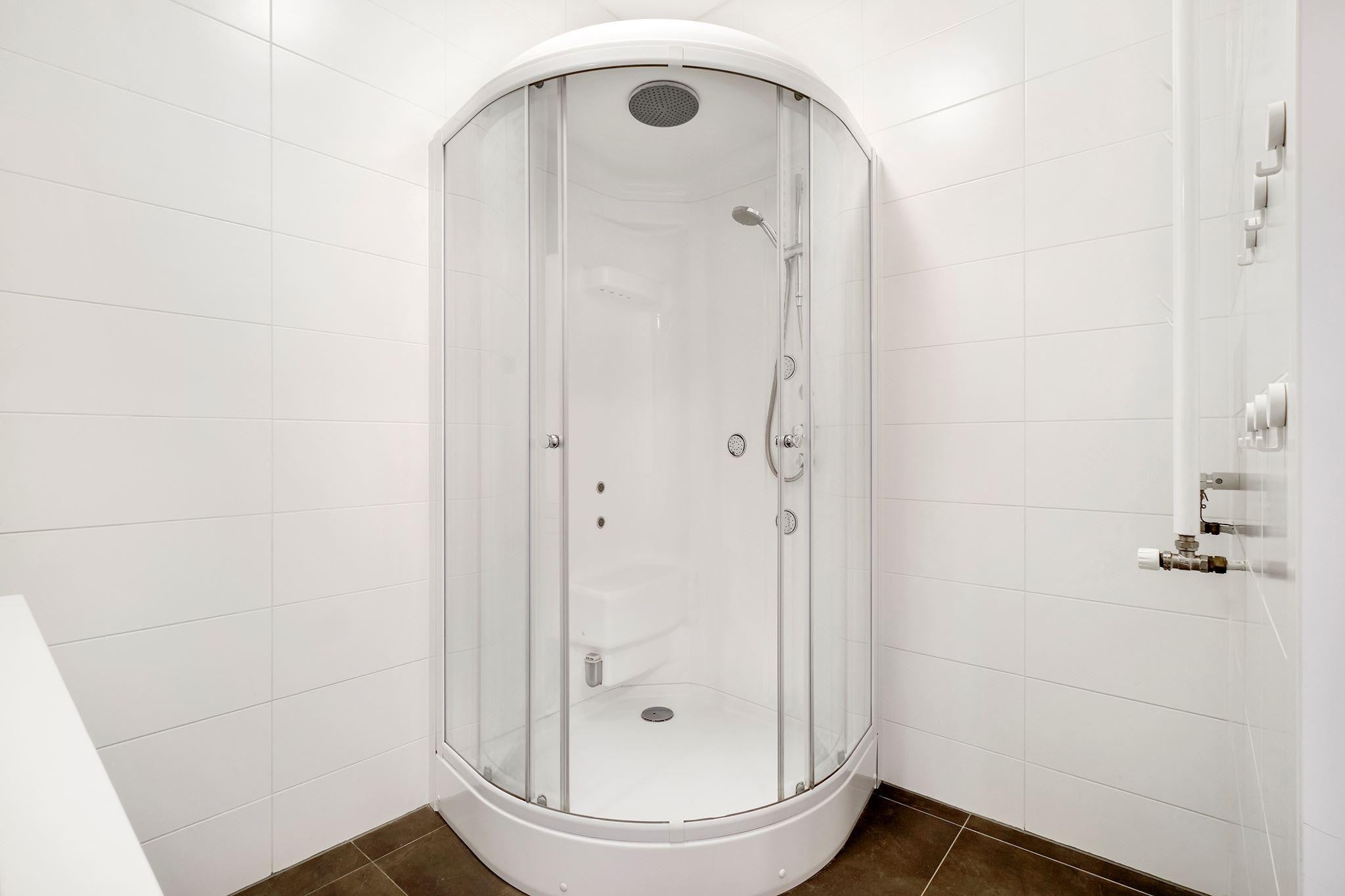 Eerste verdieping: lichte woonkamer met schuifpui naar het terras en binnentuin, 3 ruime slaapkamers (waarvan de main met toegang tot het terras), moderne badkamer met stoomcabine/douche, dubbele wastafel en separaat toilet.