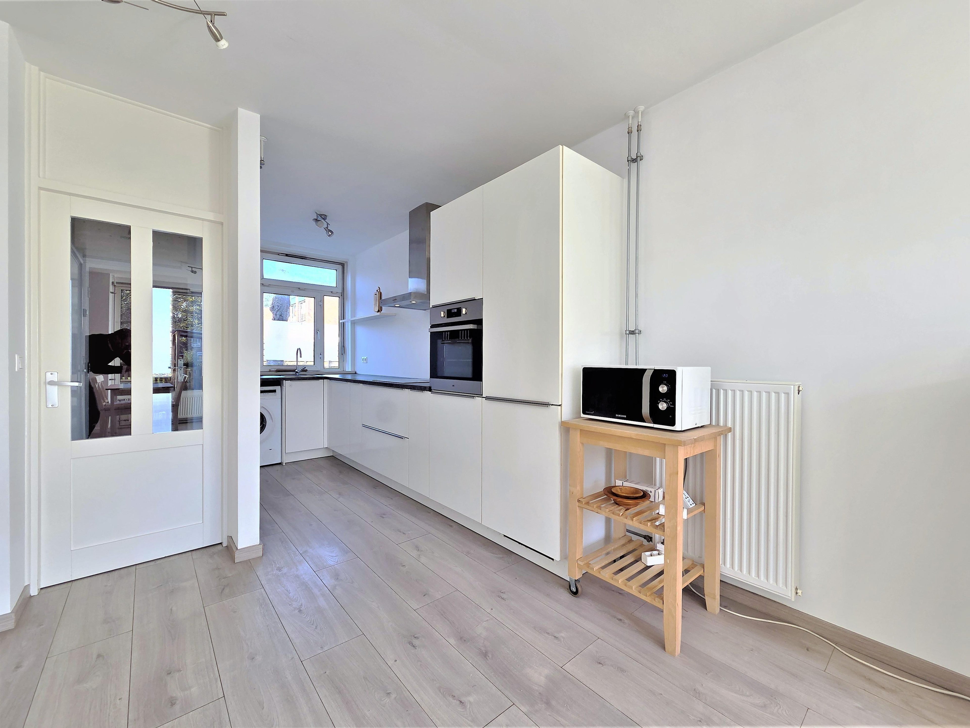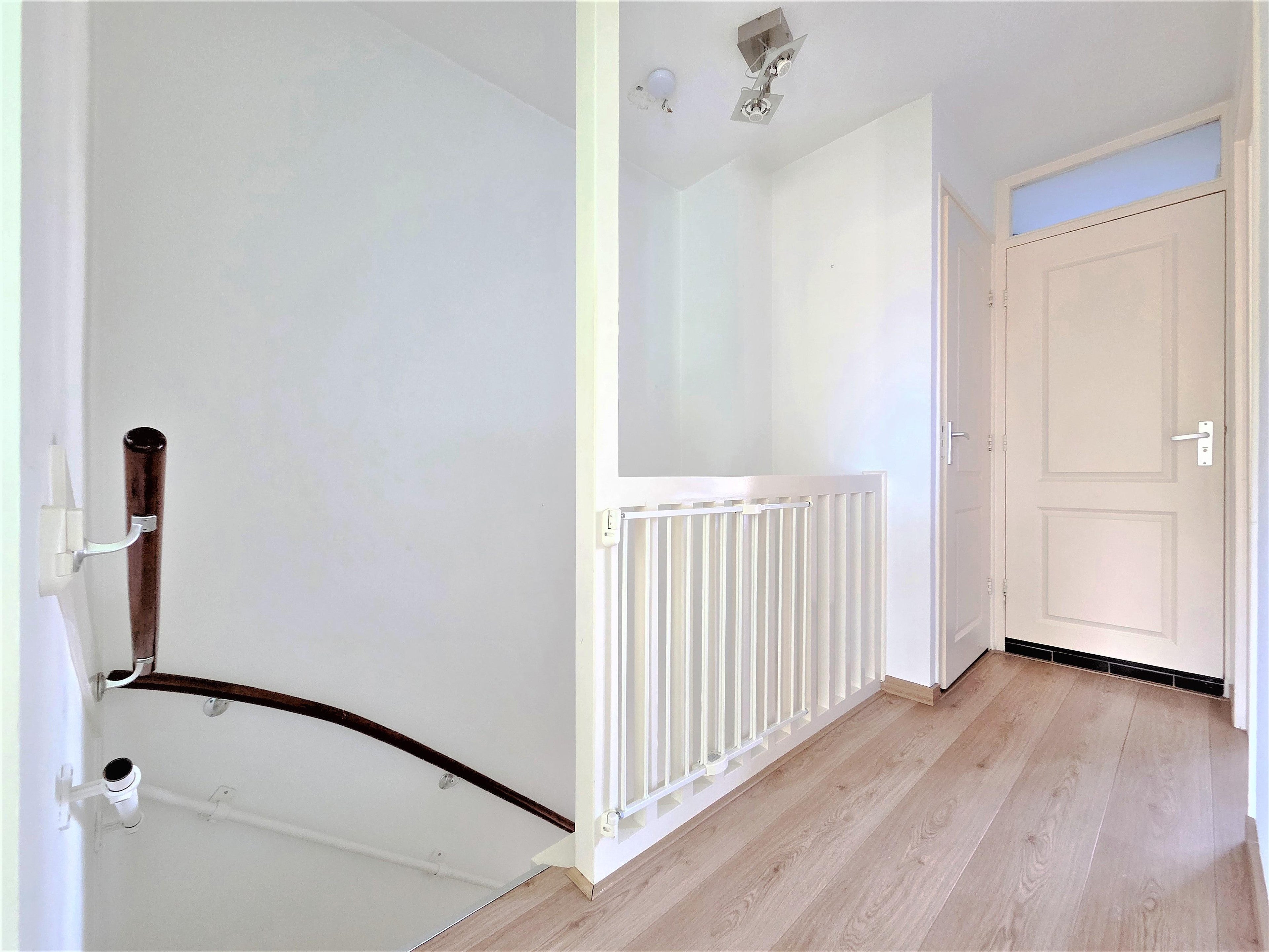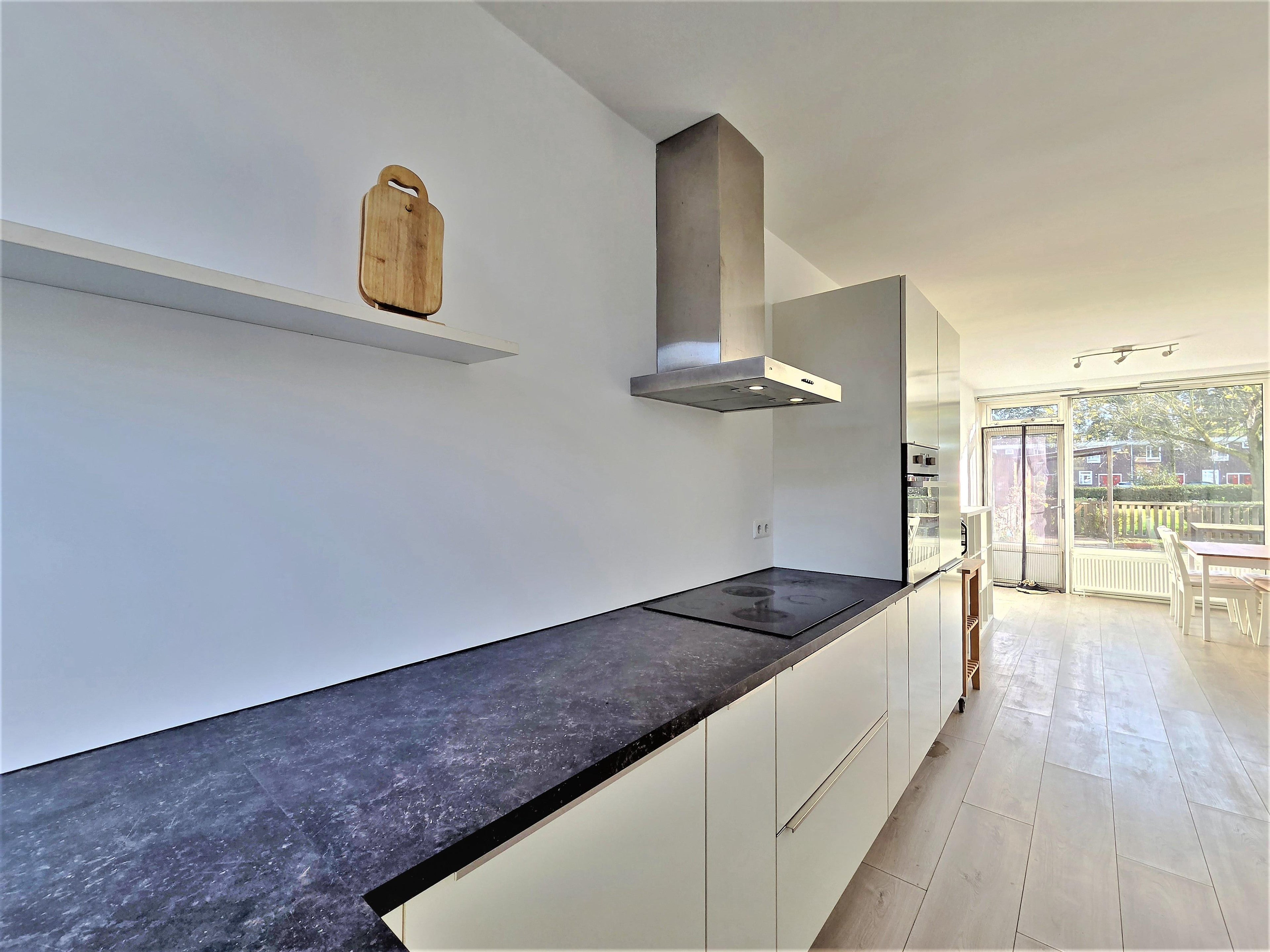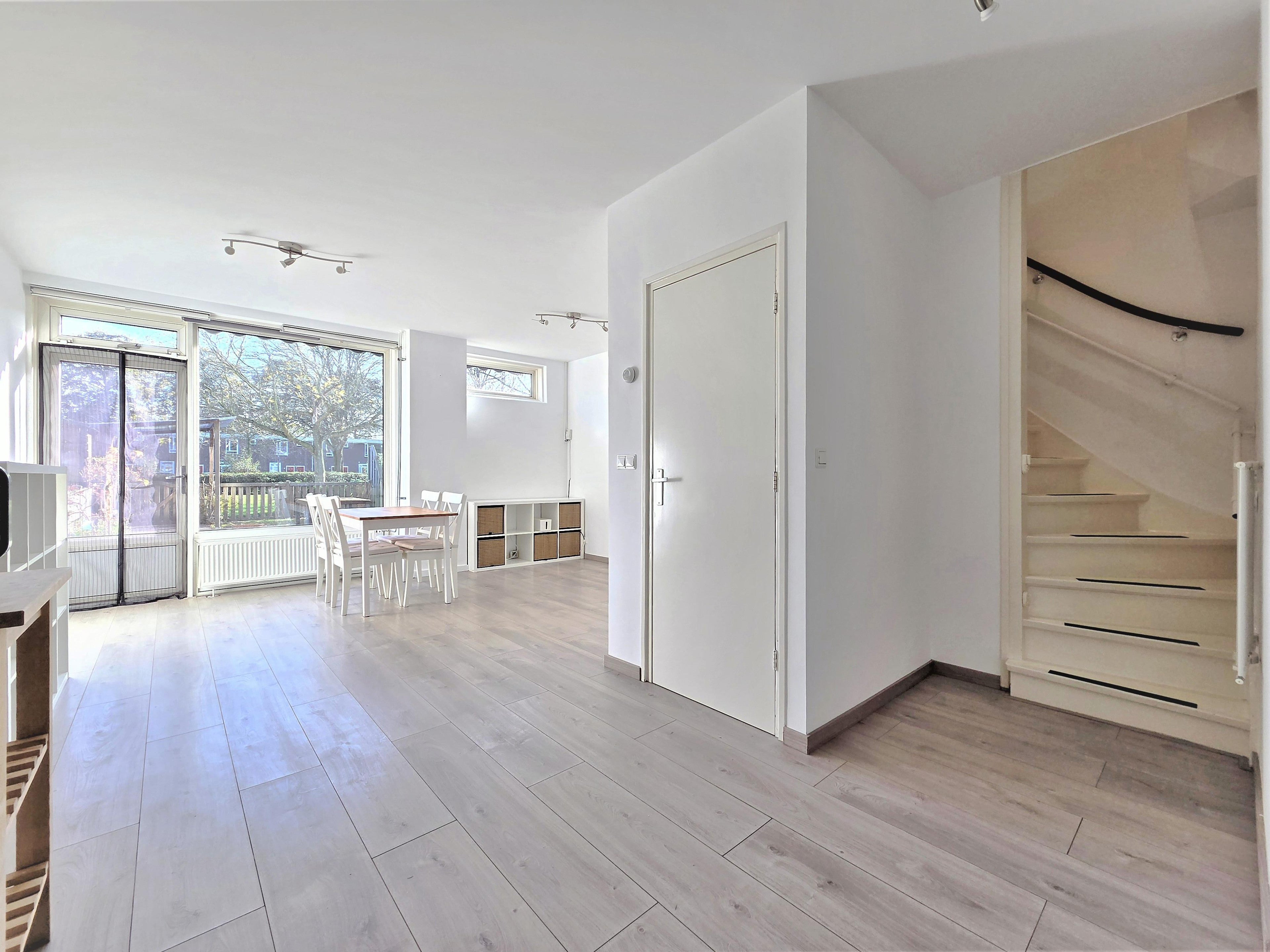 Via de voordeur bereik je de hal, met direct toegang tot een handige (opslag)ruimte en een eerste separate wc. De doorzonwoonkamer ligt aan de achterzijde en biedt toegang tot de verzorgde achtertuin van circa 45 m². Aan de voorzijde bevindt zich de relatief nieuwe open keuken, compleet met inbouwapparatuur en wasmachine. Onder de trap vind je nog een afgesloten bergkast.