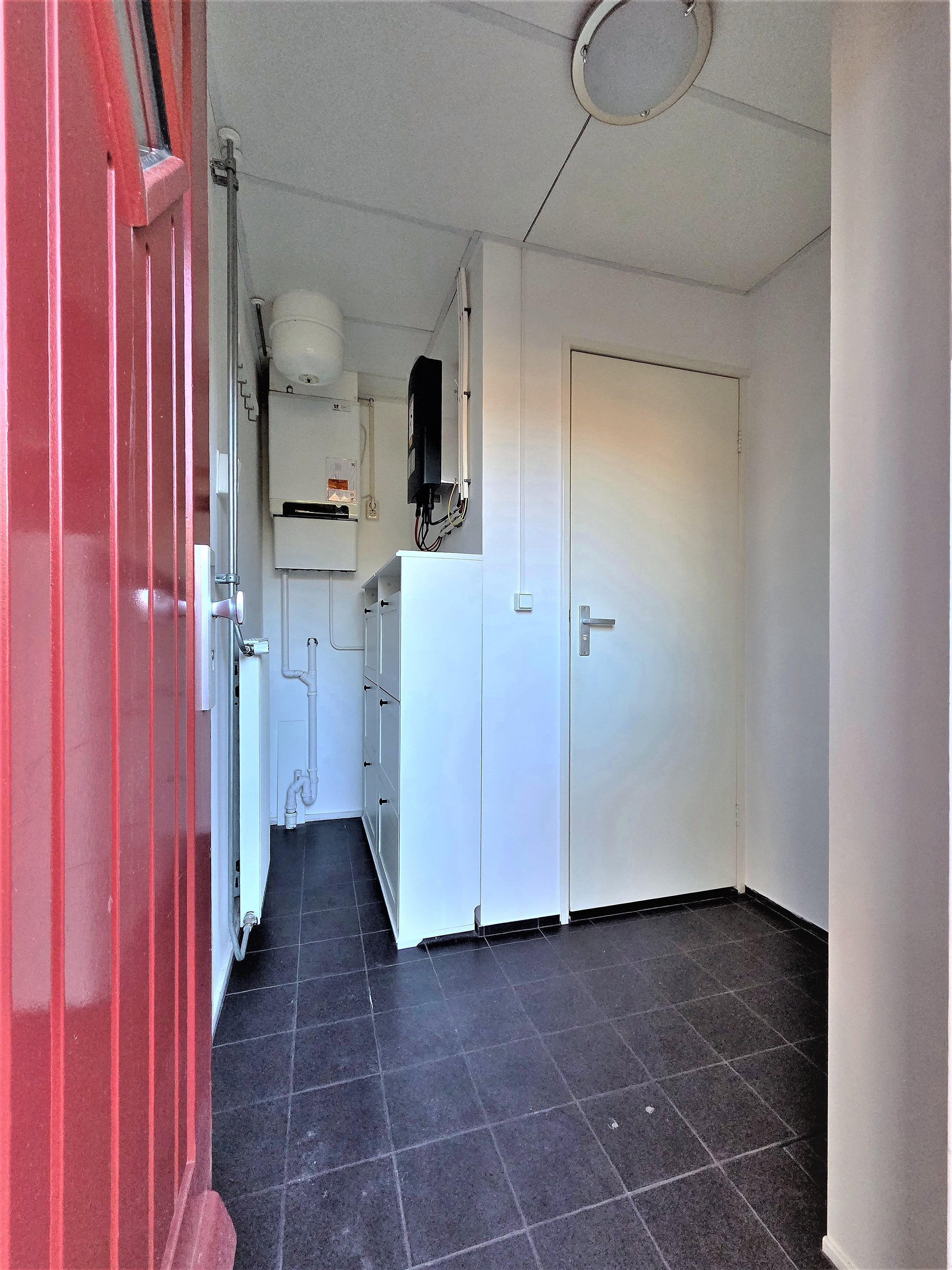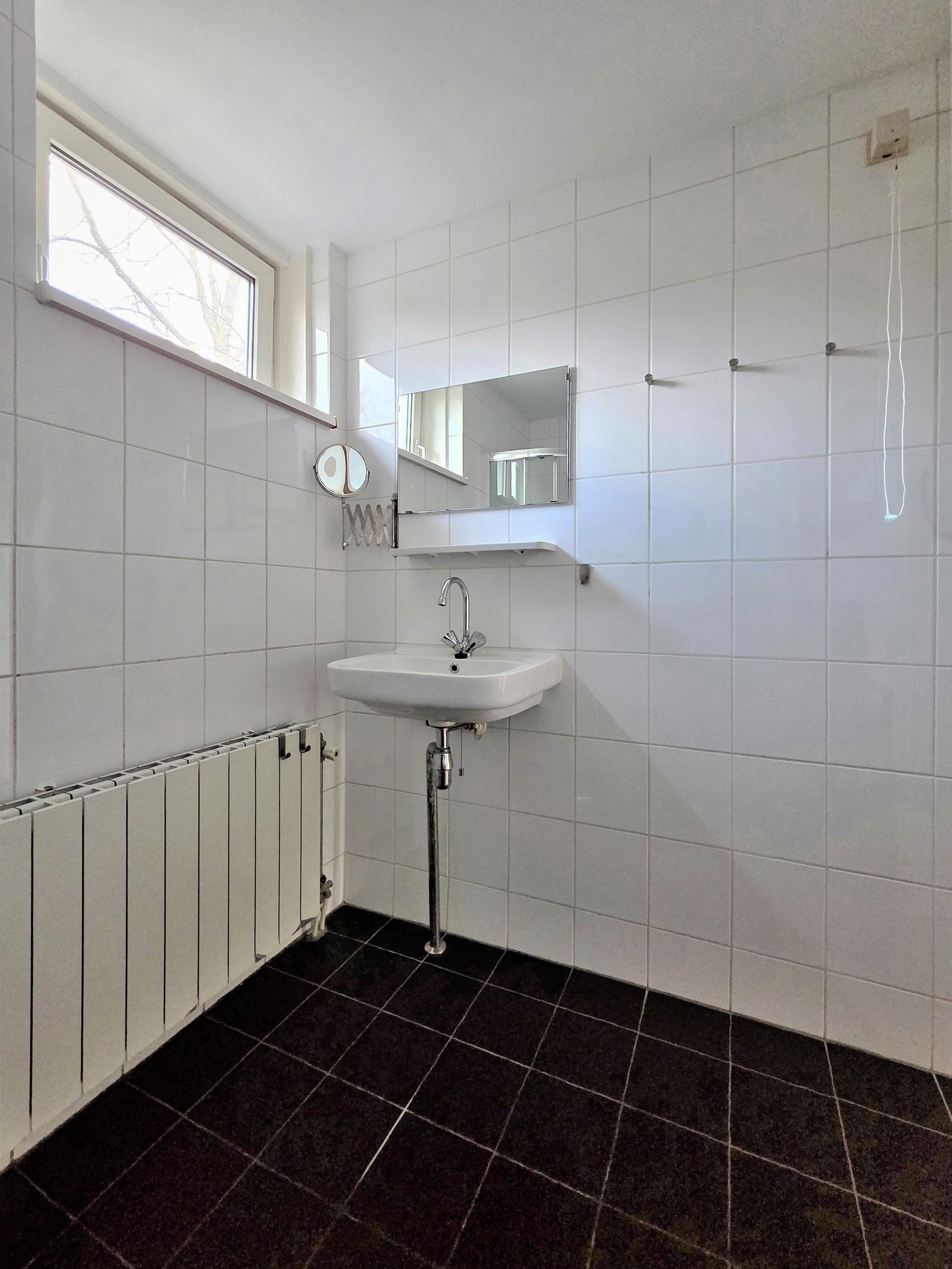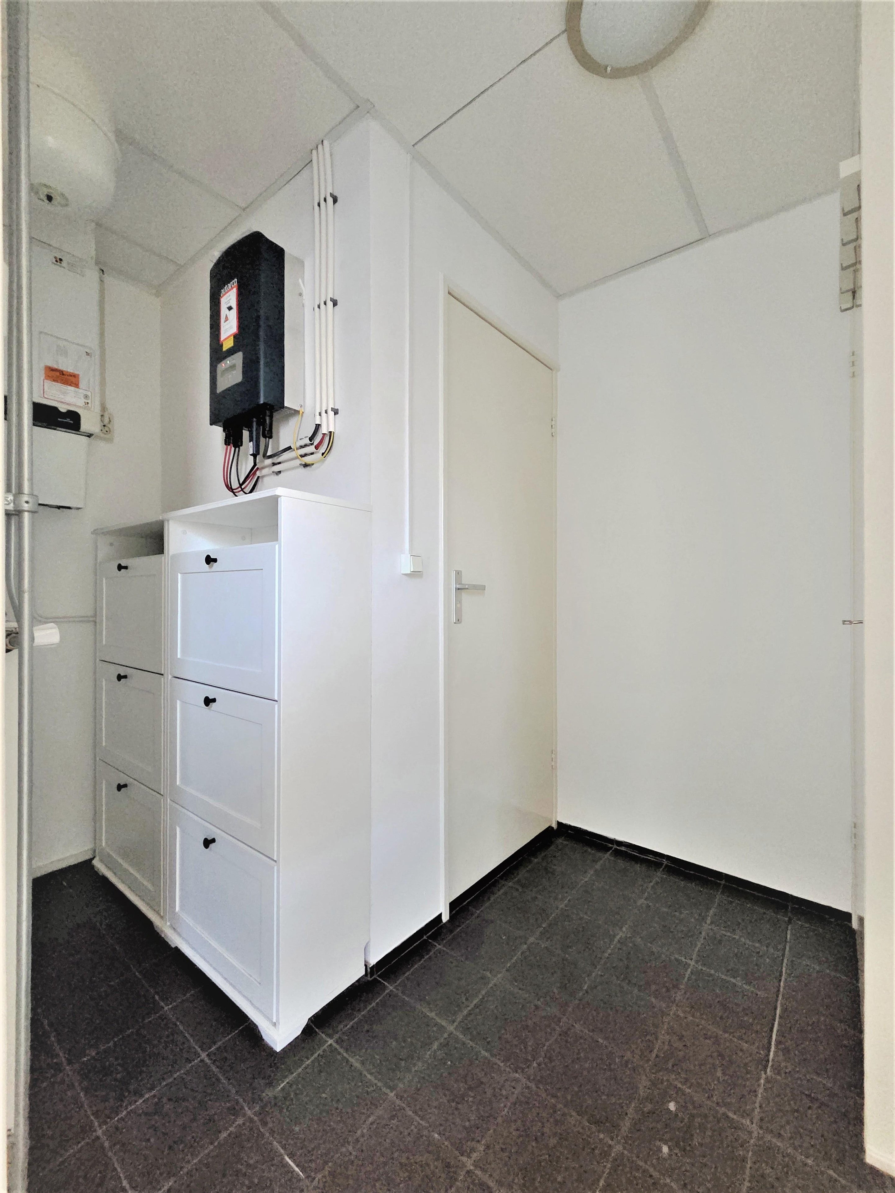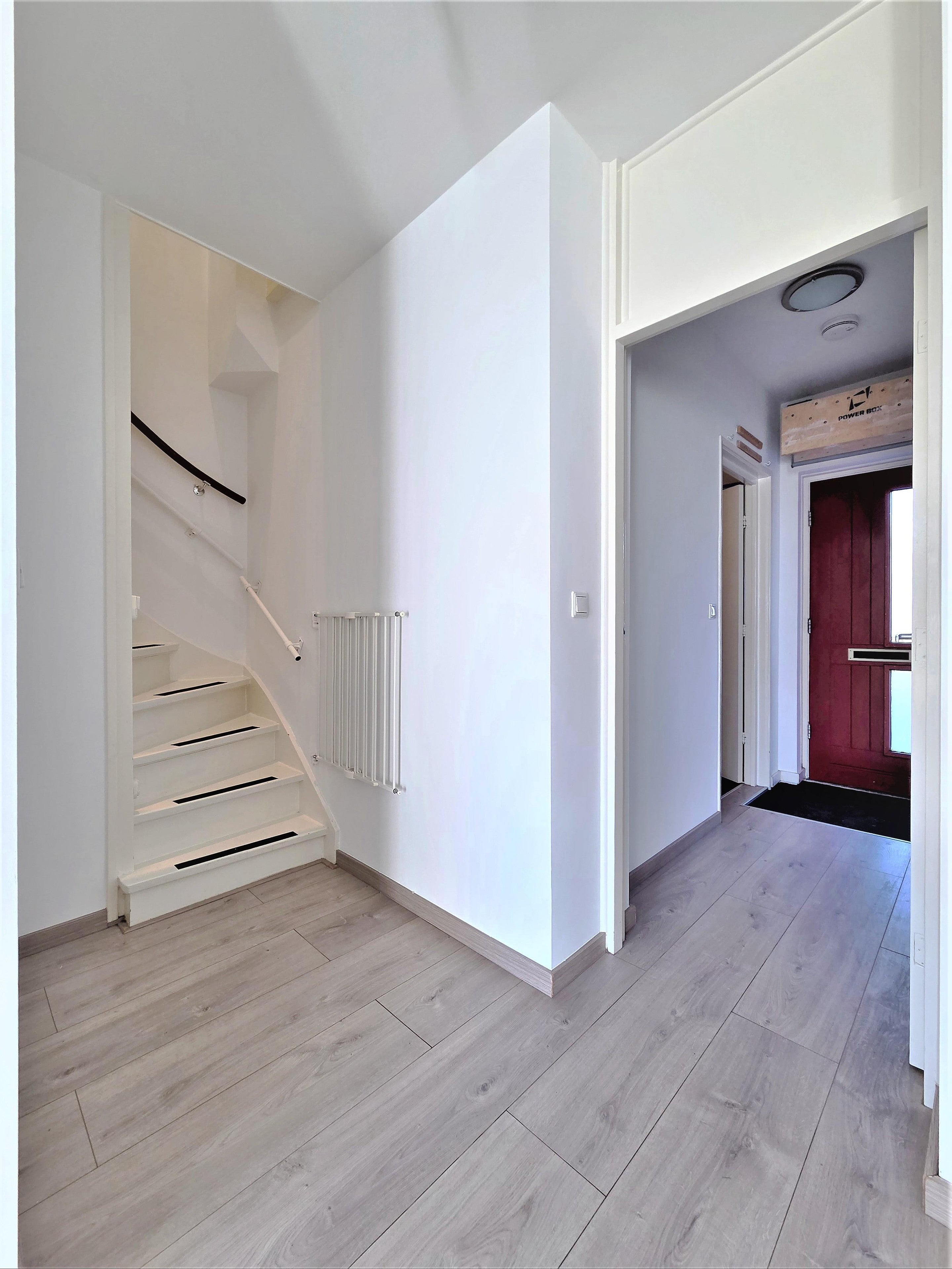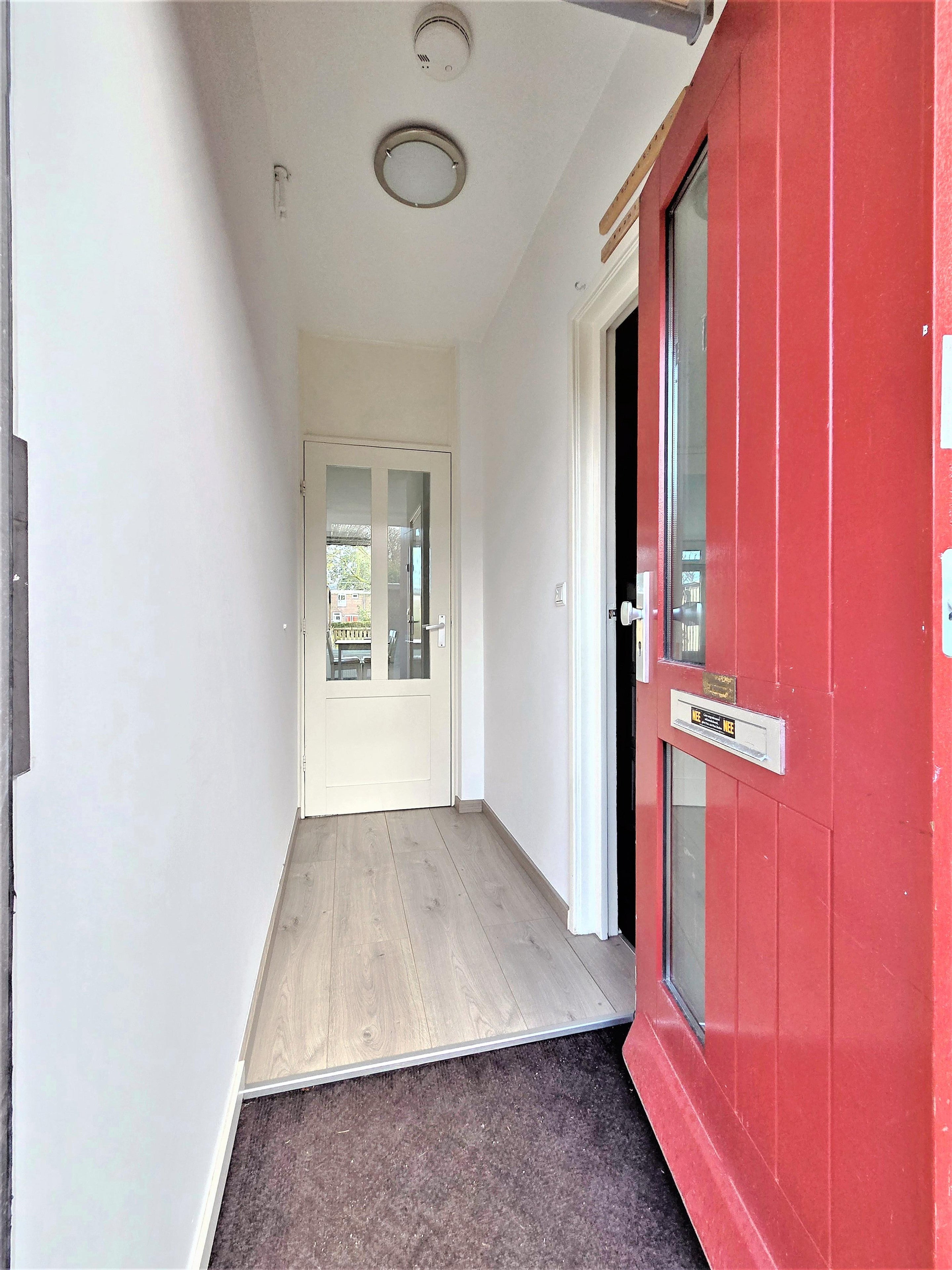 Via de voordeur bereik je de hal, met direct toegang tot een handige (opslag)ruimte en een eerste separate wc. De doorzonwoonkamer ligt aan de achterzijde en biedt toegang tot de verzorgde achtertuin van circa 45 m². Aan de voorzijde bevindt zich de relatief nieuwe open keuken, compleet met inbouwapparatuur en wasmachine. Onder de trap vind je nog een afgesloten bergkast.