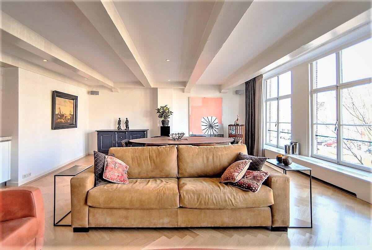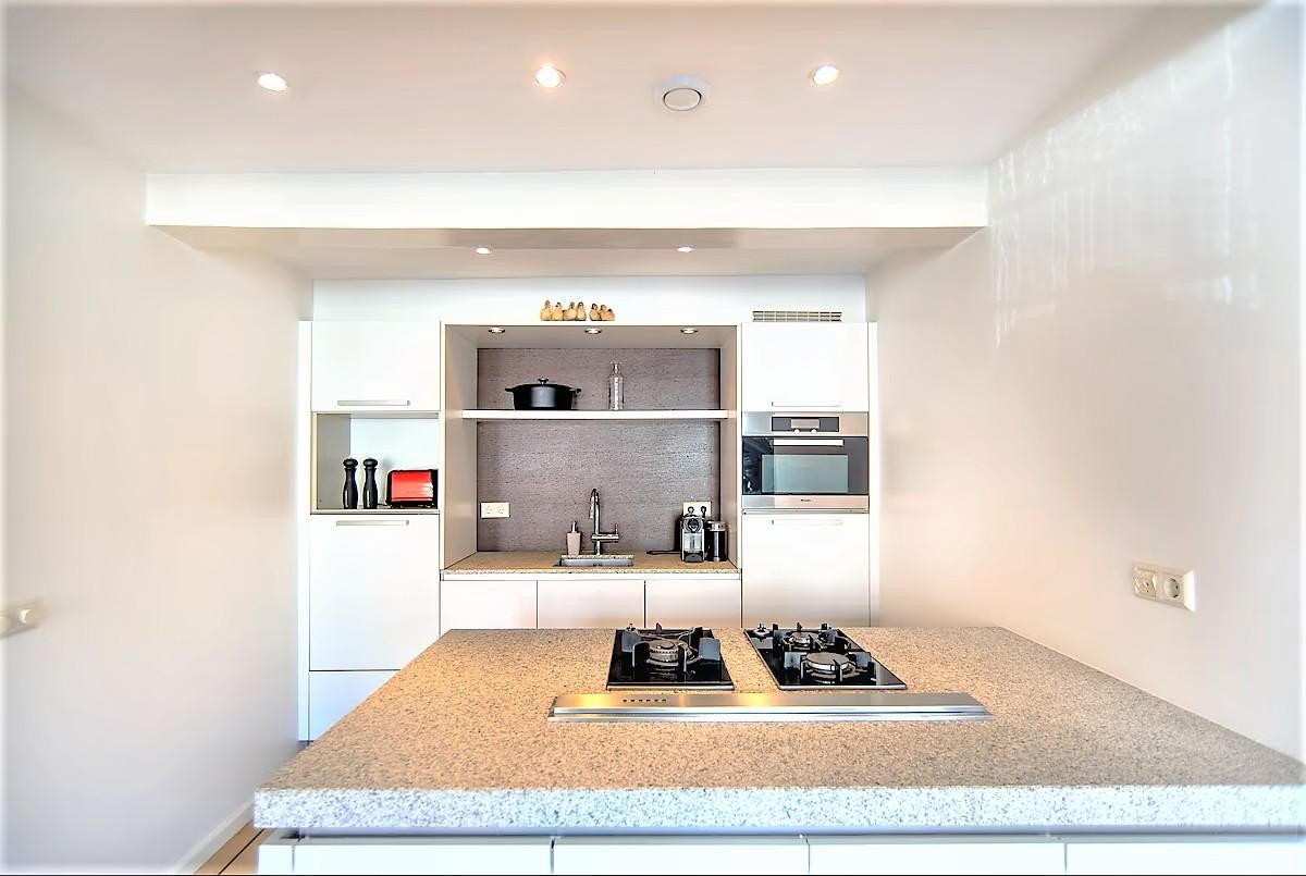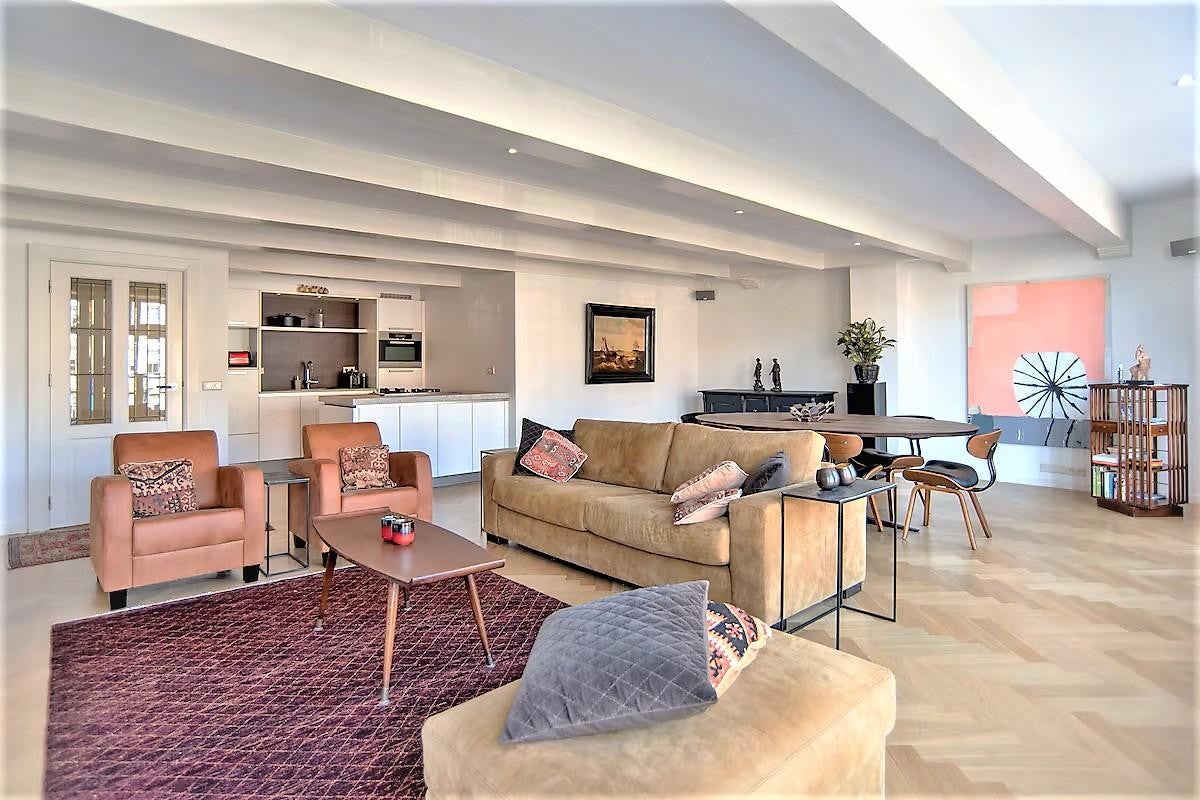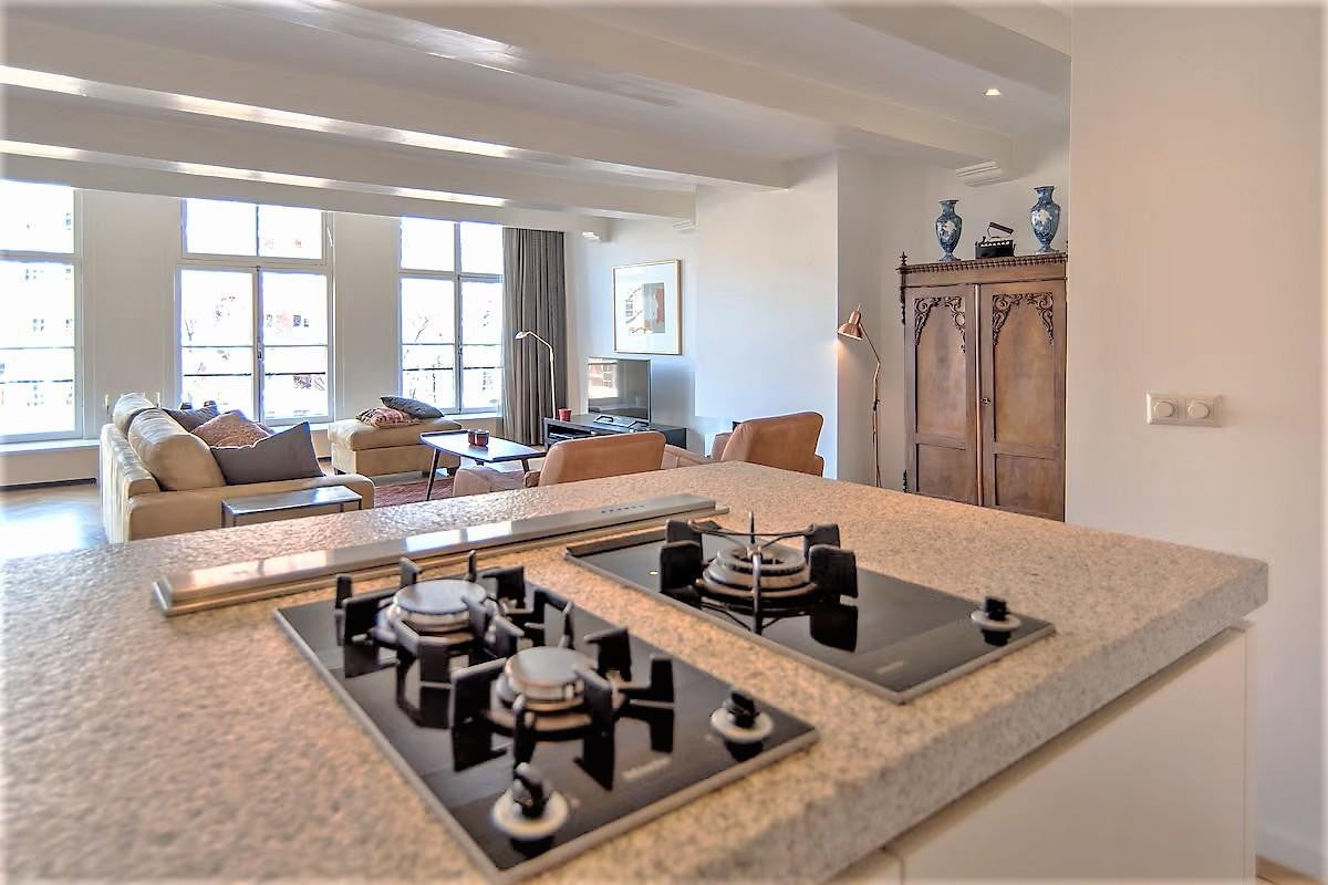 De voordeur van het appartement opent naar een ruime hal die toegang geeft tot alle vertrekken. Aan de voorzijde ligt de royale woonkamer met maar liefst vier ramen die een prachtig uitzicht bieden over de gracht. Aansluitend bevindt zich de moderne open keuken van Miele, voorzien van diverse inbouwapparatuur.