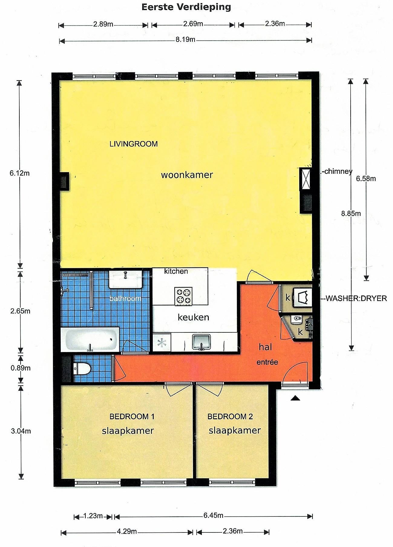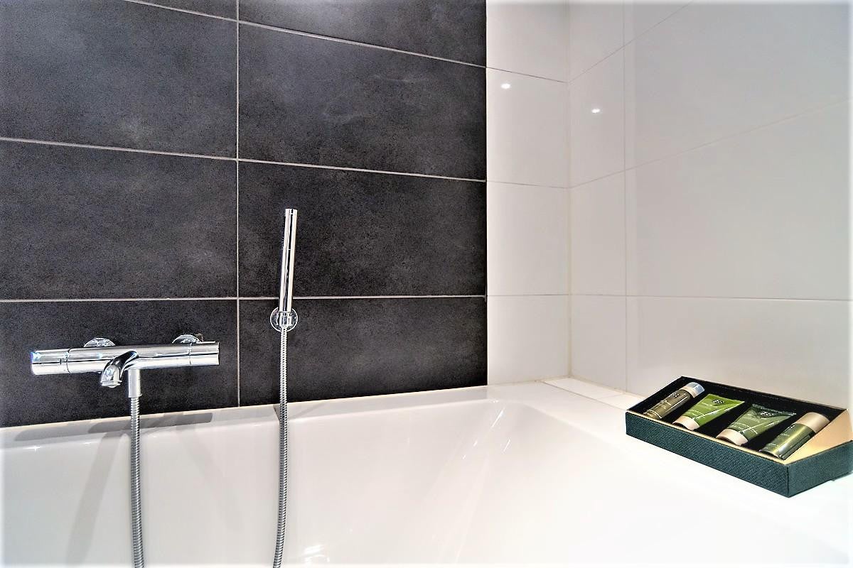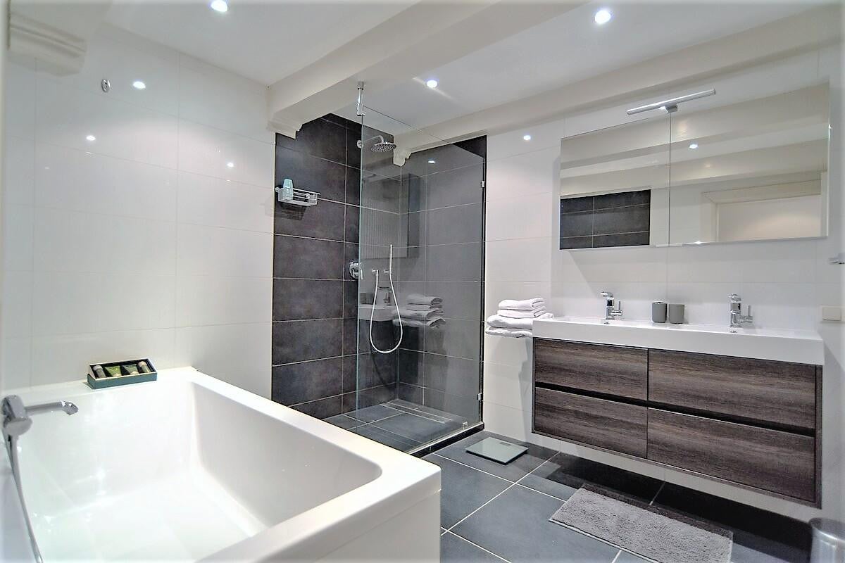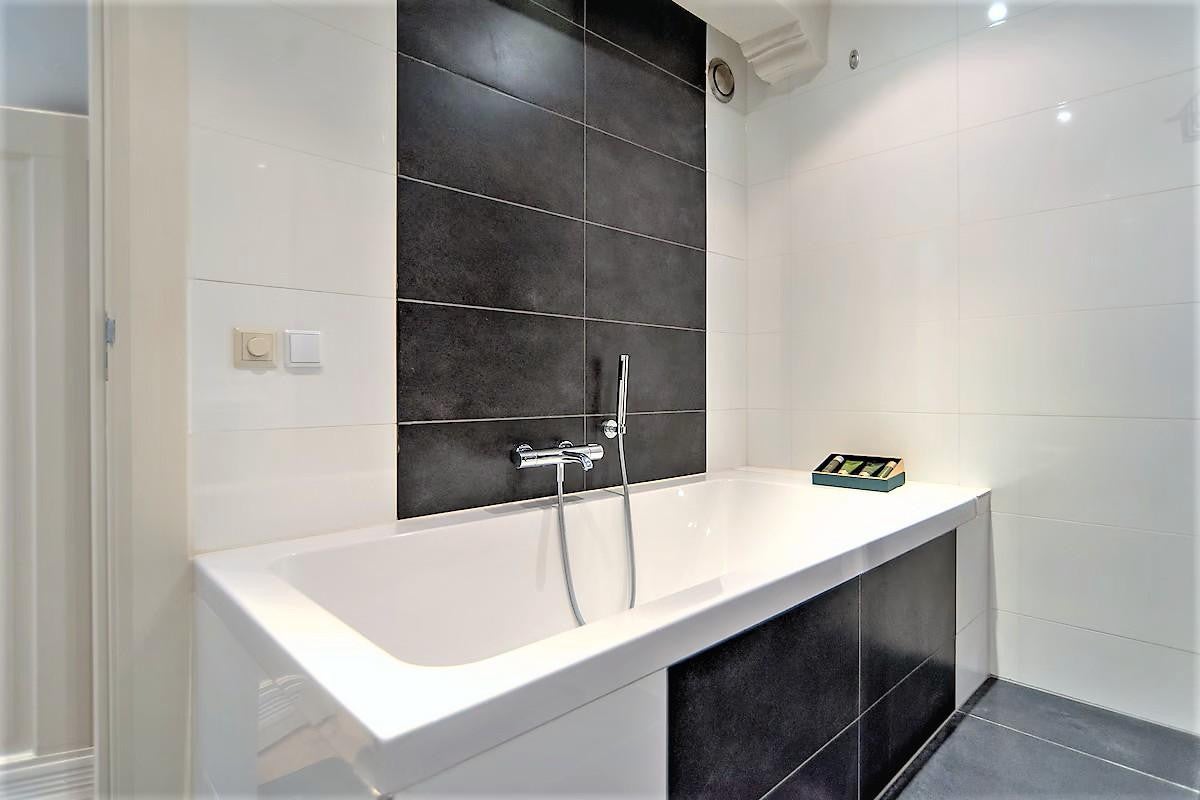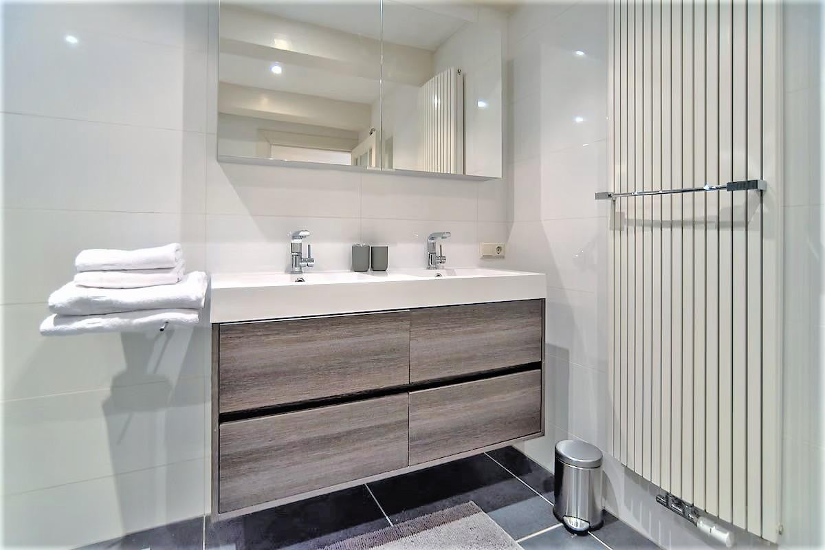 Verder beschikt het appartement over twee slaapkamers (waarvan één ruime hoofdslaapkamer en één kleinere slaapkamer), een separaat toilet en een recent vernieuwde badkamer met een royaal ligbad, inloopdouche en dubbele wastafel. In de gang bevindt zich bovendien een aparte kast met was-droogcombinatie.