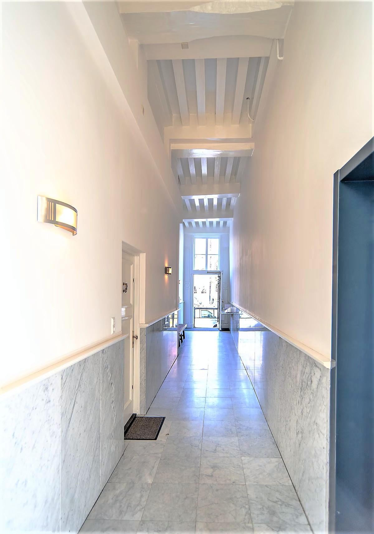 Entree via de klassieke stoep naar de monumentale hal met marmeren afwerking, die toegang biedt tot zowel het trappenhuis als de lift naar de eerste verdieping. Achter in de hal bevindt zich de toegang tot de sfeervolle gezamenlijke binnentuin.
