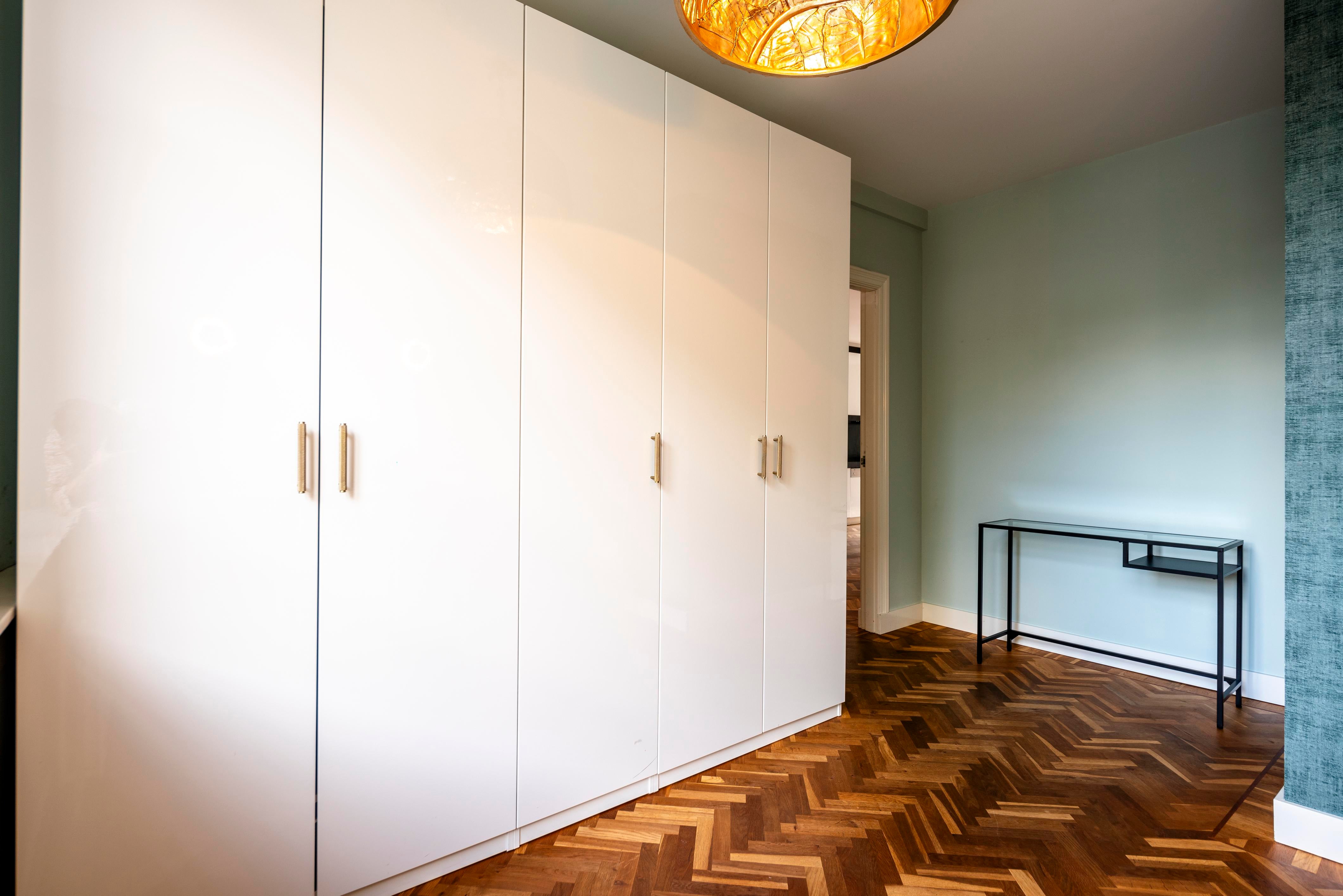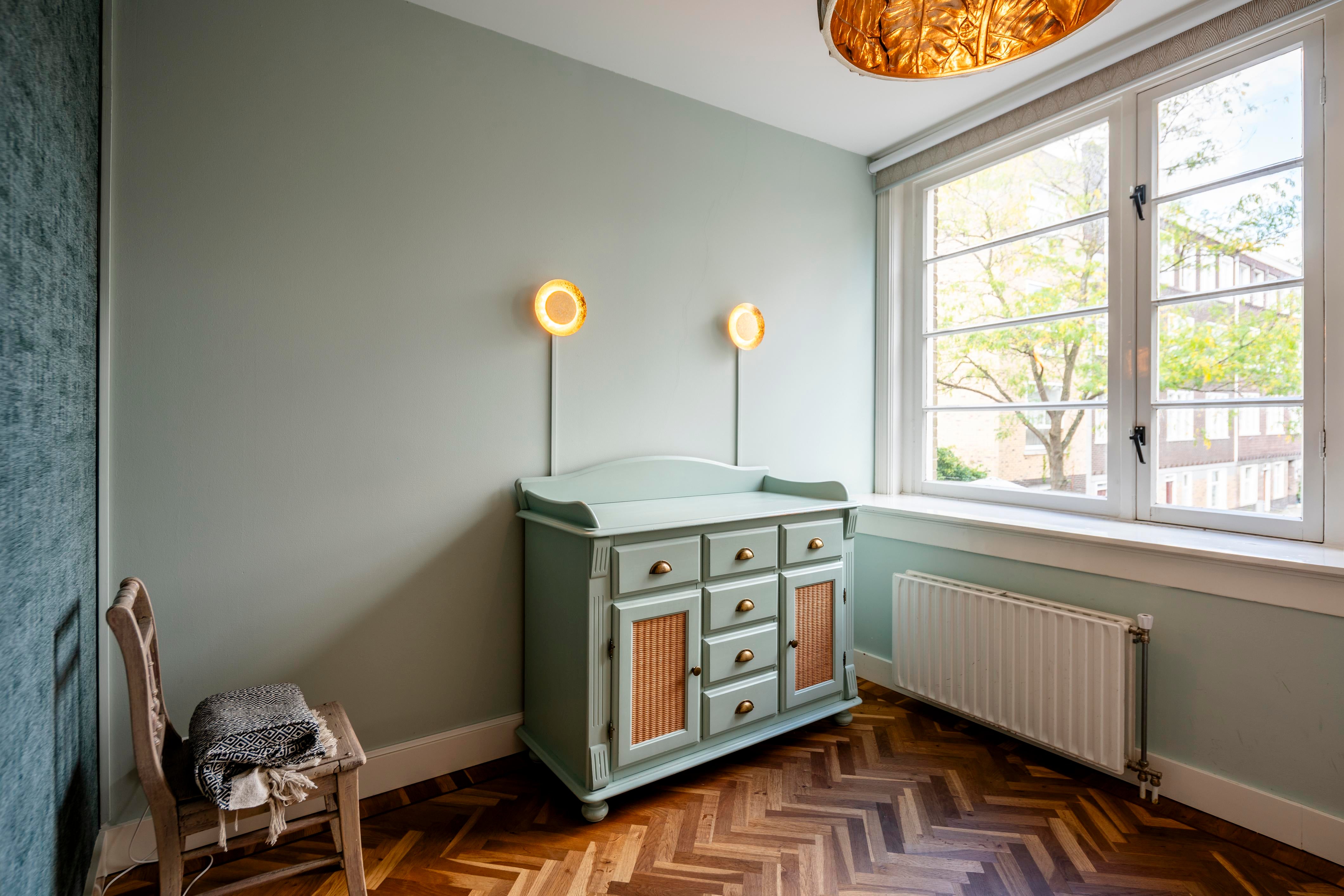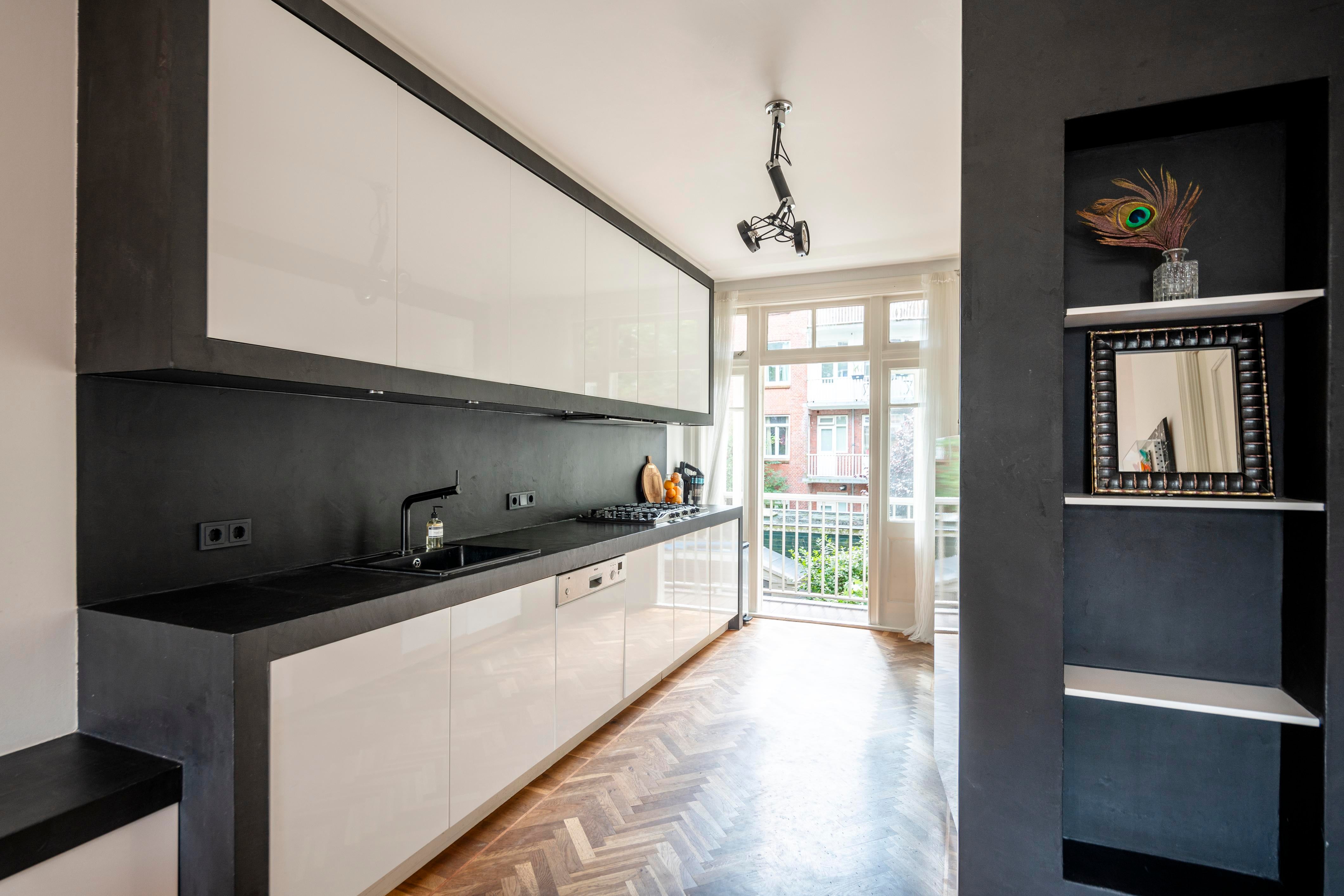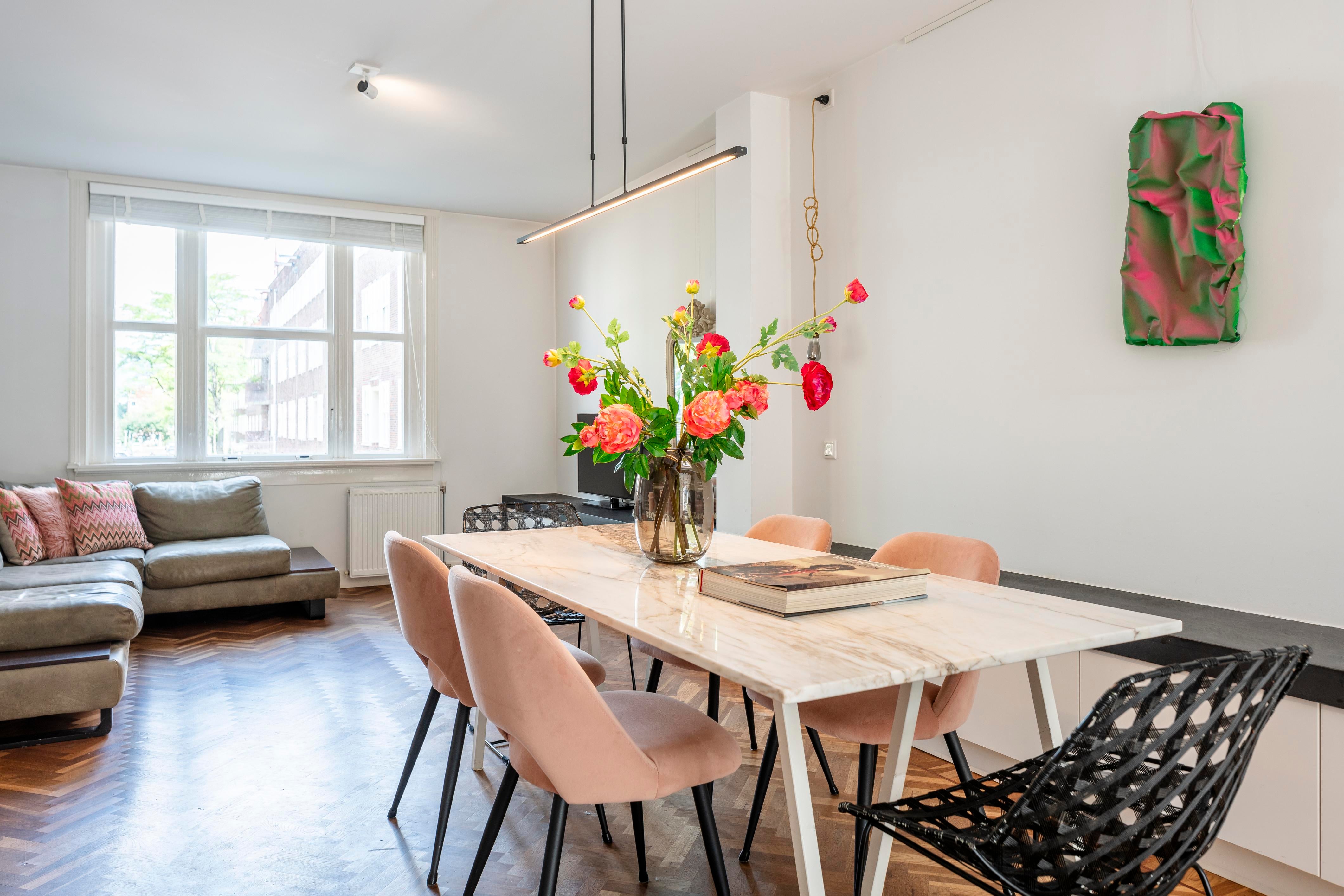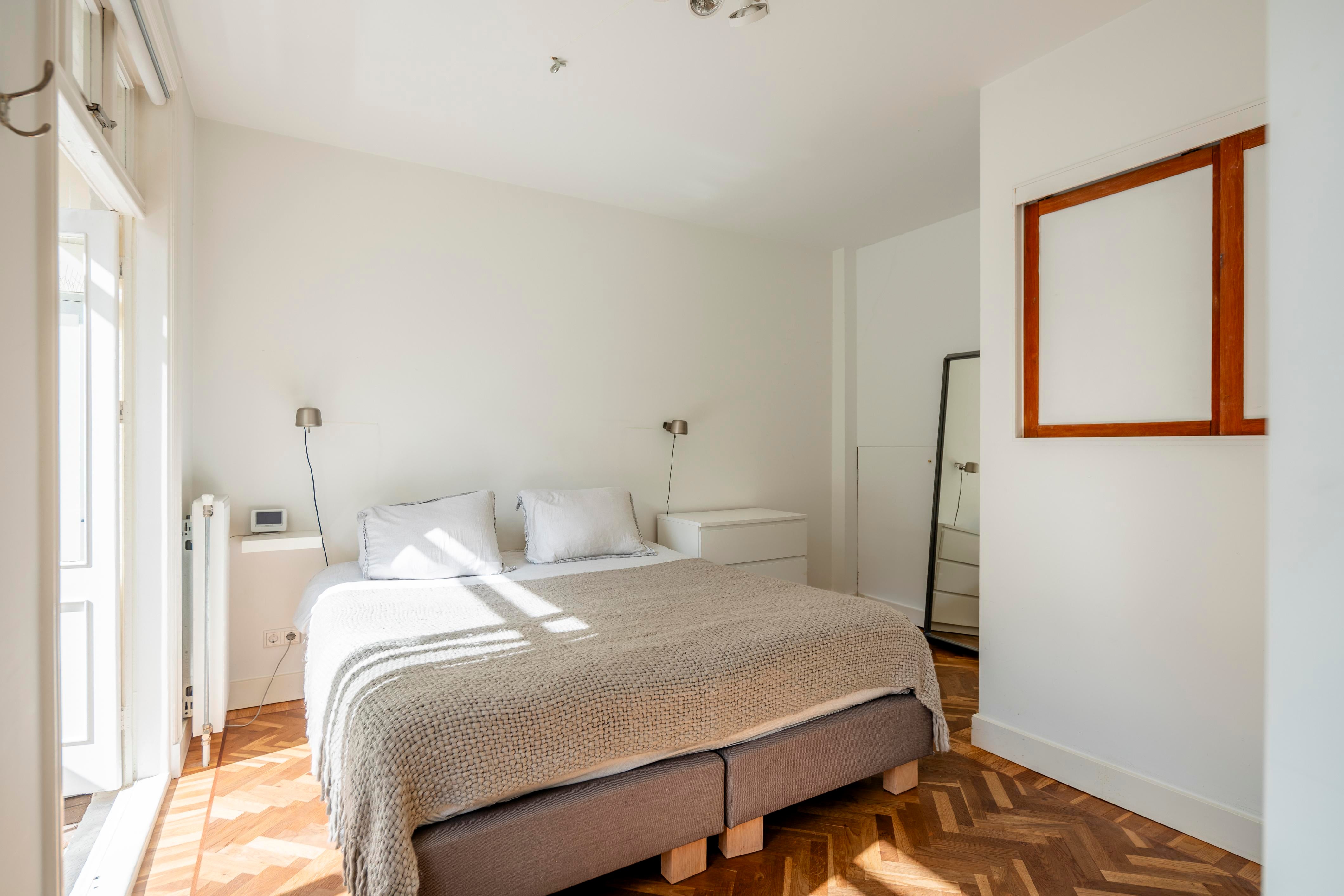 On the first floor the private entrance features a herring bone oak wooden floor and wardrobe space. The living room is bright and spacious and has an open modern kitchen. The kitchen is equipped with modern built-in appliances such as a gas stove, oven, microwave and dishwasher. The modern bathroom has natural stone tiles and features a bathtub and separate shower. The apartment has two well-proportioned bedrooms (one main bedroom and a second bedroom NB current situation is a double bed, this bed is not in the pictures), is cleverly designed to make optimal use of the space and offers loads of build-in cabinet space.