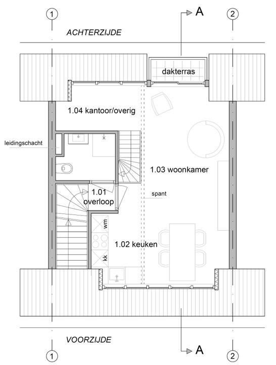 Indeling: woonkamer met open keuken, slaapgelegenheid op mezzanine, werkhoek, badkamer, balkon. Totale woonoppervlakte 40.9 m2.