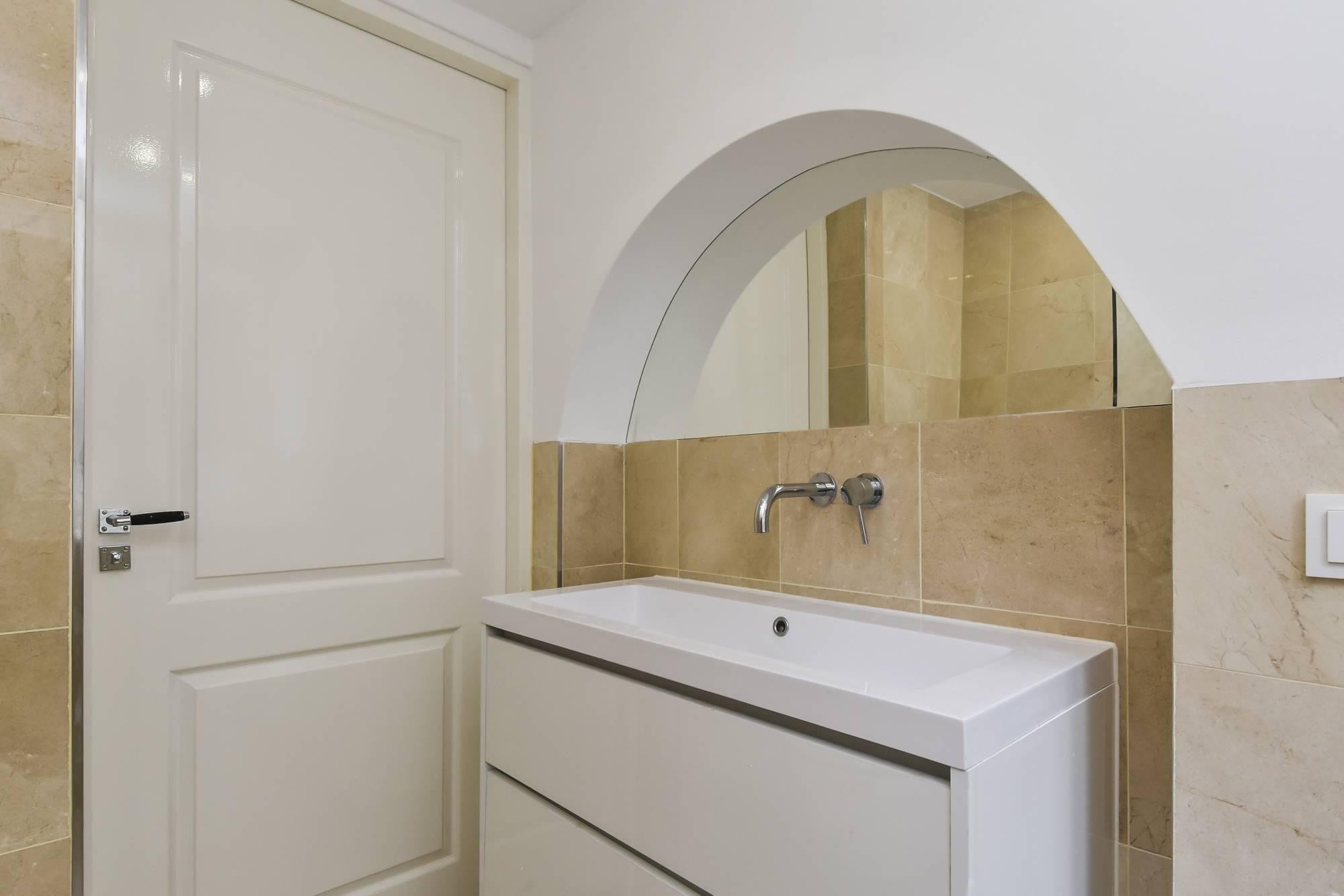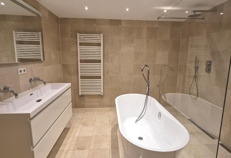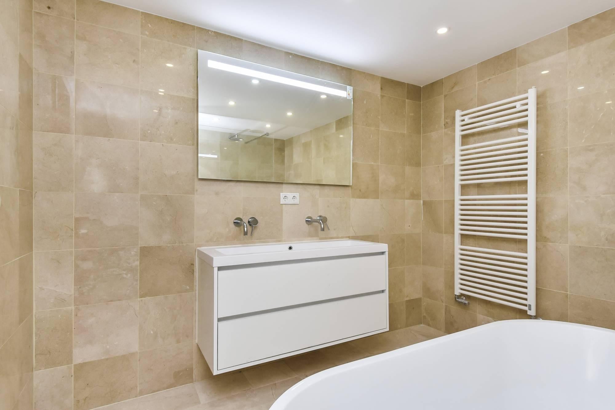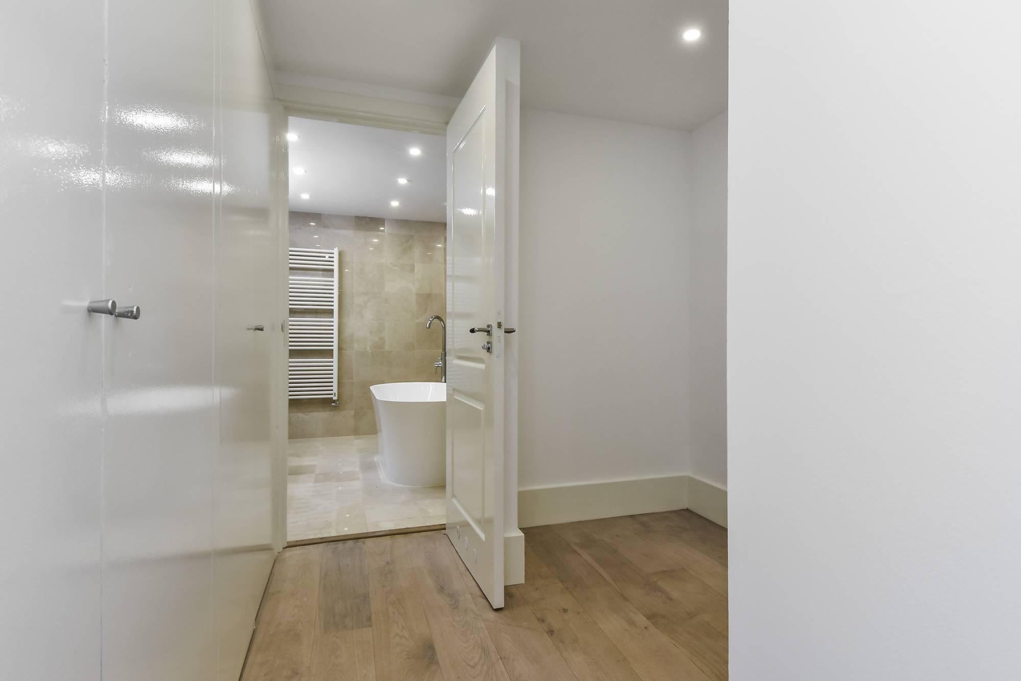 Stair to the “souterrain” Spacious hall with access to the toilet with sink. Luxurious modern bathroom which is provided with a walk-in shower, double sink, and towel radiator. The master bedroom with a walk-in closet approx. is situated on the front. 2nd modern bathroom which is provided with a walk-in shower, separate bathtub, double sink, and towel radiator. 2nd bedroom with a walk-in closet and opening doors to the garden situated on the back. 3rd bedroom also situated on the back.