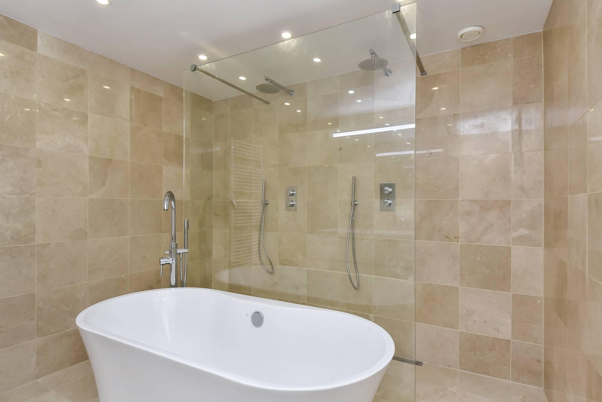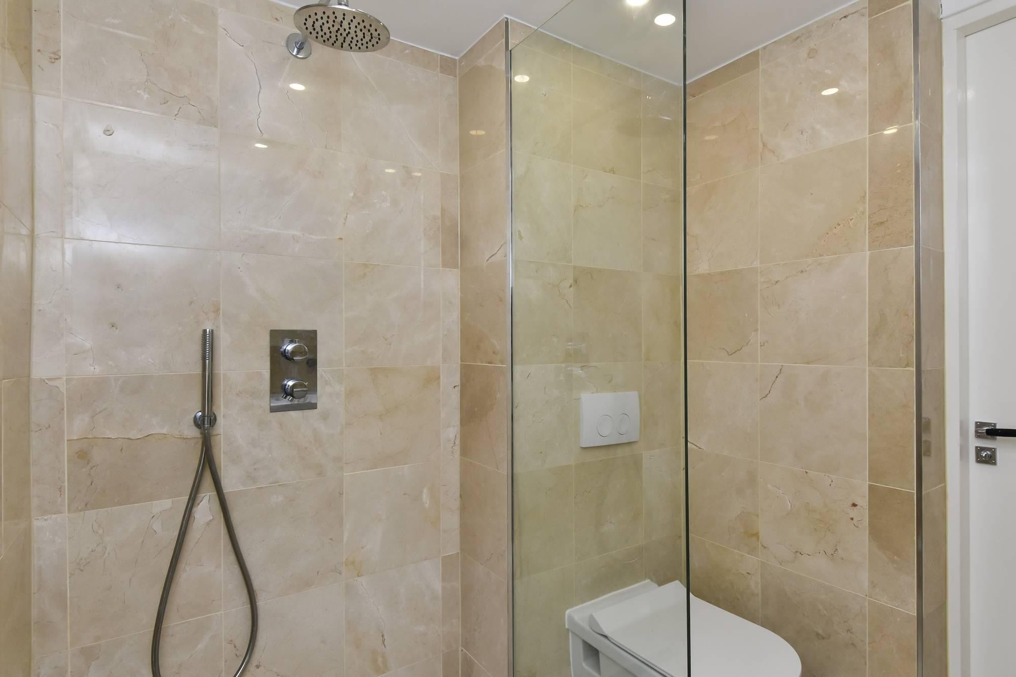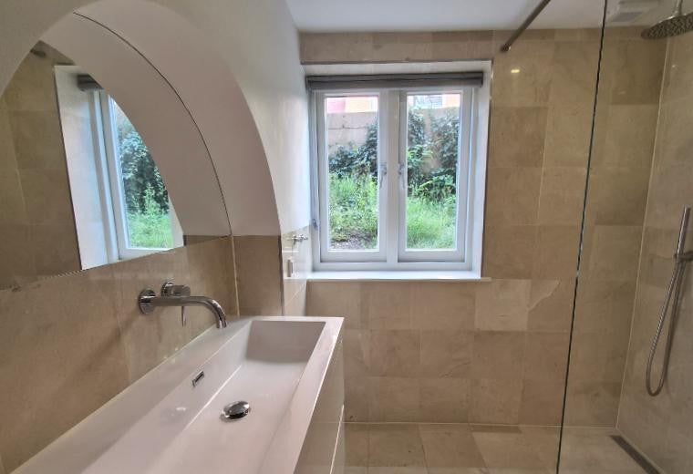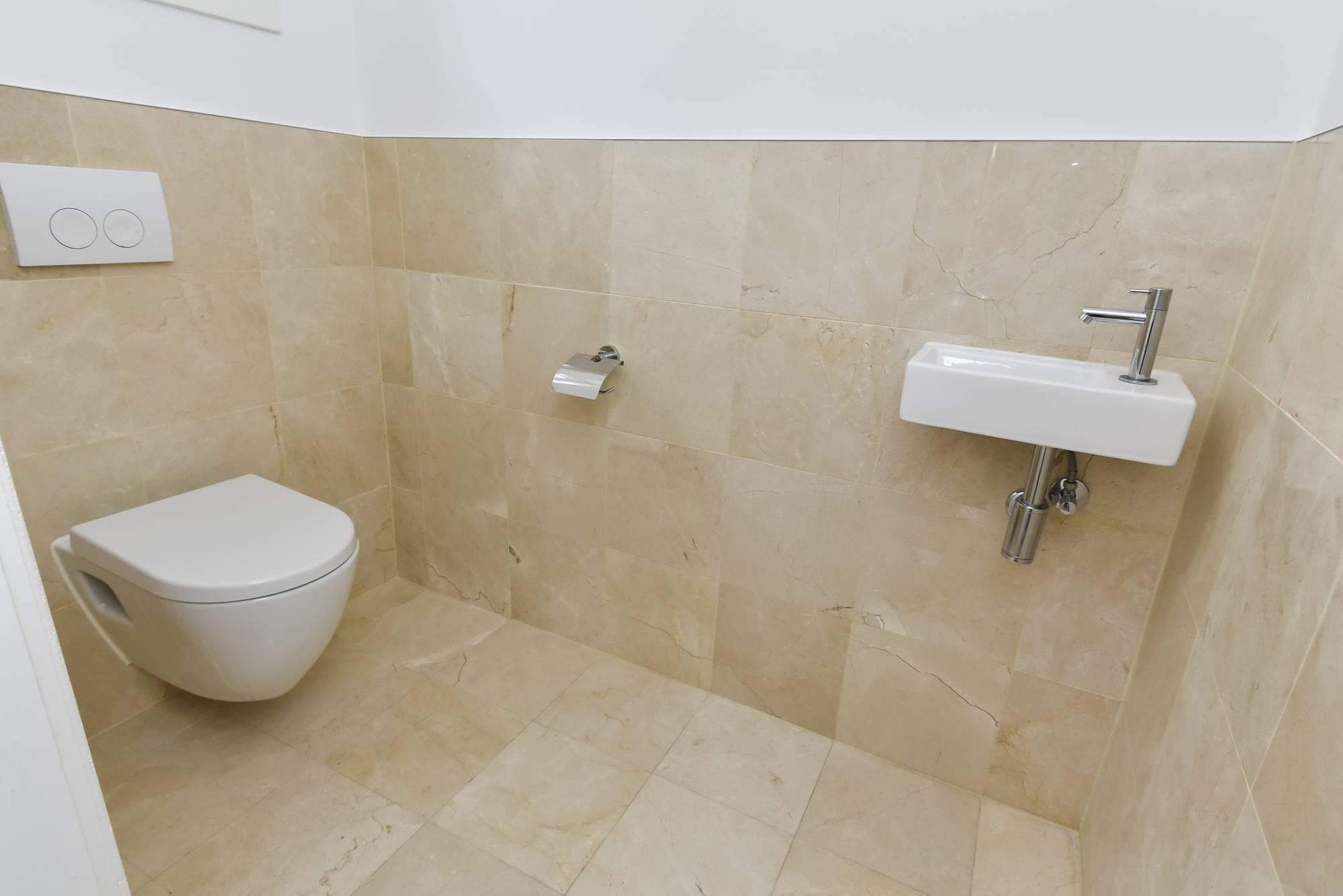 Stair to the “souterrain” Spacious hall with access to the toilet with sink. Luxurious modern bathroom which is provided with a walk-in shower, double sink, and towel radiator. The master bedroom with a walk-in closet approx. is situated on the front. 2nd modern bathroom which is provided with a walk-in shower, separate bathtub, double sink, and towel radiator. 2nd bedroom with a walk-in closet and opening doors to the garden situated on the back. 3rd bedroom also situated on the back.