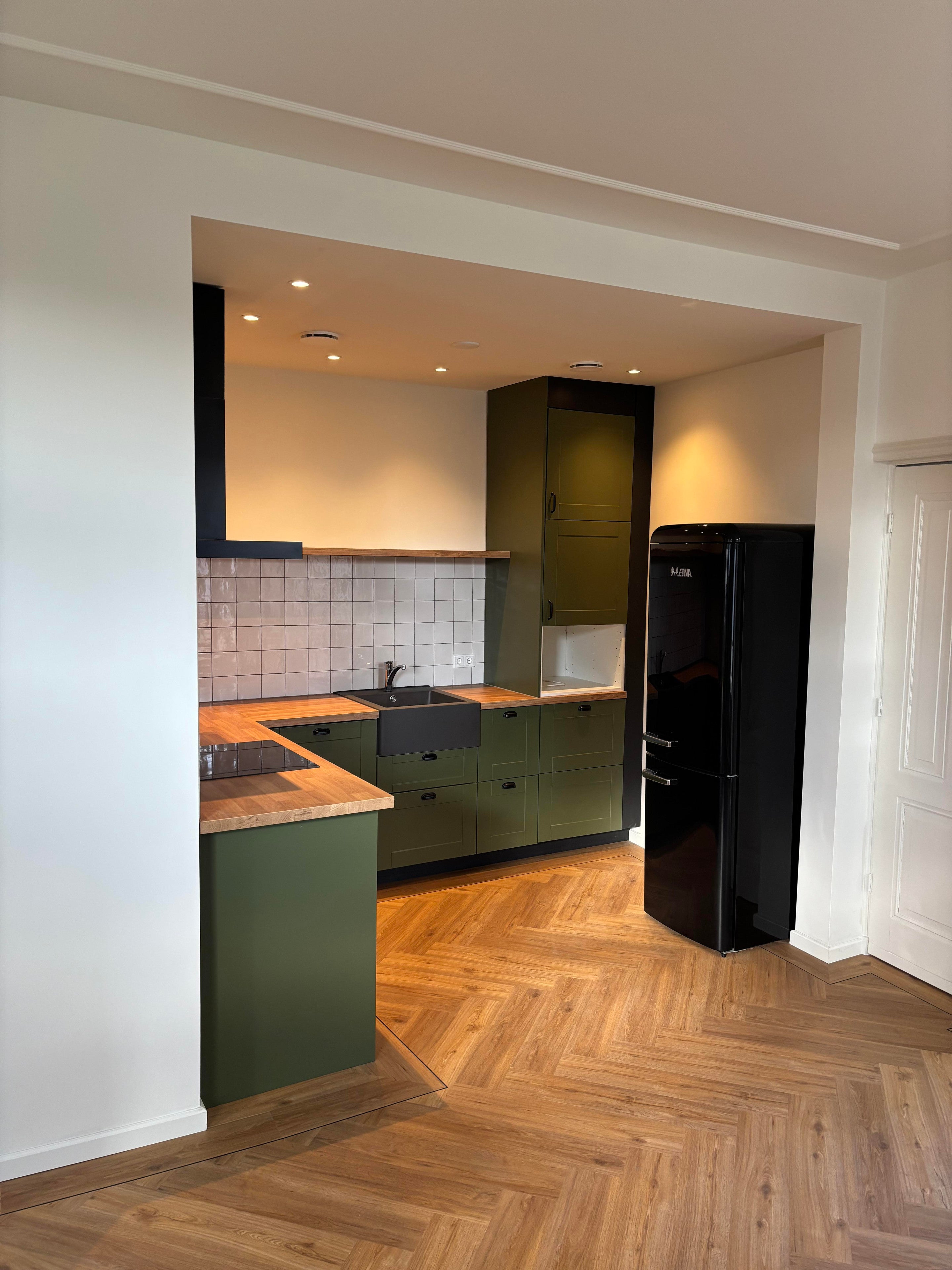 - Grote woonkamer met luxe open keuken met o.a. design koelkast, oven, magnetron, vaatwasser en inductiekookplaat
